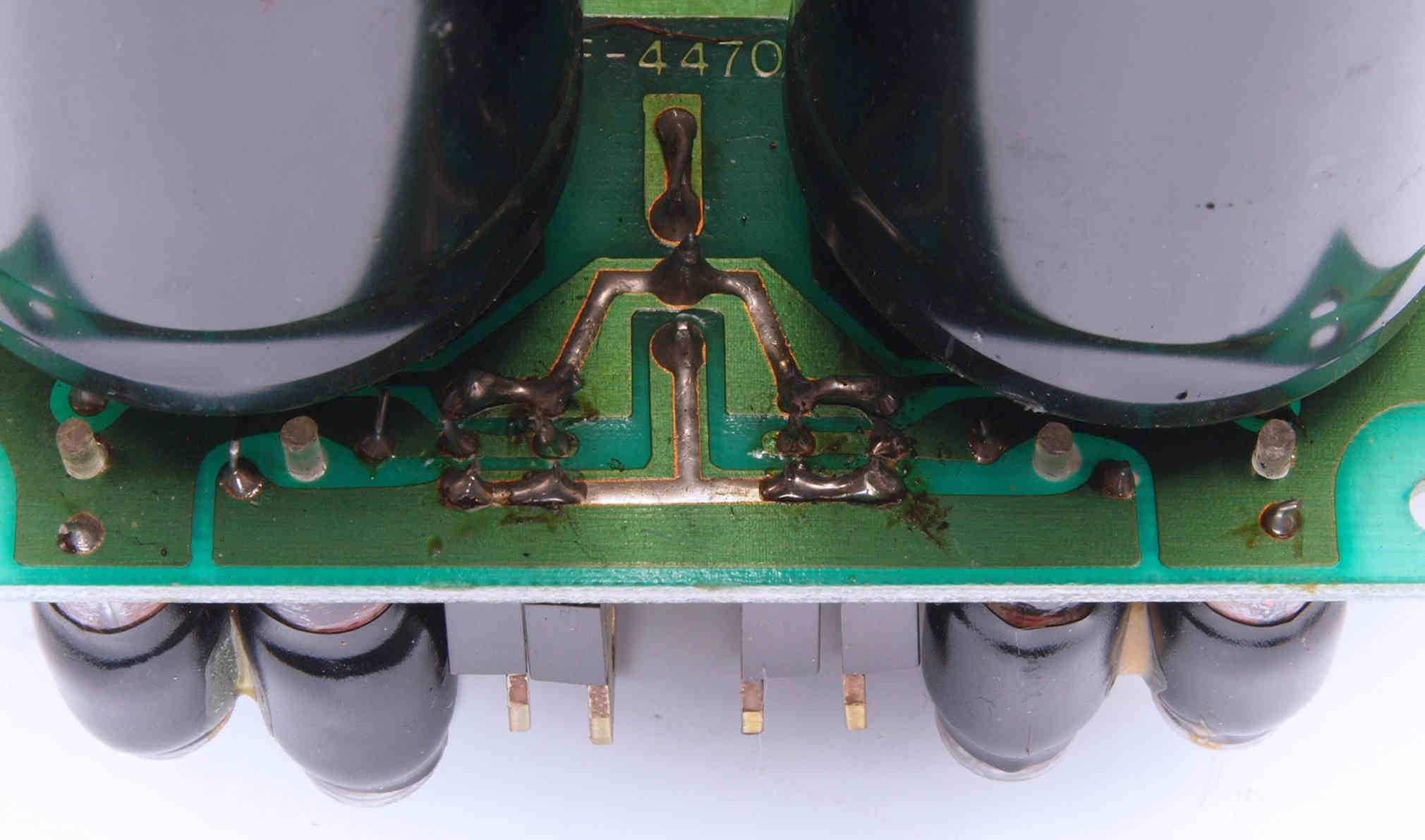 C512. 修理中 R側EQ−AMP、 電解コンデンサー固定用の接着材、当時は溶媒にトルエンが使用されており、銅を腐食する。