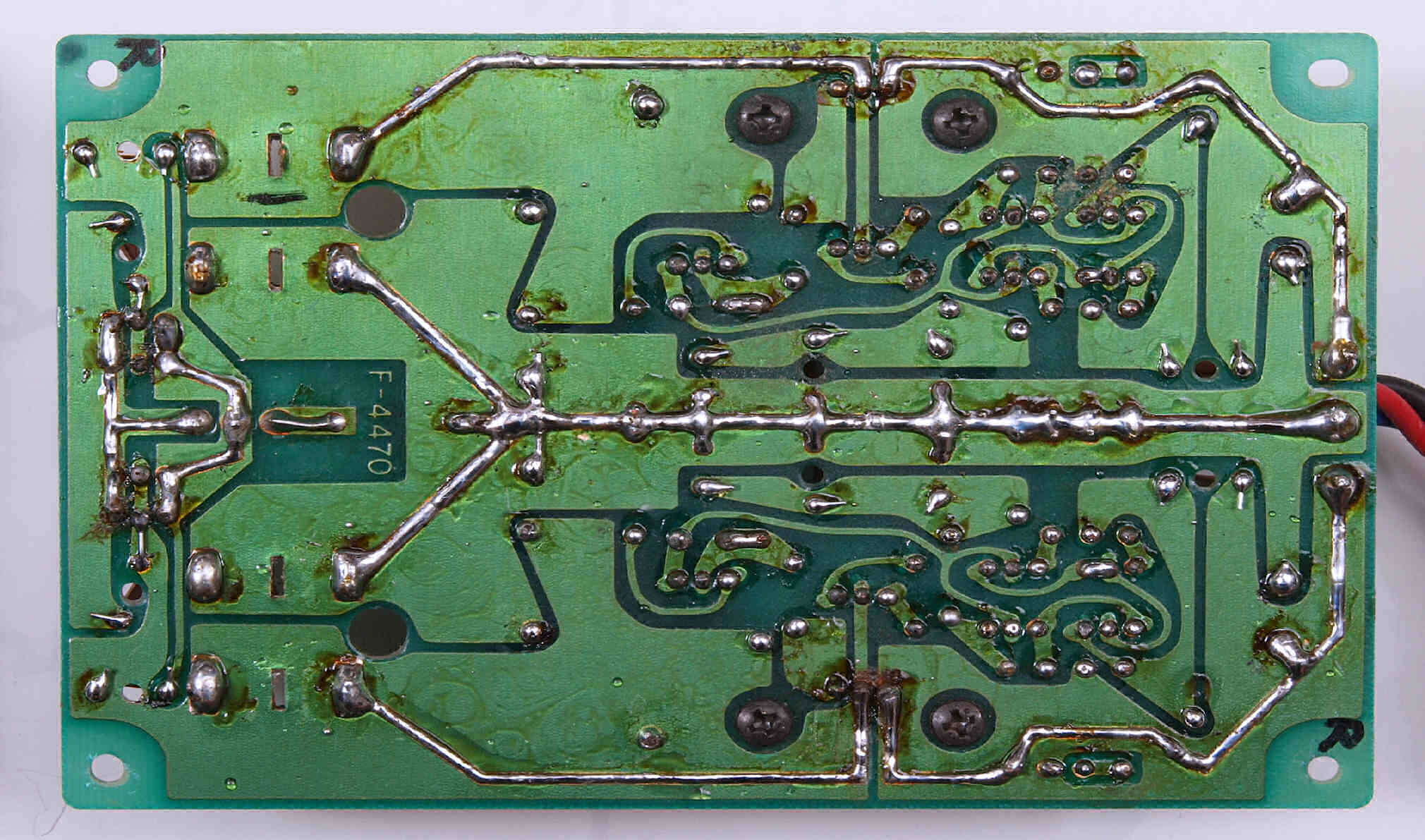 | C412. 修理中 R側AMP基板、 電解コンデンサー固定用の接着材、当時は溶媒にトルエンが使用されており、銅を腐食する。 | ||||||||||||||||||