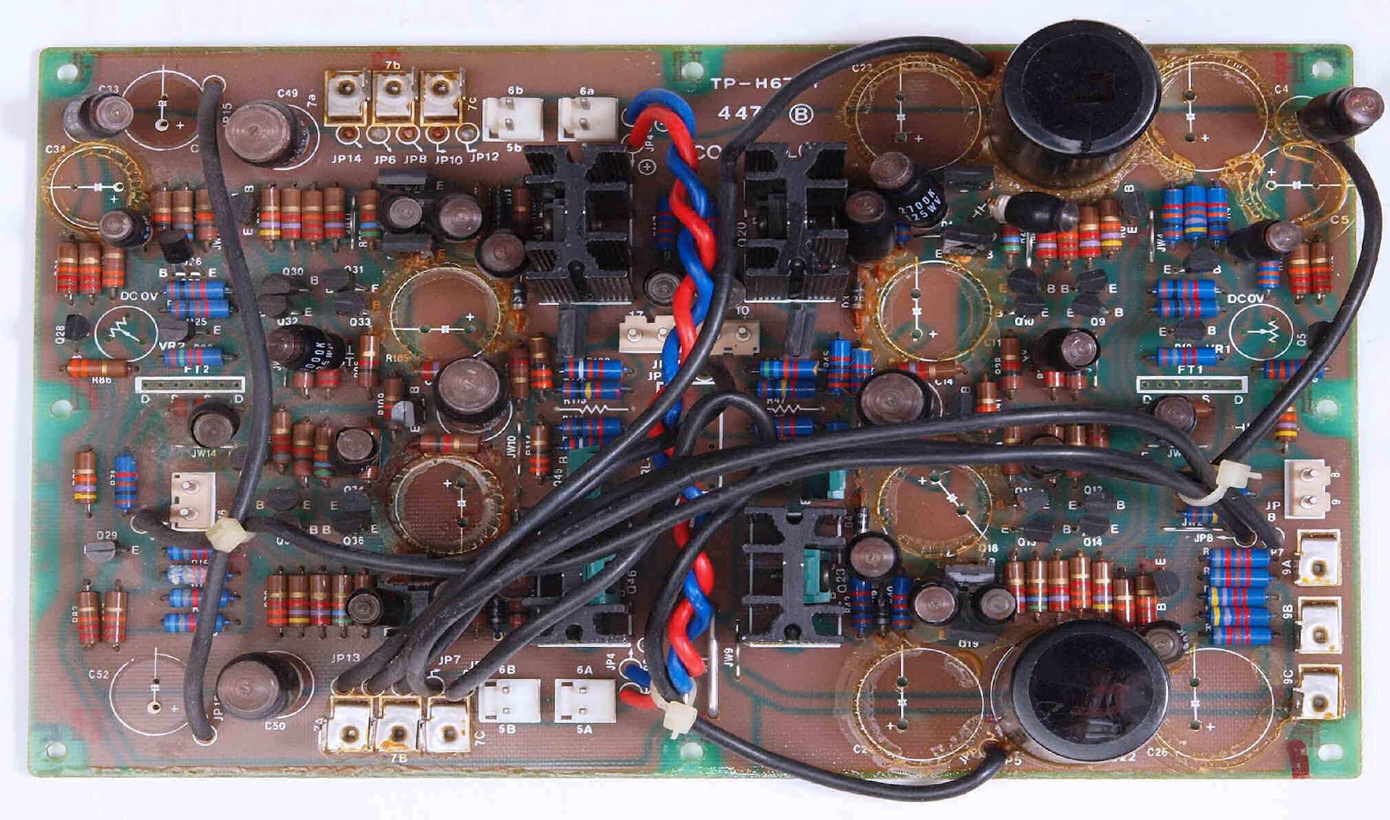 | C42. 修理後 L側AMP基板 初段FET(電界効果トランジスター)2個、半固定VR2個、電解コンデンサー13個、リレー1個交換 | ||||||||||||||||||