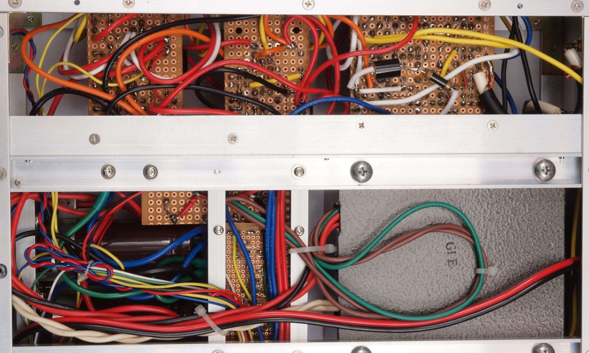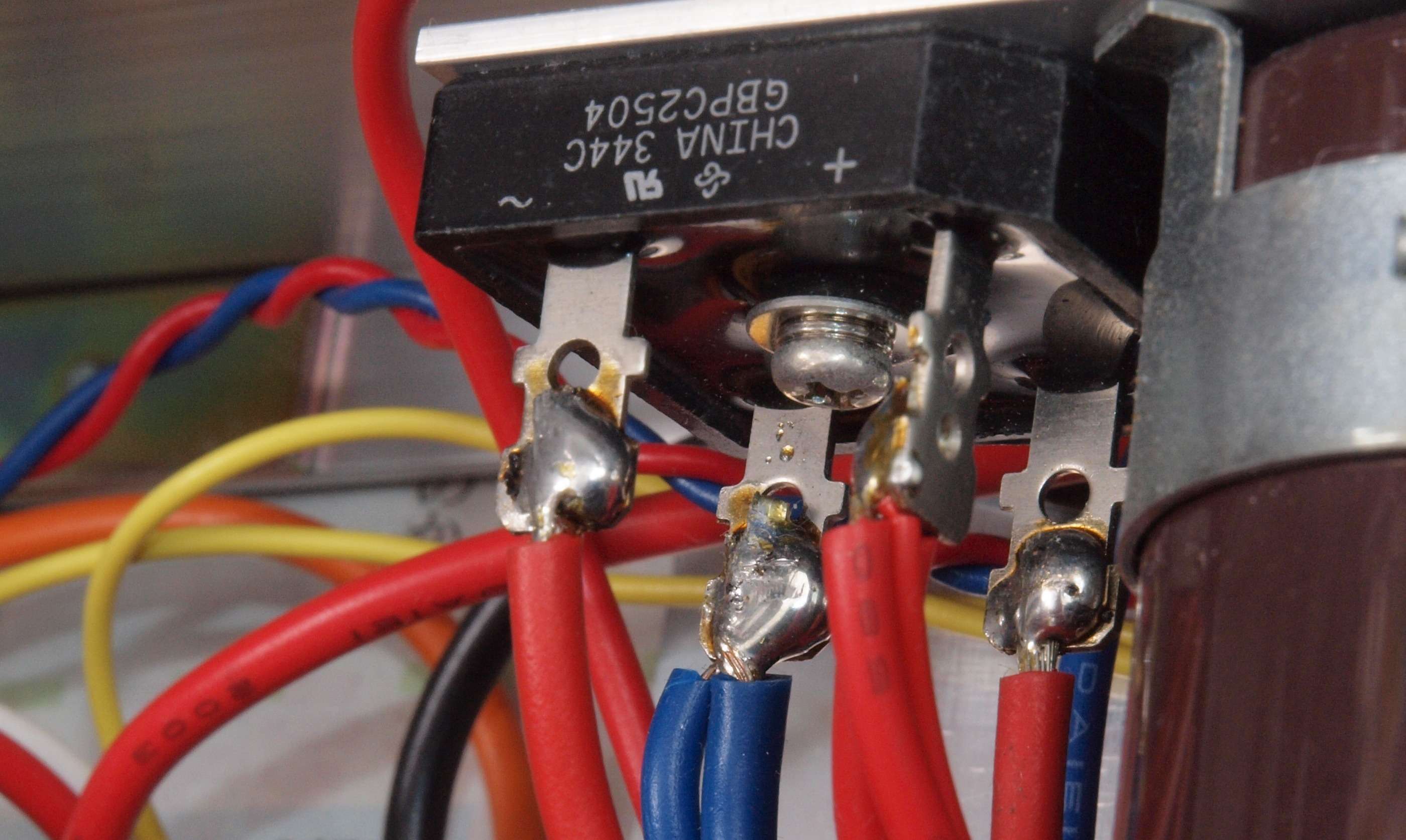| A71. 点検中 配線のハンダ付け。 プロの絡げ配線とは異なる、又端子の裏側までハンダが載っていない。 |