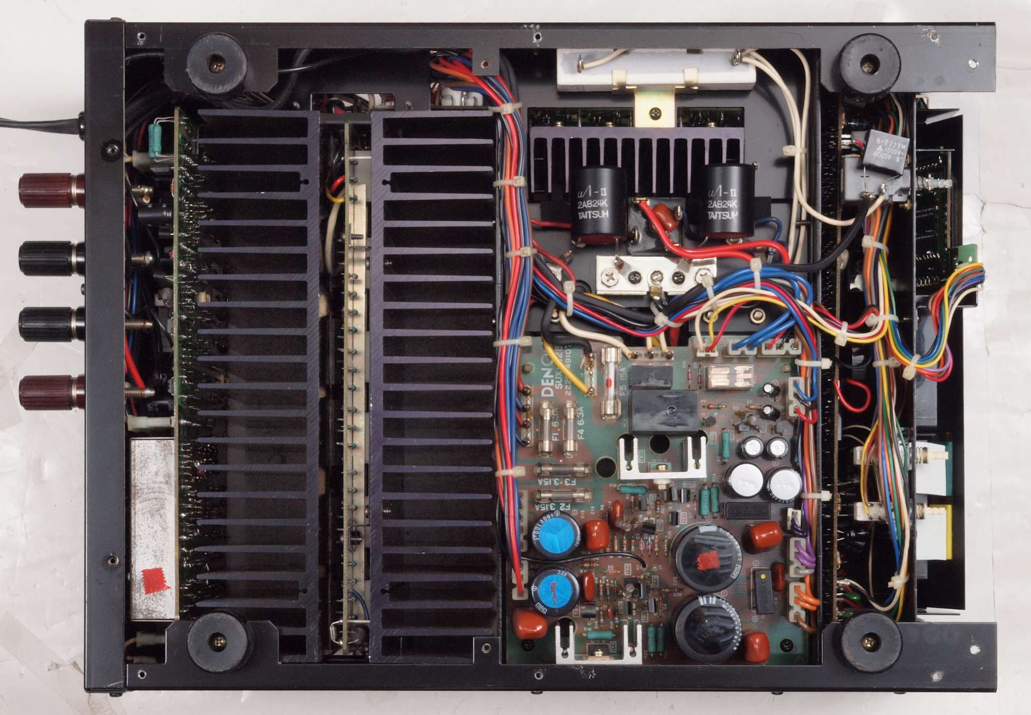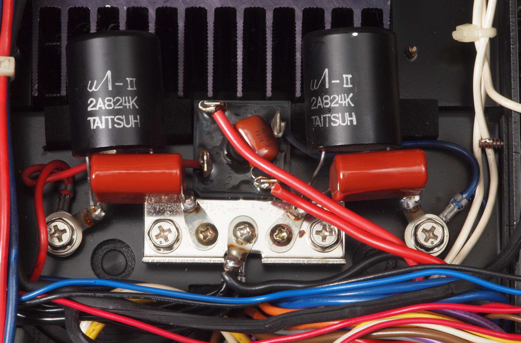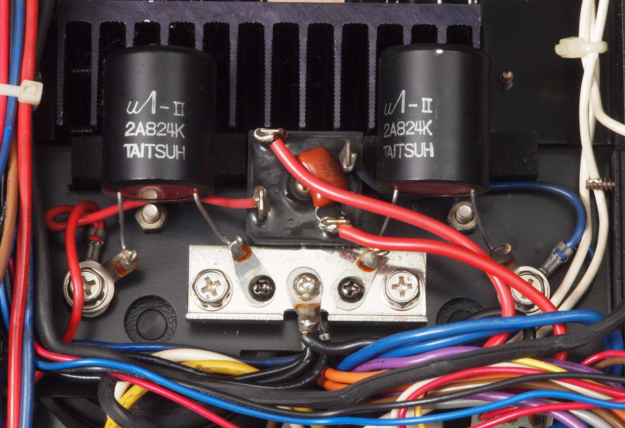 | CB2. 修理後 電源ブロック電解コンデンサー下配線。 フイルムコンデンサー2個追加。 フイルムコンデンサー取付ビスは塗装ビスからメッキビスに交換する。 |