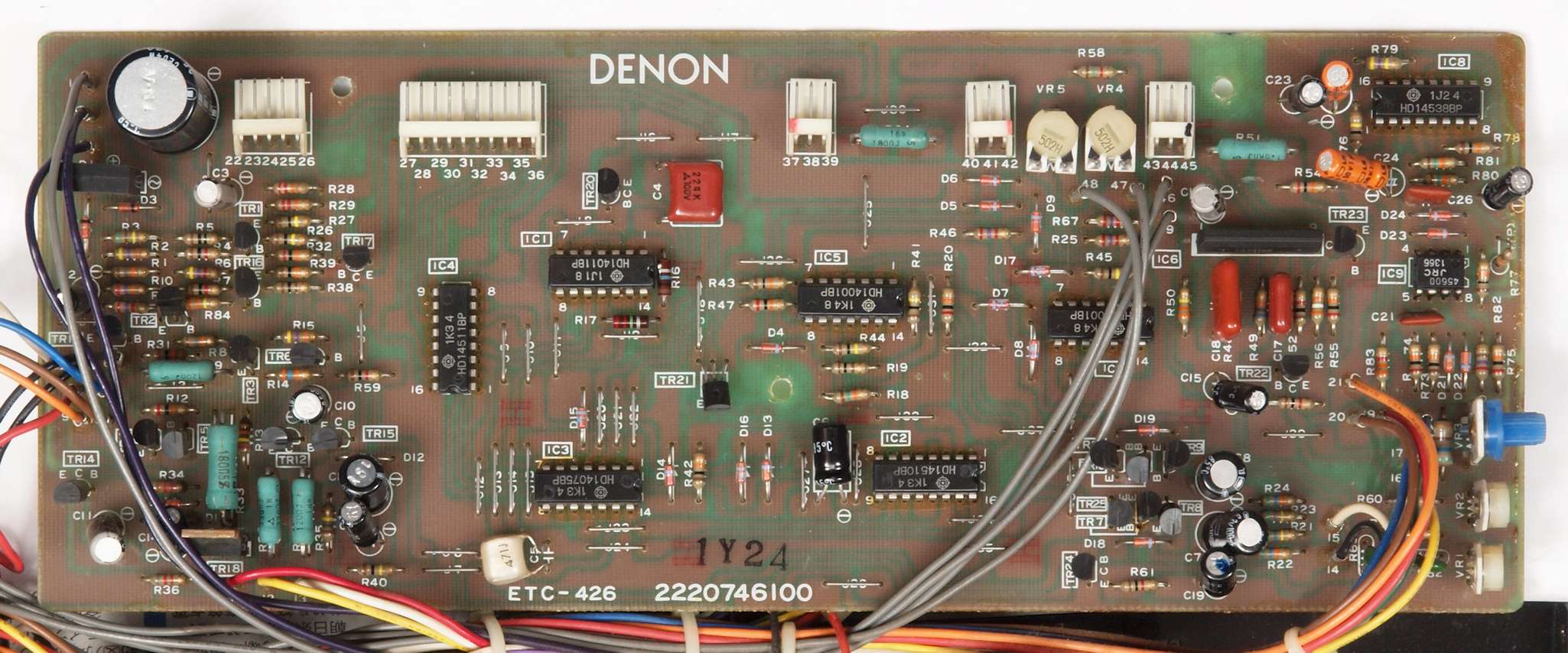 | C23. 修理後 ドライブAMP基板。 半固定VR3個、電解コンデンサー個21、TR(トランジスター)2個、OP−AMP6個交換。 |