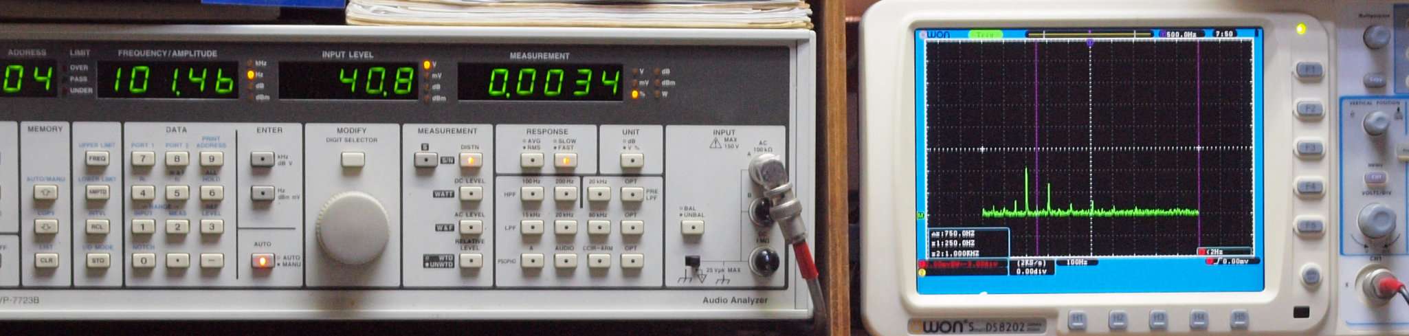 | E. 測定・調整。 画像をクリックすると、大きく(横幅2050ドット)表示されます。 E0. 出力・歪み率測定・調整 「見方」。 中..SP出力を「Audio Analyzer Panasonic VP−7723B」により測定。 表示LED、 左端=メモリーNo、 中左=周波数測定、 中右=出力電圧測定、 右端=歪み率測定。 右..VP−7723Bの基本波除去出力を「owon SDS6062(200MHZ)」で「FFT分析」表示。 左..オーディオ発振器 VP−7201A より50Hz〜100kHzの信号を出し(歪み率=約0.003%)、ATT+分配器を通し、AMPに入力。 よって、ダイアル設定出力レベルより低くなります。測定機器の仕様や整備の様子はこちら、「VP−7723B」「VP−7201A」。 FFT画面の見方はこちら。 |