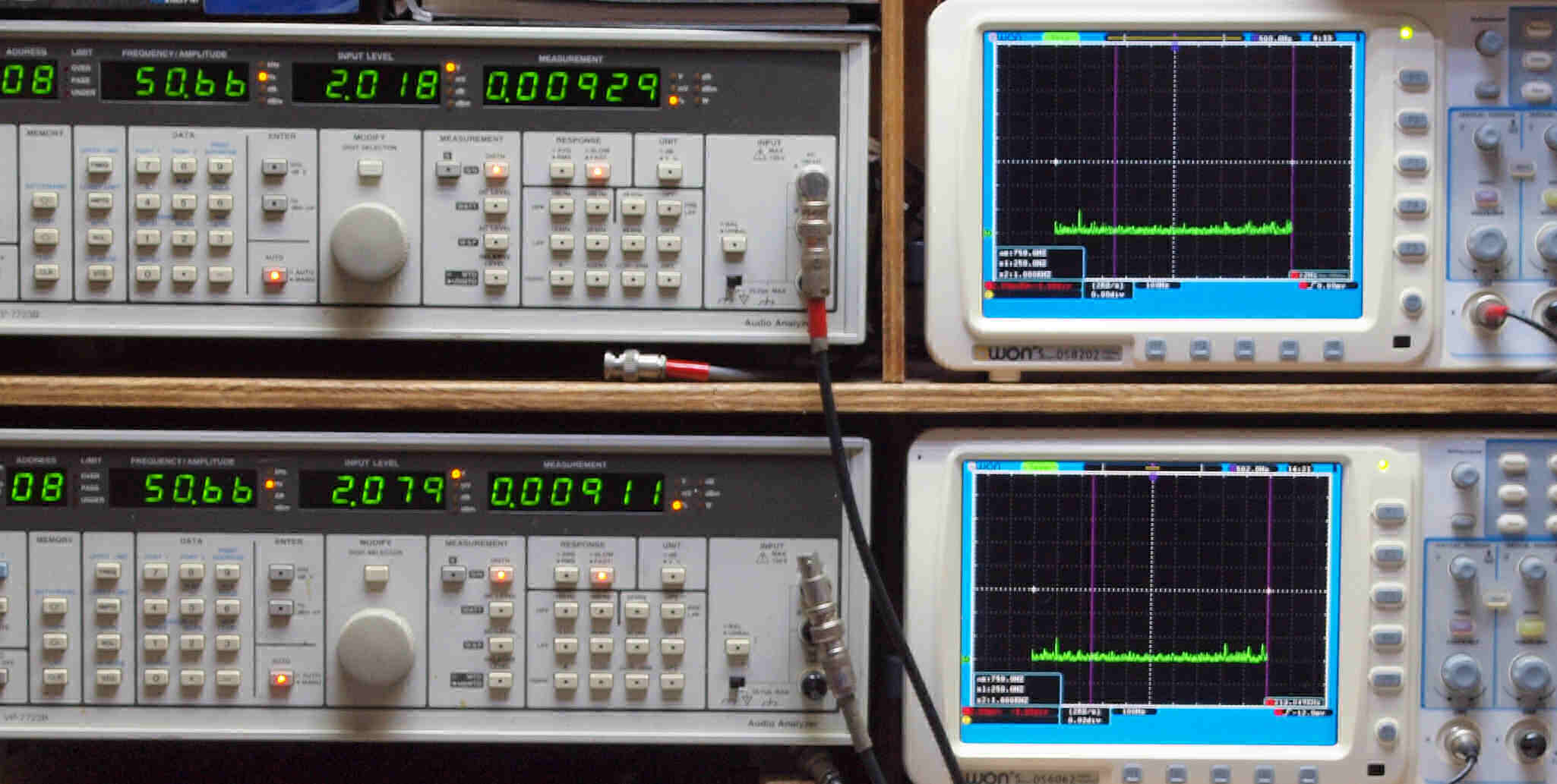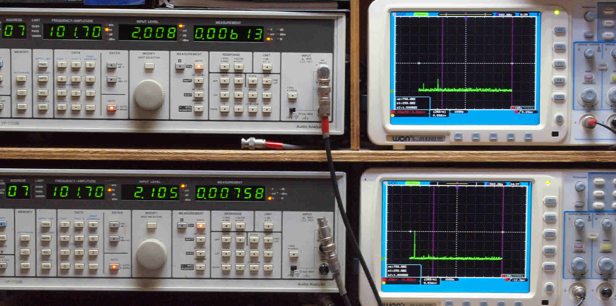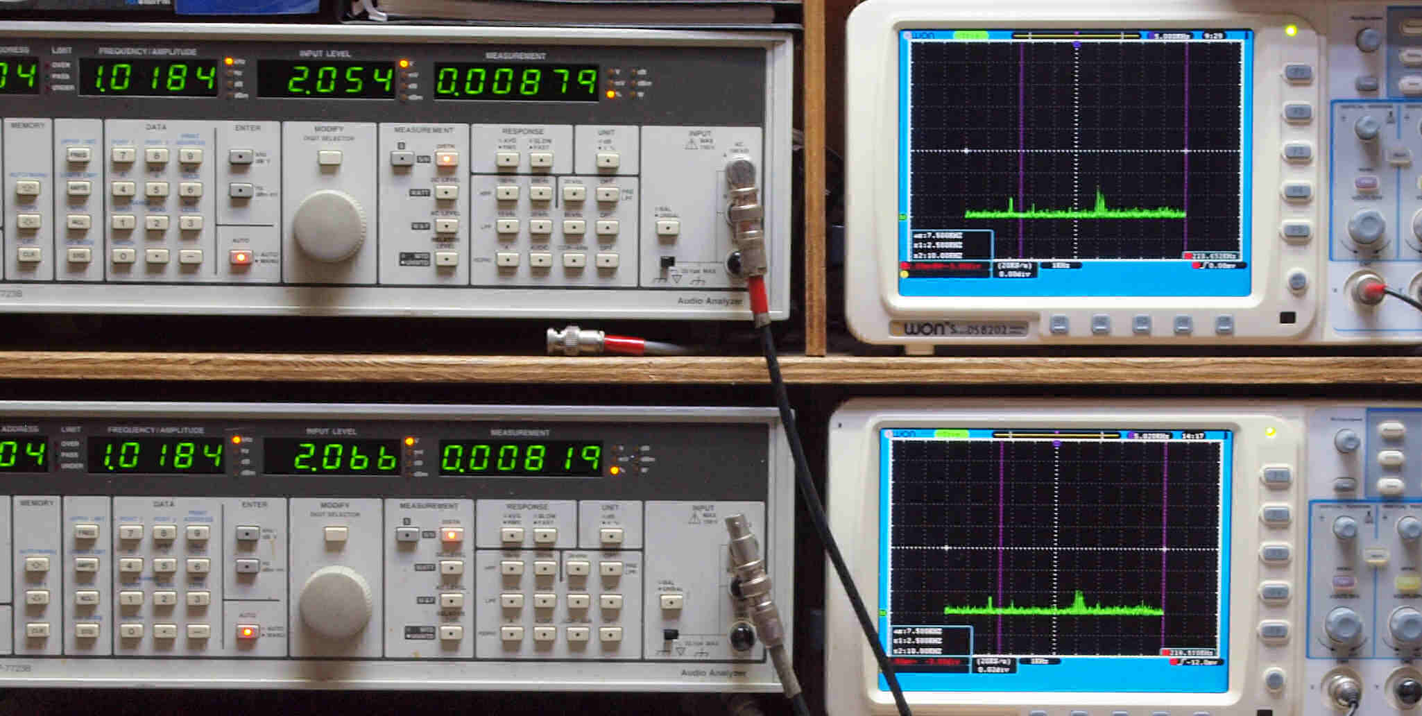 | E. 調整・測定。 画像をクリックすると、大きく(横幅2050ドット)表示されます。 E0. 出力・歪み率測定・調整。 「見方」。 上段中 右側出力を「Audio Analyzer Panasonic VP−7723B」により測定。 表示LED、 左端=メモリーNo、 中左=周波数測定、 中右=出力電圧測定、 右端=歪み率測定。 上段右端 VP−7723Bの基本波除去出力を「owon SDS8202(200MHZ)」で「FFT分析」表示。 下段中 左側出力を「Audio Analyzer Panasonic VP−7723B」により測定。 表示LED、 左端=メモリーNo、 中左=周波数測定、 中右=出力電圧測定、 右端=歪み率測定。 下段右端 VP−7723Bの基本波除去出力を「owon SDS6062(200MHZ)」で「FFT分析」表示。 下段左端 オーディオ発振器 VP−7201A より50Hz〜100kHzの信号を出し(歪み率=約0.003%)、ATT+分配器を通し、AMPに入力。 よって、ダイアル設定出力レベルより低くなります。測定機器の仕様や整備の様子はこちら、「VP−7723B」「VP−7201A」。 FFT画面の見方はこちら。 |