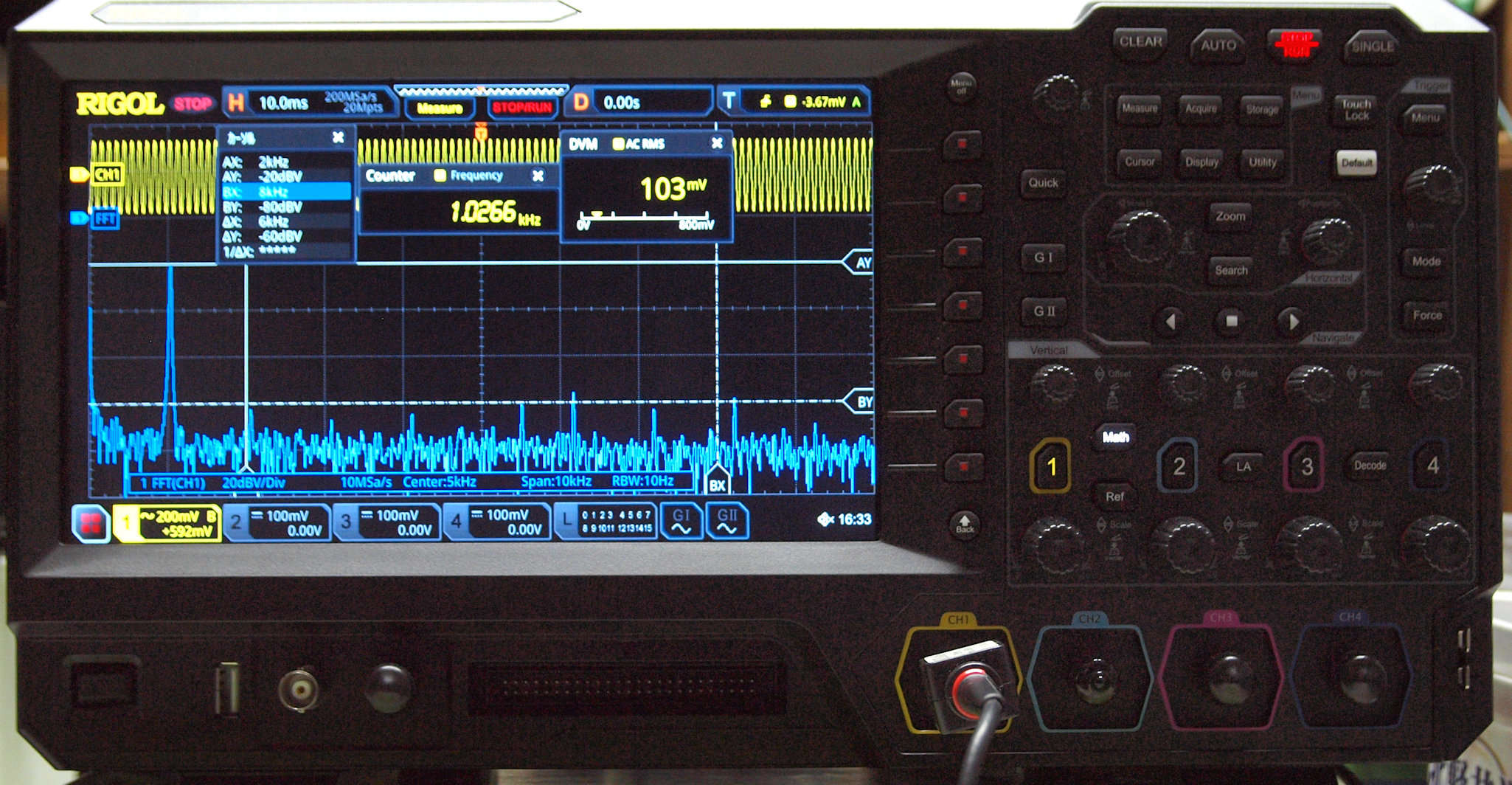 | T3. MM_1kHz入力、R側出力電圧=2V、 1.53%歪み。 PHONO_3入力、L側出力電圧=2V、 5.97%歪み。 「FFT分析」のオシロのカーソル周波数、左=2.5kHz、右=10kHz。 |