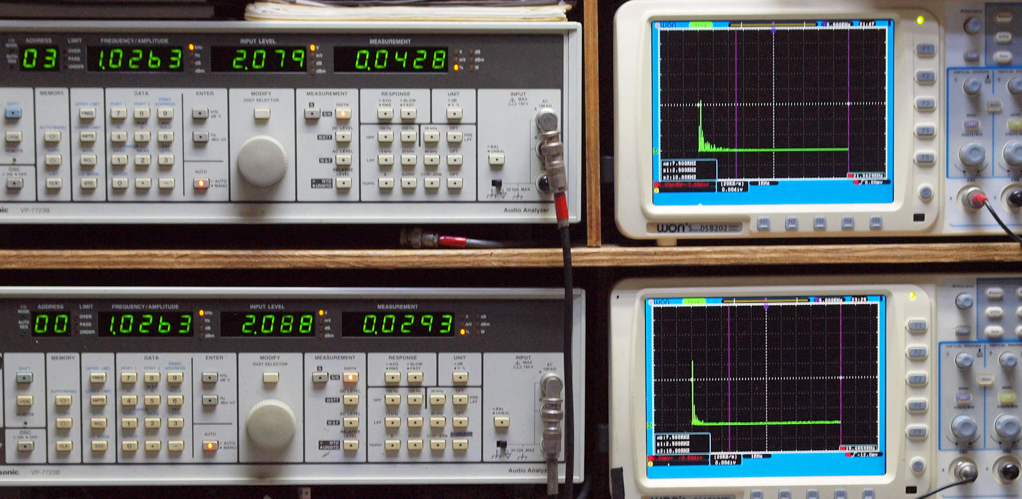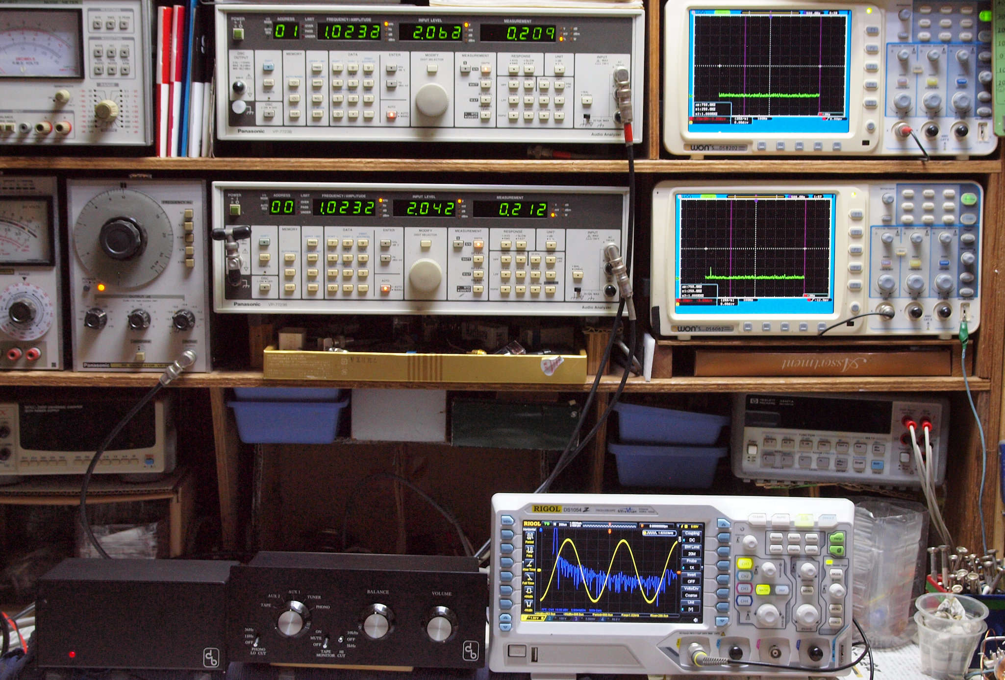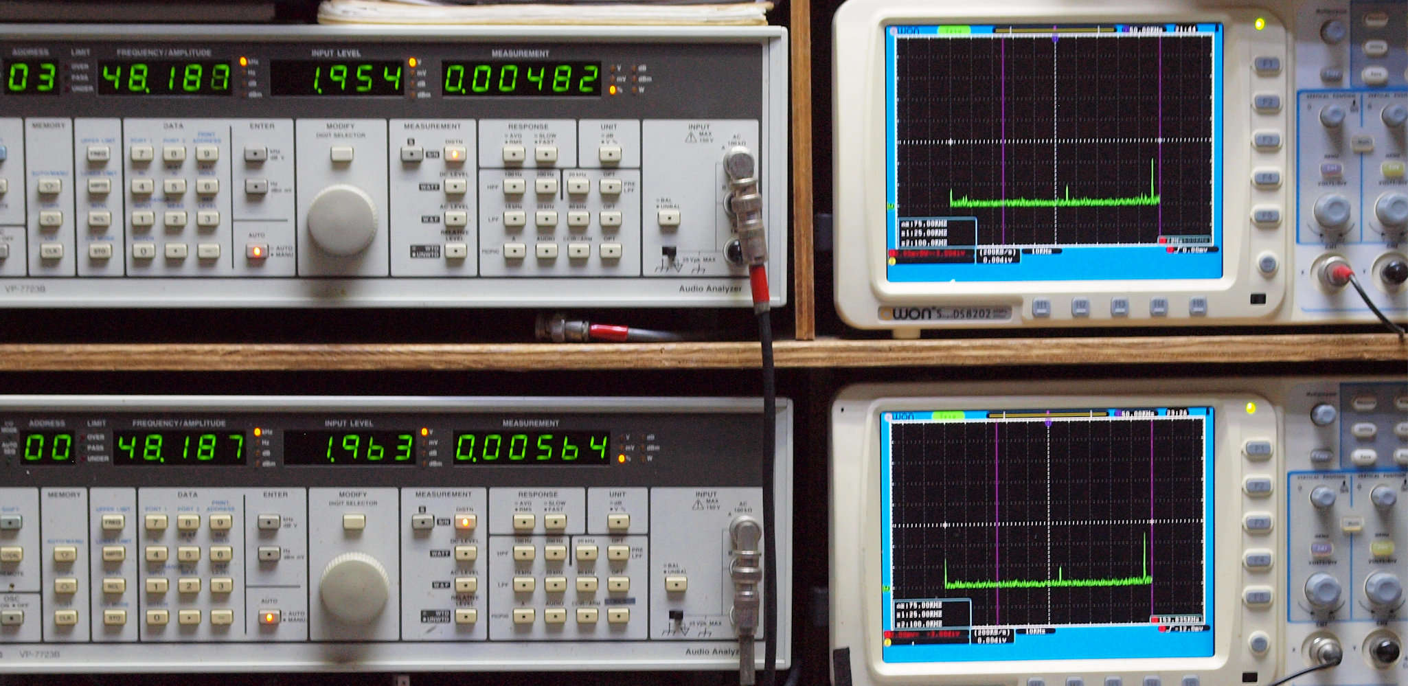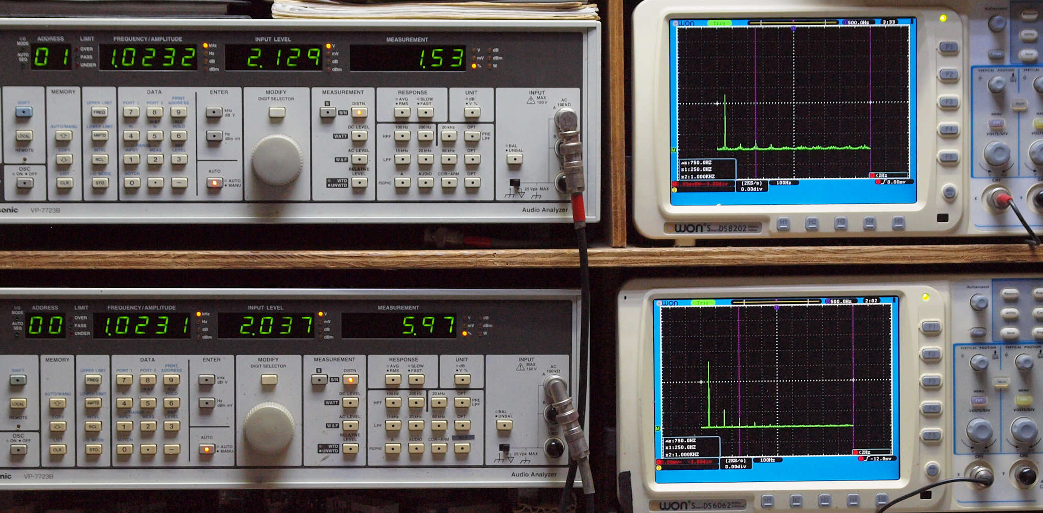 | E. 調整・測定。 画像をクリックすると、大きく(横幅2050ドット)表示されます。 E0. 出力・歪み率測定・調整。 「見方」。 上段中 右側SP出力を「Audio Analyzer Panasonic VP−7723B」により測定。 表示LED、 左端=メモリーNo、 中左=周波数測定、 中右=出力電圧測定、 右端=歪み率測定。 上段右端 VP−7723Bの基本波除去出力を「owon SDS8202(200MHZ)」で「FFT分析」表示。 下段中 左側SP出力を「Audio Analyzer Panasonic VP−7723B」により測定。 表示LED、 左端=メモリーNo、 中左=周波数測定、 中右=出力電圧測定、 右端=歪み率測定。 下段右端 VP−7723Bの基本波除去出力を「owon SDS6062(200MHZ)」で「FFT分析」表示。 下段左端 オーディオ発振器 VP−7201A より50Hz〜100kHzの信号を出し(歪み率=約0.003%)、ATT+分配器を通し、AMPに入力。 よって、ダイアル設定出力レベルより低くなります。測定機器の仕様や整備の様子はこちら、「VP−7723B」「VP−7201A」。 FFT画面の見方はこちら。 |