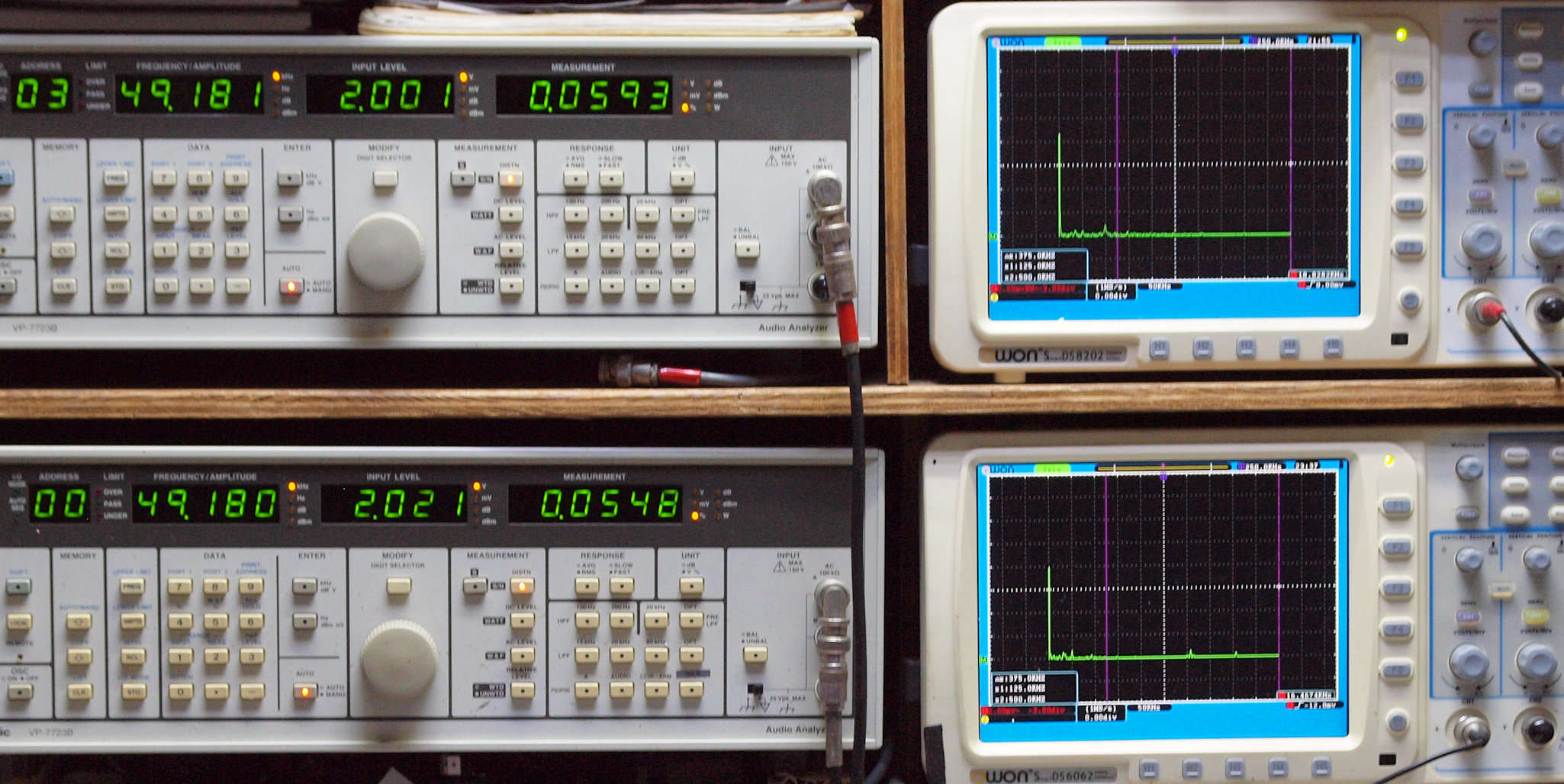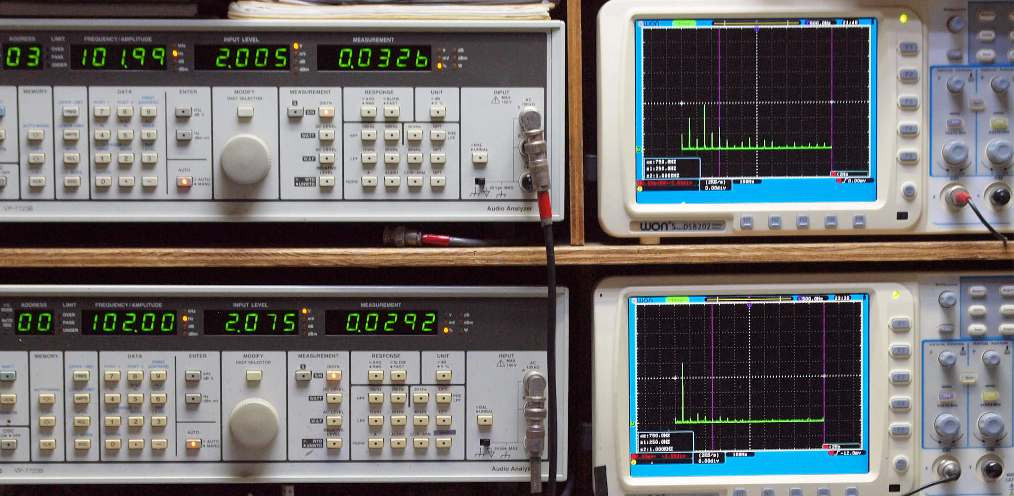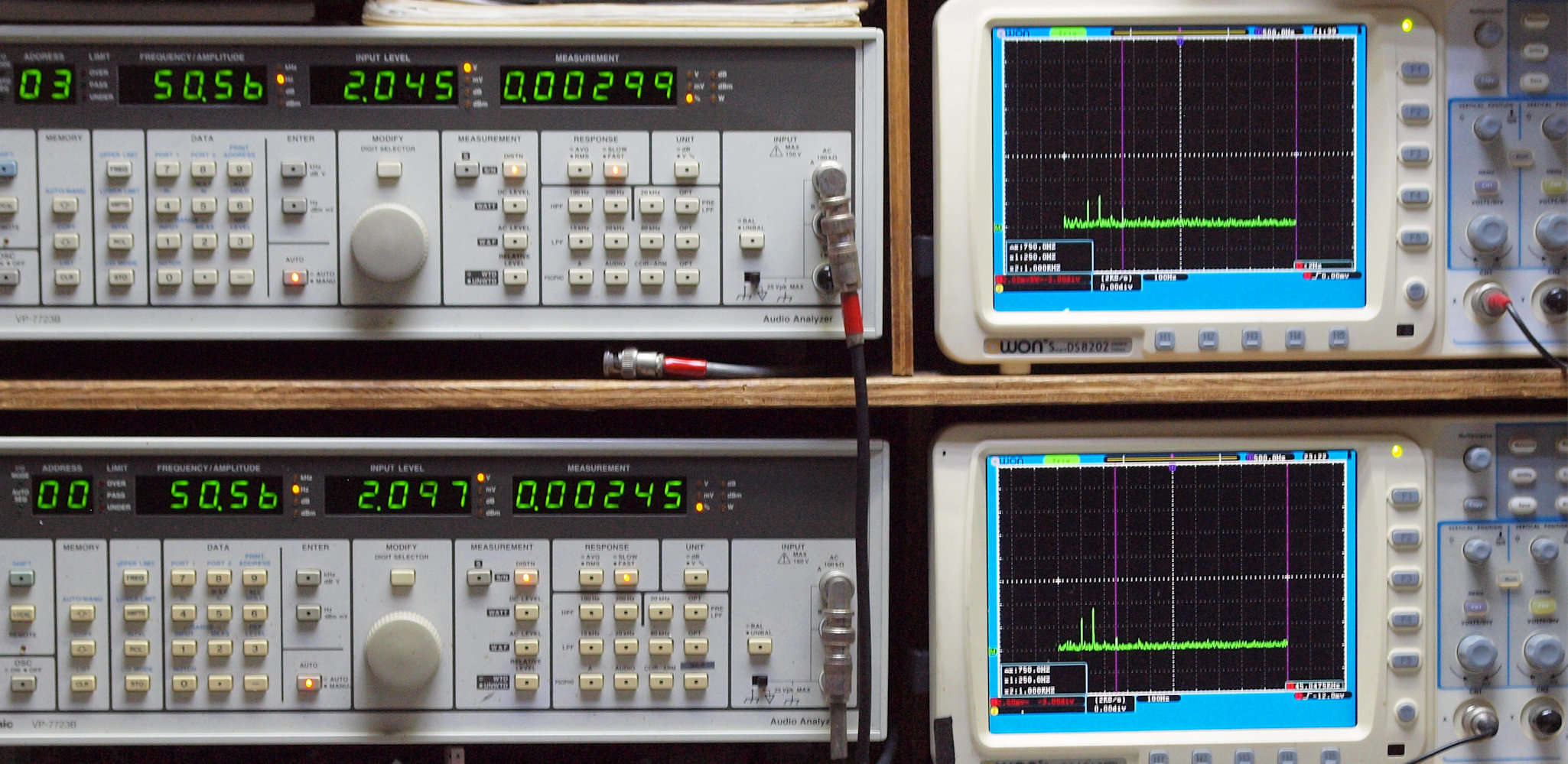 | E. 調整・測定。 画像をクリックすると、大きく(横幅2050ドット)表示されます。 E0. 出力・歪み率測定・調整。 「見方」。 上段中 右側SP出力を「Audio Analyzer Panasonic VP−7723B」により測定。 表示LED、 左端=メモリーNo、 中左=周波数測定、 中右=出力電圧測定、 右端=歪み率測定。 上段右端 VP−7723Bの基本波除去出力を「owon SDS8202(200MHZ)」で「FFT分析」表示。 下段中 左側SP出力を「Audio Analyzer Panasonic VP−7723B」により測定。 表示LED、 左端=メモリーNo、 中左=周波数測定、 中右=出力電圧測定、 右端=歪み率測定。 下段右端 VP−7723Bの基本波除去出力を「owon SDS6062(200MHZ)」で「FFT分析」表示。 下段左端 オーディオ発振器 VP−7201A より50Hz〜100kHzの信号を出し(歪み率=約0.003%)、ATT+分配器を通し、AMPに入力。 よって、ダイアル設定出力レベルより低くなります。測定機器の仕様や整備の様子はこちら、「VP−7723B」「VP−7201A」。 FFT画面の見方はこちら。 |