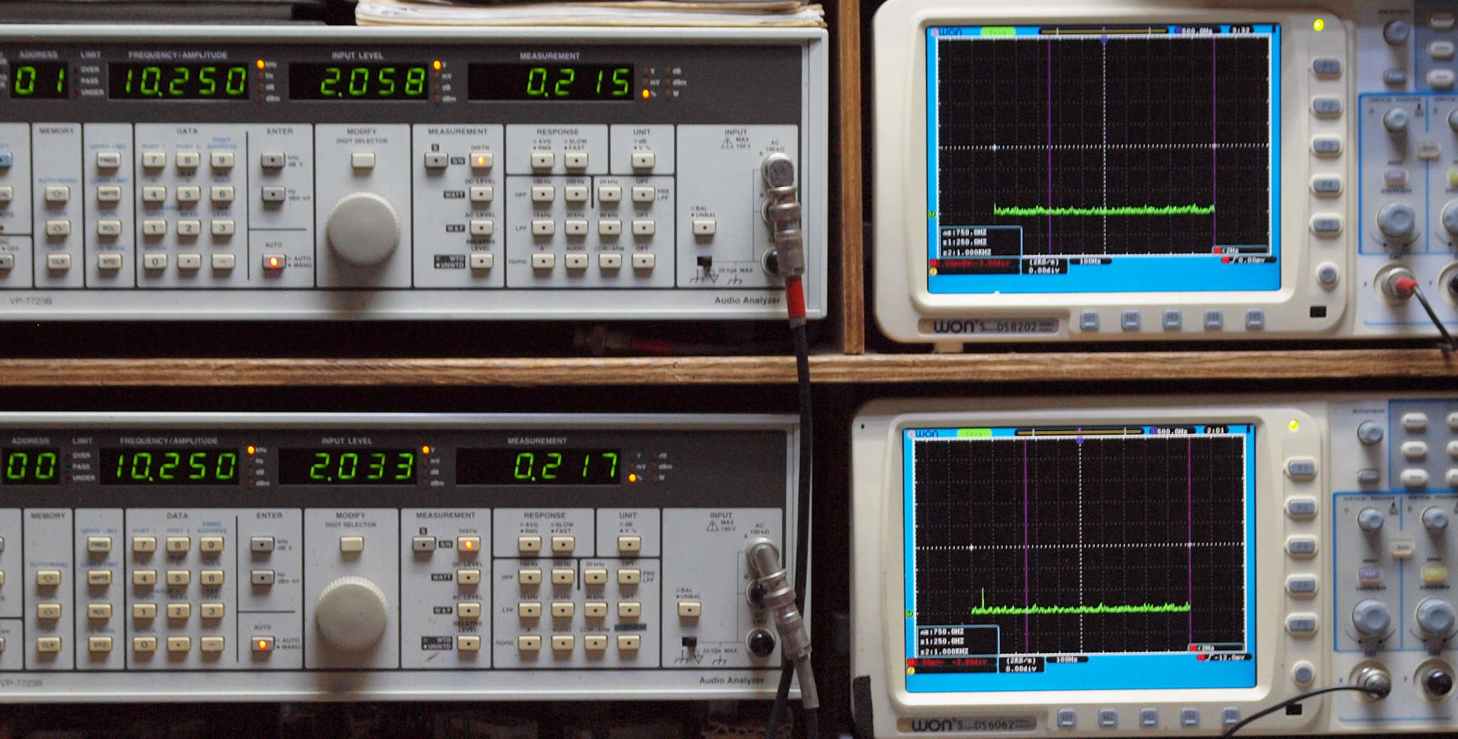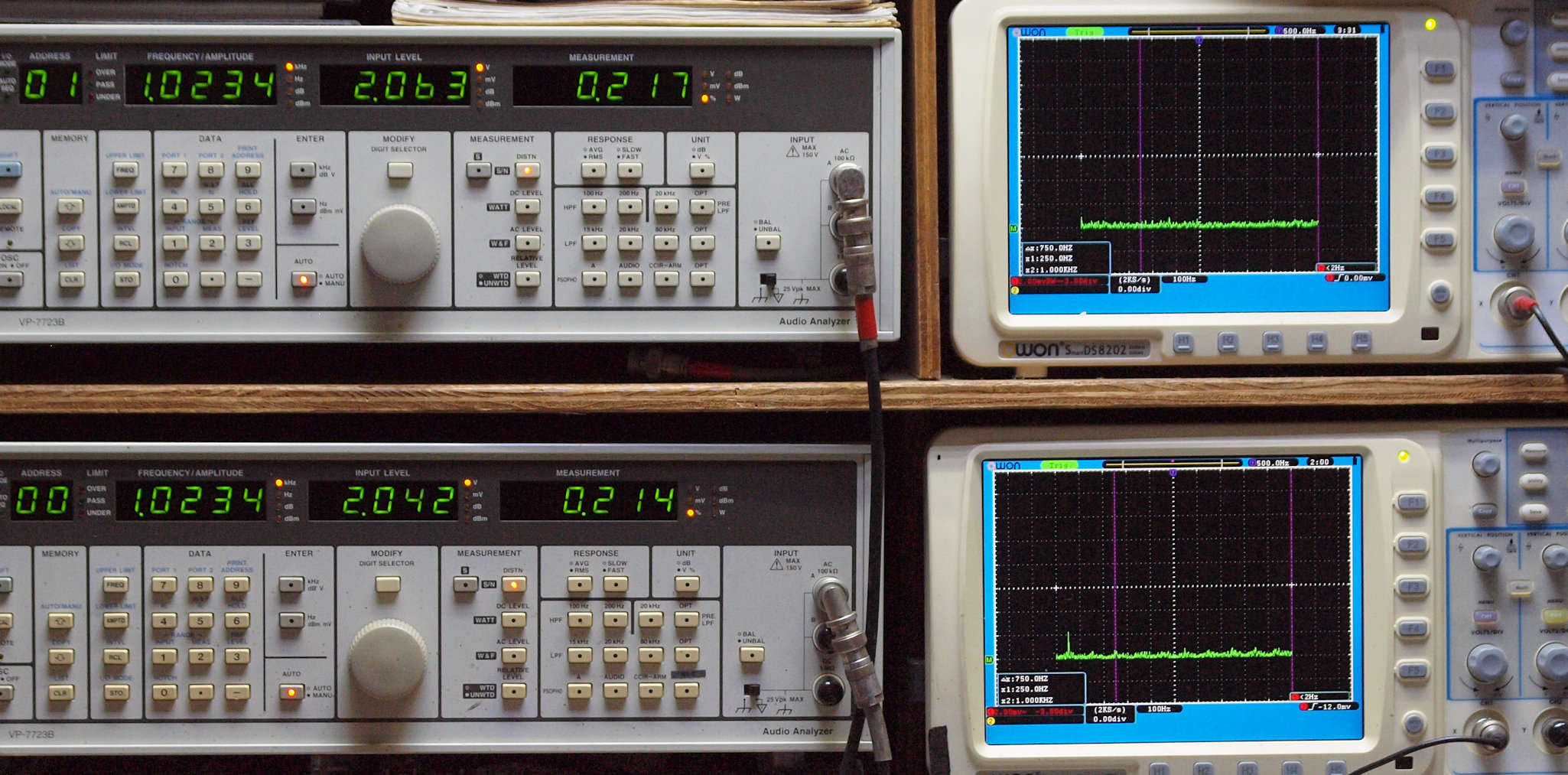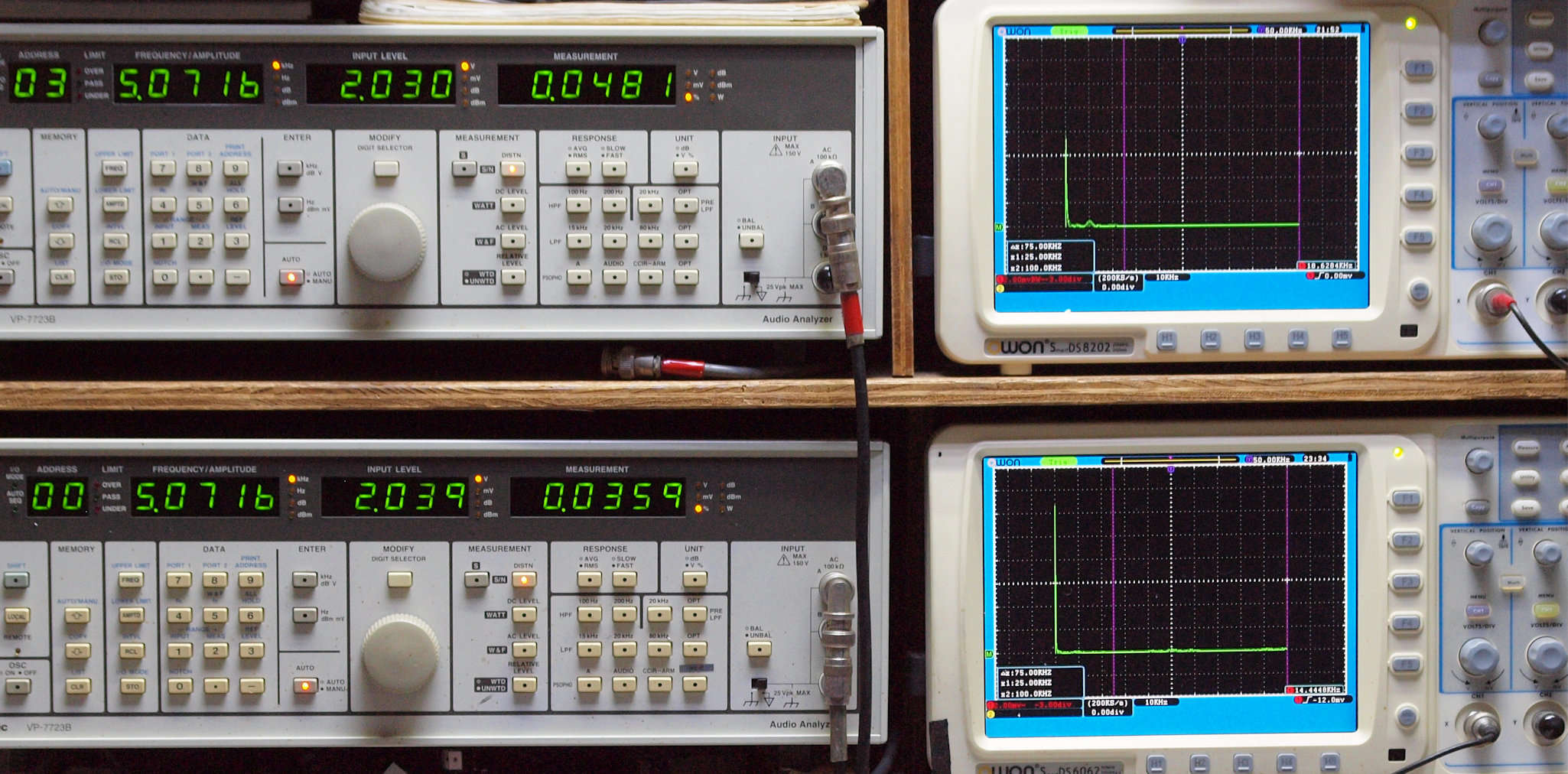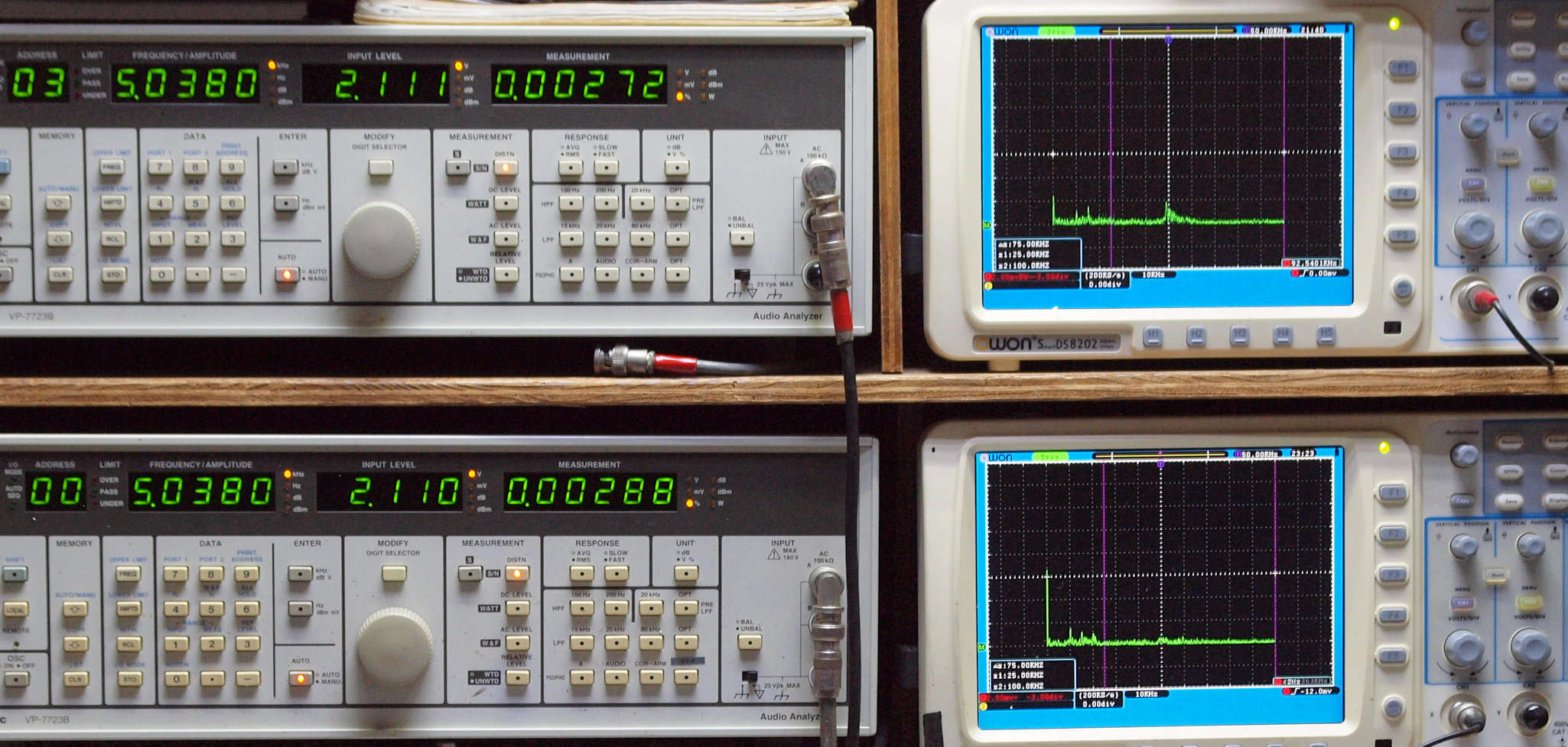 | E. 調整・測定。 画像をクリックすると、大きく(横幅2050ドット)表示されます。 E0. 出力・歪み率測定・調整。 「見方」。 上段中 右側SP出力を「Audio Analyzer Panasonic VP−7723B」により測定。 表示LED、 左端=メモリーNo、 中左=周波数測定、 中右=出力電圧測定、 右端=歪み率測定。 上段右端 VP−7723Bの基本波除去出力を「owon SDS8202(200MHZ)」で「FFT分析」表示。 下段中 左側SP出力を「Audio Analyzer Panasonic VP−7723B」により測定。 表示LED、 左端=メモリーNo、 中左=周波数測定、 中右=出力電圧測定、 右端=歪み率測定。 下段右端 VP−7723Bの基本波除去出力を「owon SDS6062(200MHZ)」で「FFT分析」表示。 下段左端 オーディオ発振器 VP−7201A より50Hz〜100kHzの信号を出し(歪み率=約0.003%)、ATT+分配器を通し、AMPに入力。 よって、ダイアル設定出力レベルより低くなります。測定機器の仕様や整備の様子はこちら、「VP−7723B」「VP−7201A」。 FFT画面の見方はこちら。 |