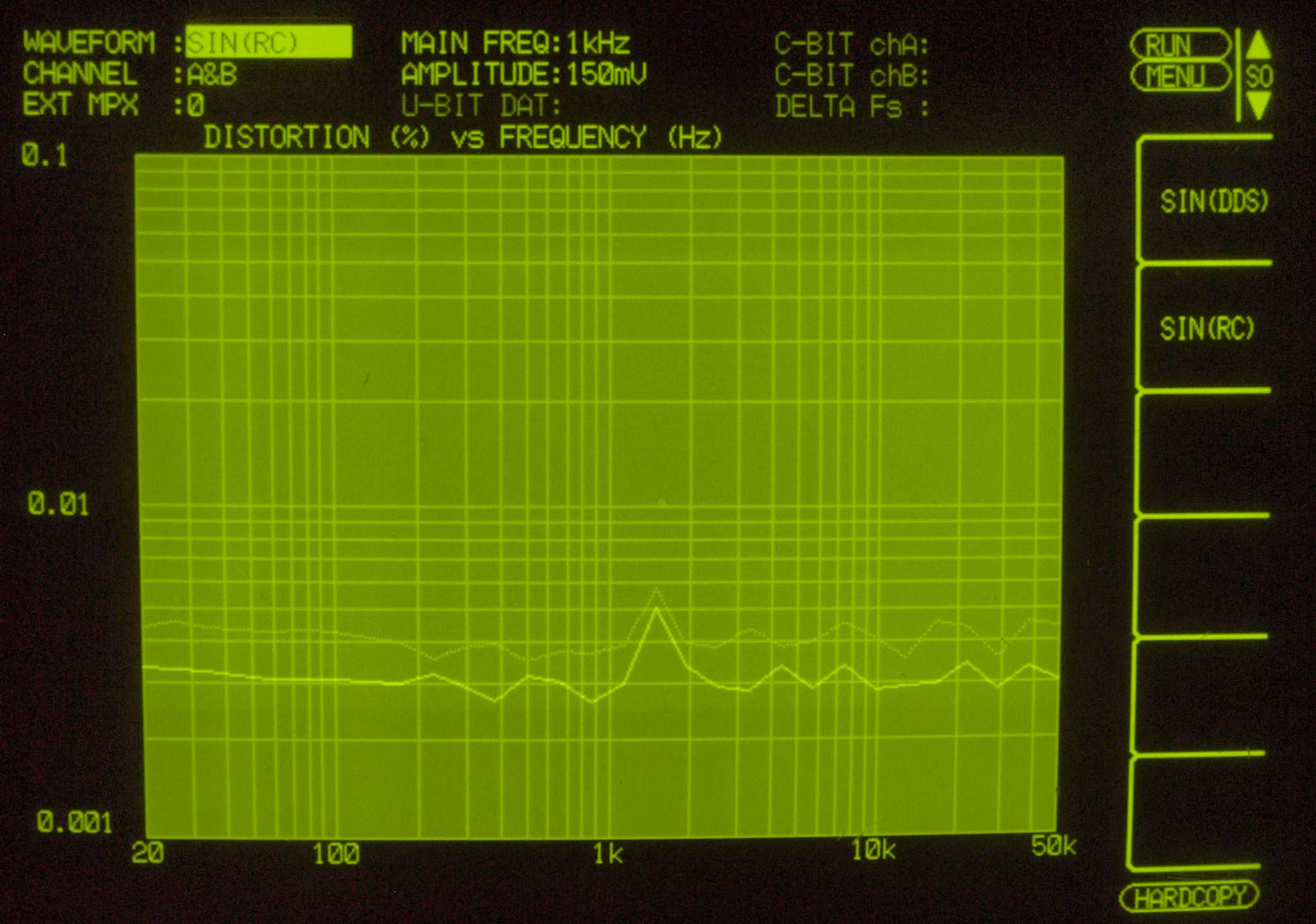 | E21. MM_50Hz入力、 R側出力電圧=2V、 0.01304%歪み。 L側出力電圧=2V、 0.01538%歪み。 「FFT分析」のオシロのカーソル周波数、左=250Hz、右=1kHz。 |