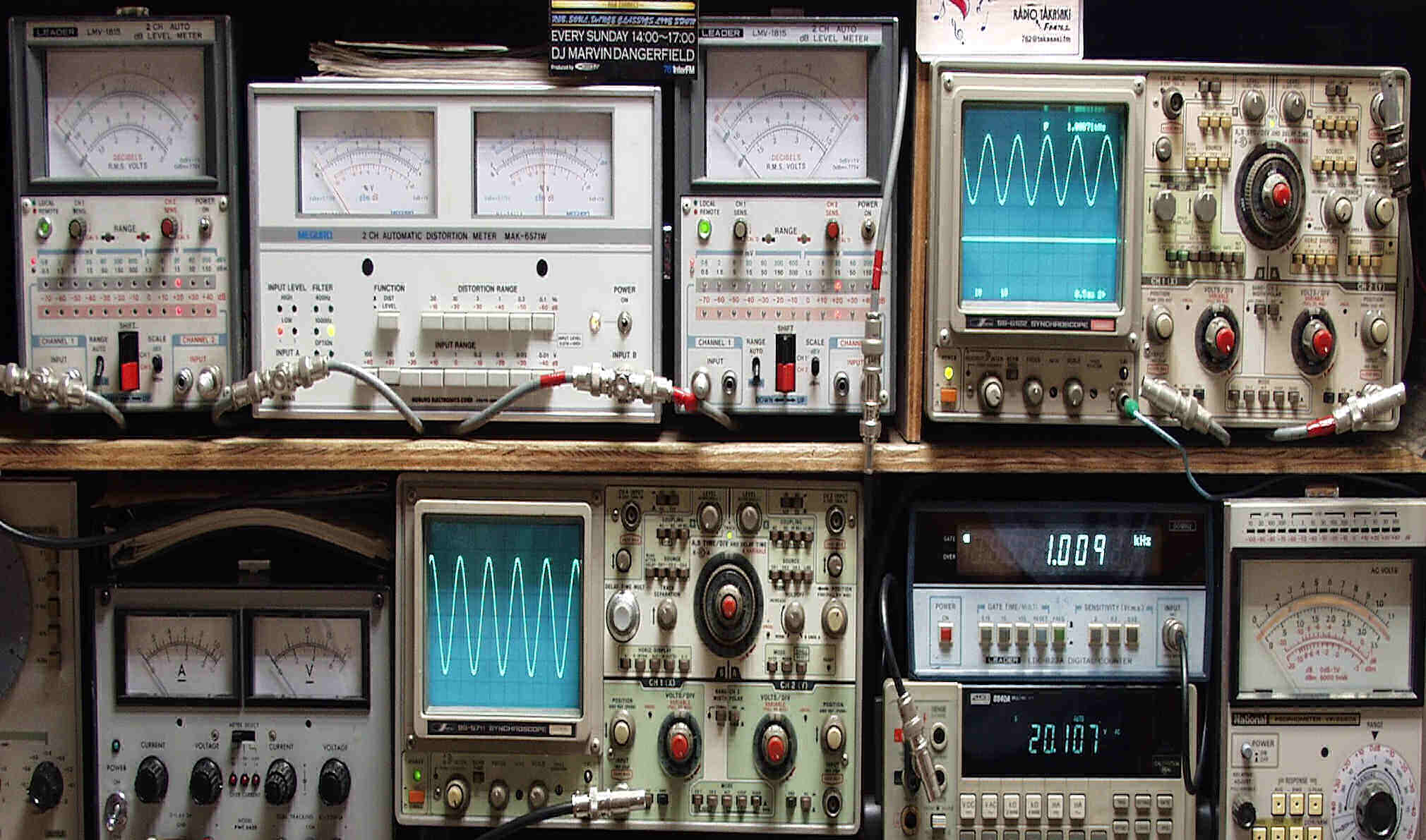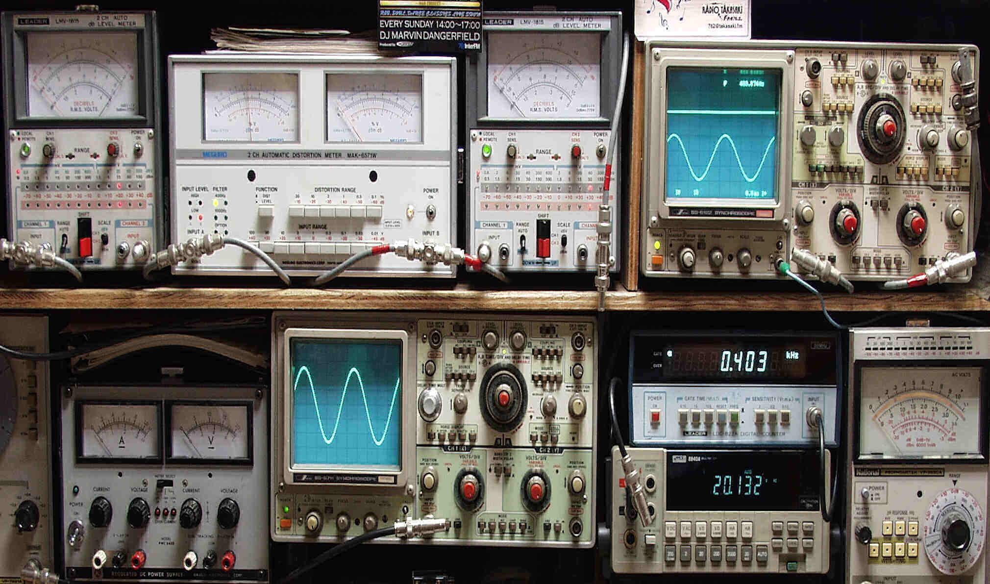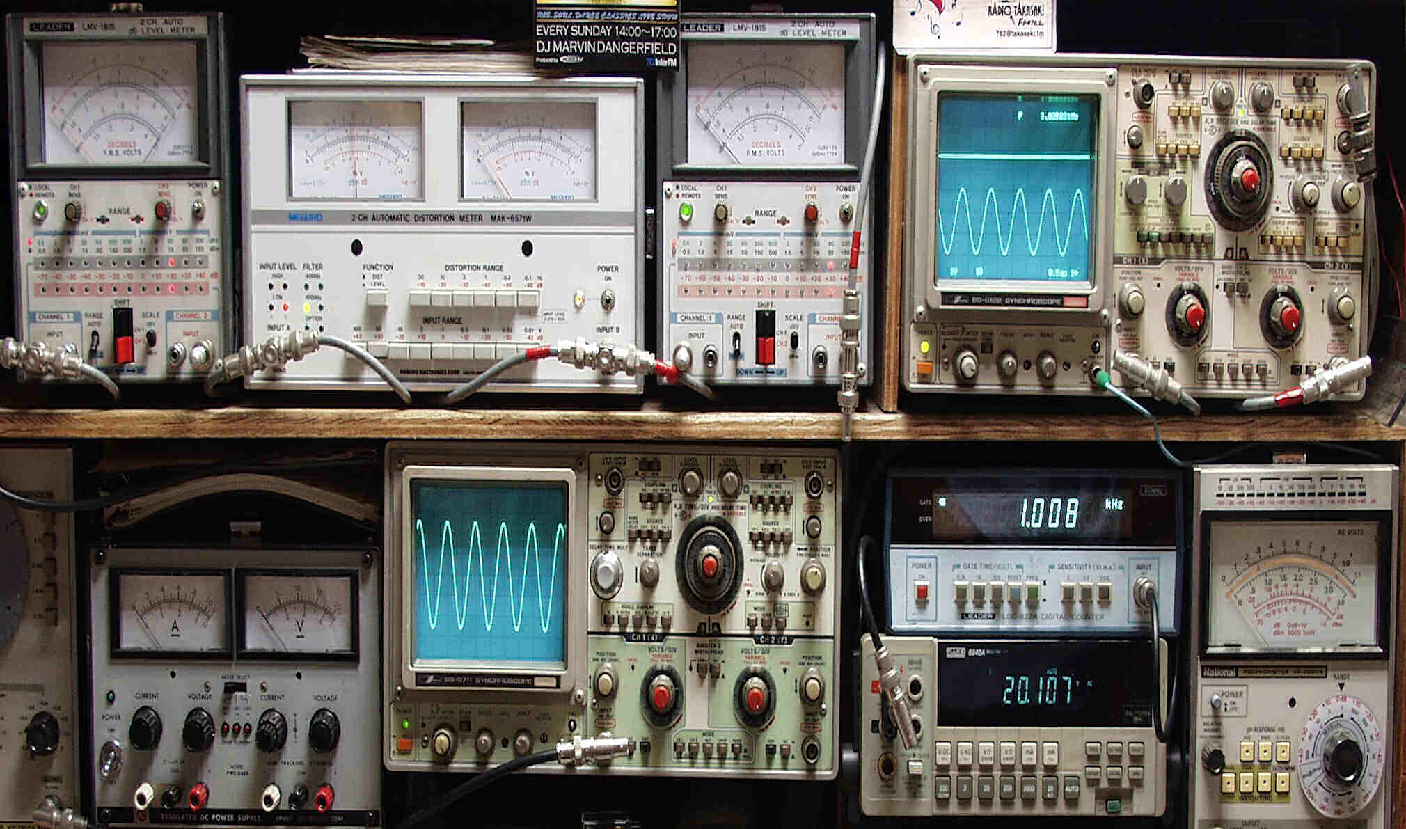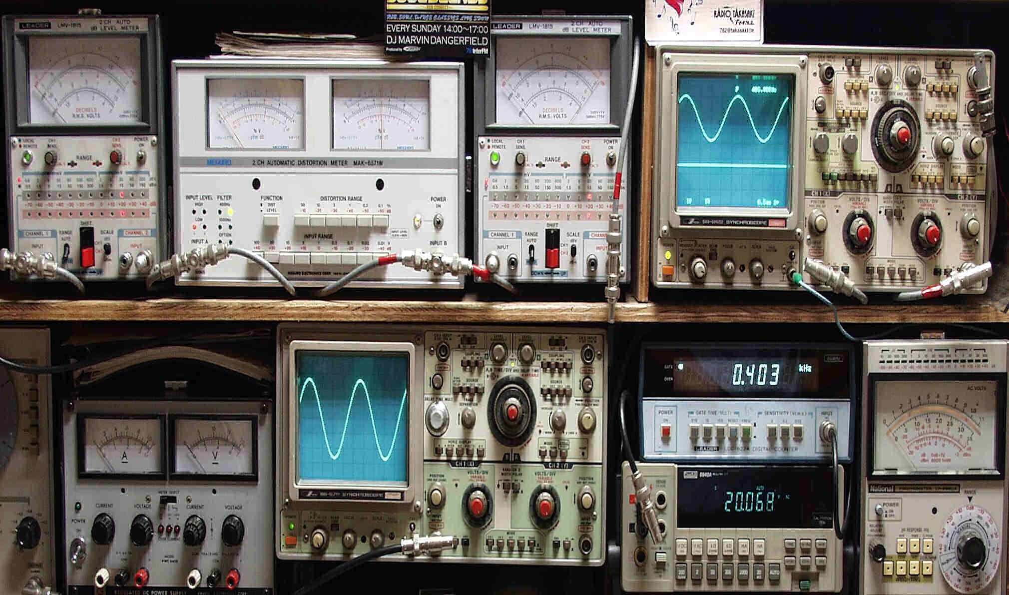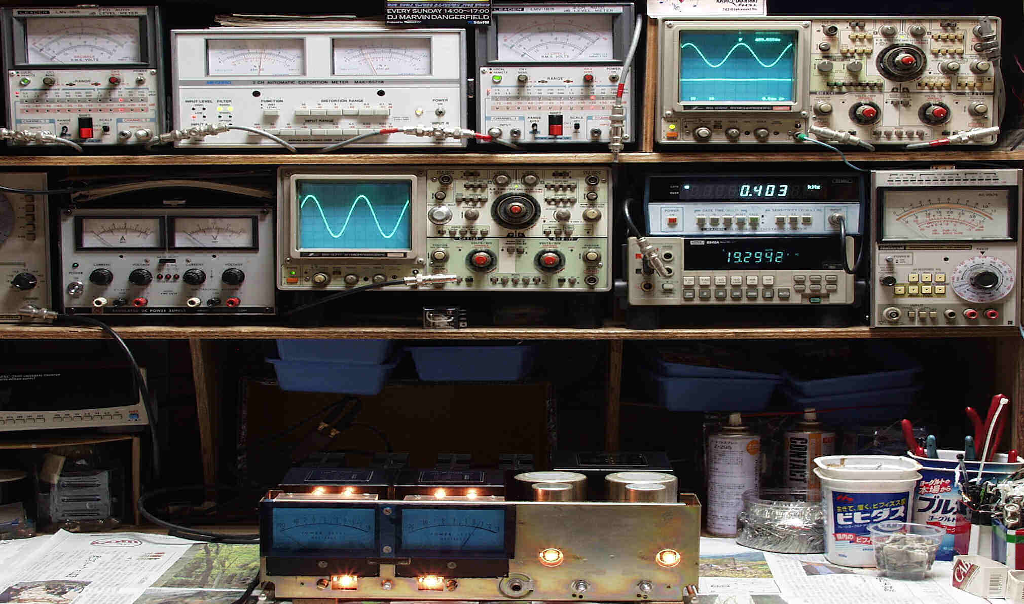 | E. 測定・調整。 E1. 出力・歪み率測定・調整。 <見方> 下段左端のオーディオ発振器より400HZ&1KHZの信号を出し(歪み率=約0.003%)これをAMPに入力し、SP出力を測定。 下段中左のオシロ=入力波形(オーディオ発振器のTTLレベル)。 下段中右上は周波数計。 上段左端の電圧計=L側SP出力電圧測定。 黒針のみ使用 上段中左の歪み率計=SP出力の歪み率測定。 左メータ=L出力。 右メータ=R出力。 上段中右の電圧計=R側SP出力電圧測定。 赤針のみ使用。 上段右端のオシロ=SP出力波形。 上=R出力。 下=L出力。(実際にはRL電圧計の出力「Max1V」を観測)。 下段中右上のデジタル電圧計=SP出力電圧測定RLは切り替えて測定。 |
