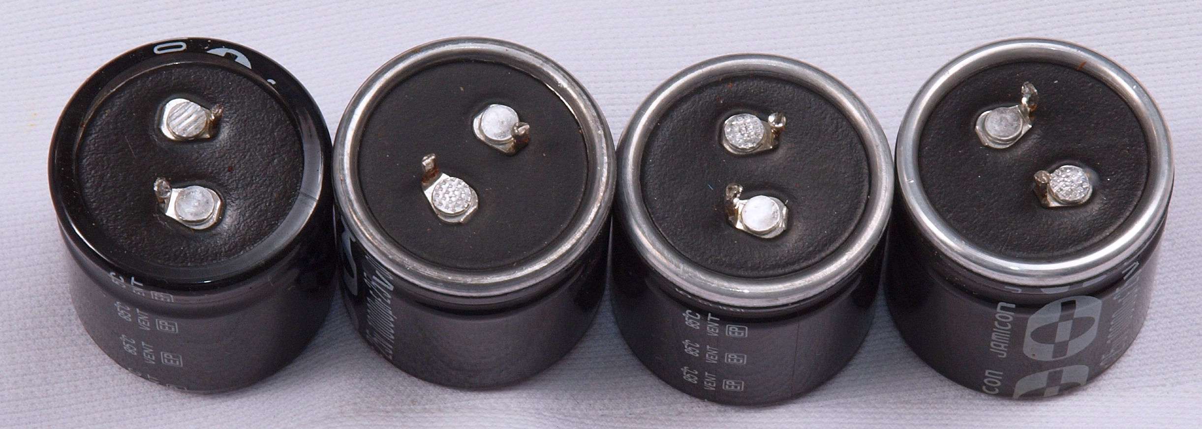 A61. 点検中 電源電解コンデンサーの比較、中=25V/10000μ、両側=交換する、25V/15000μ。