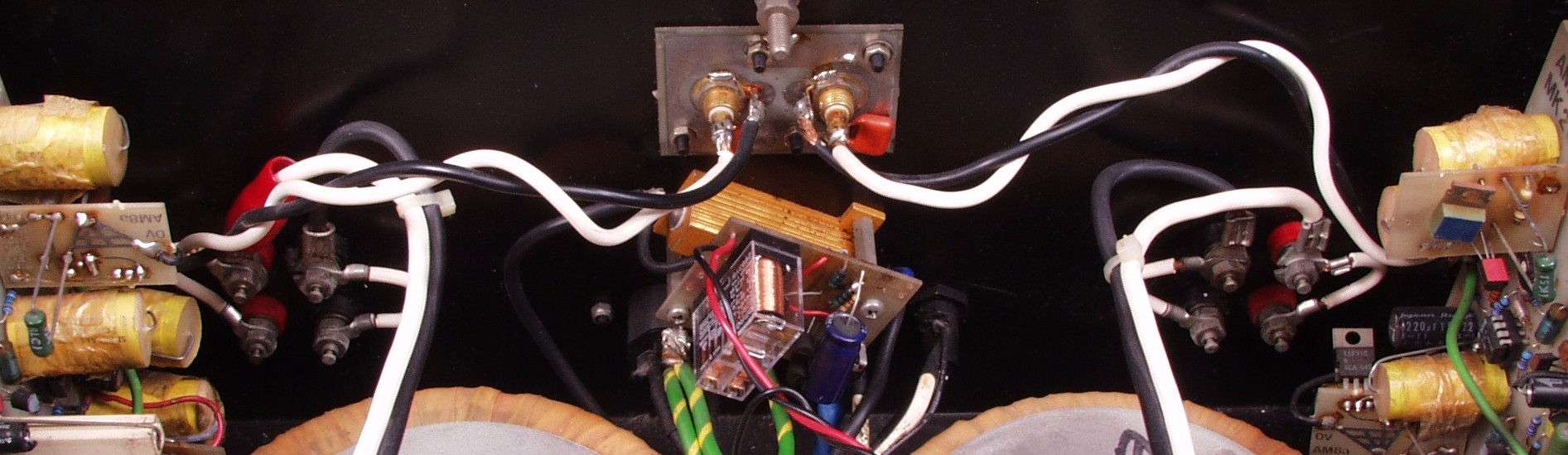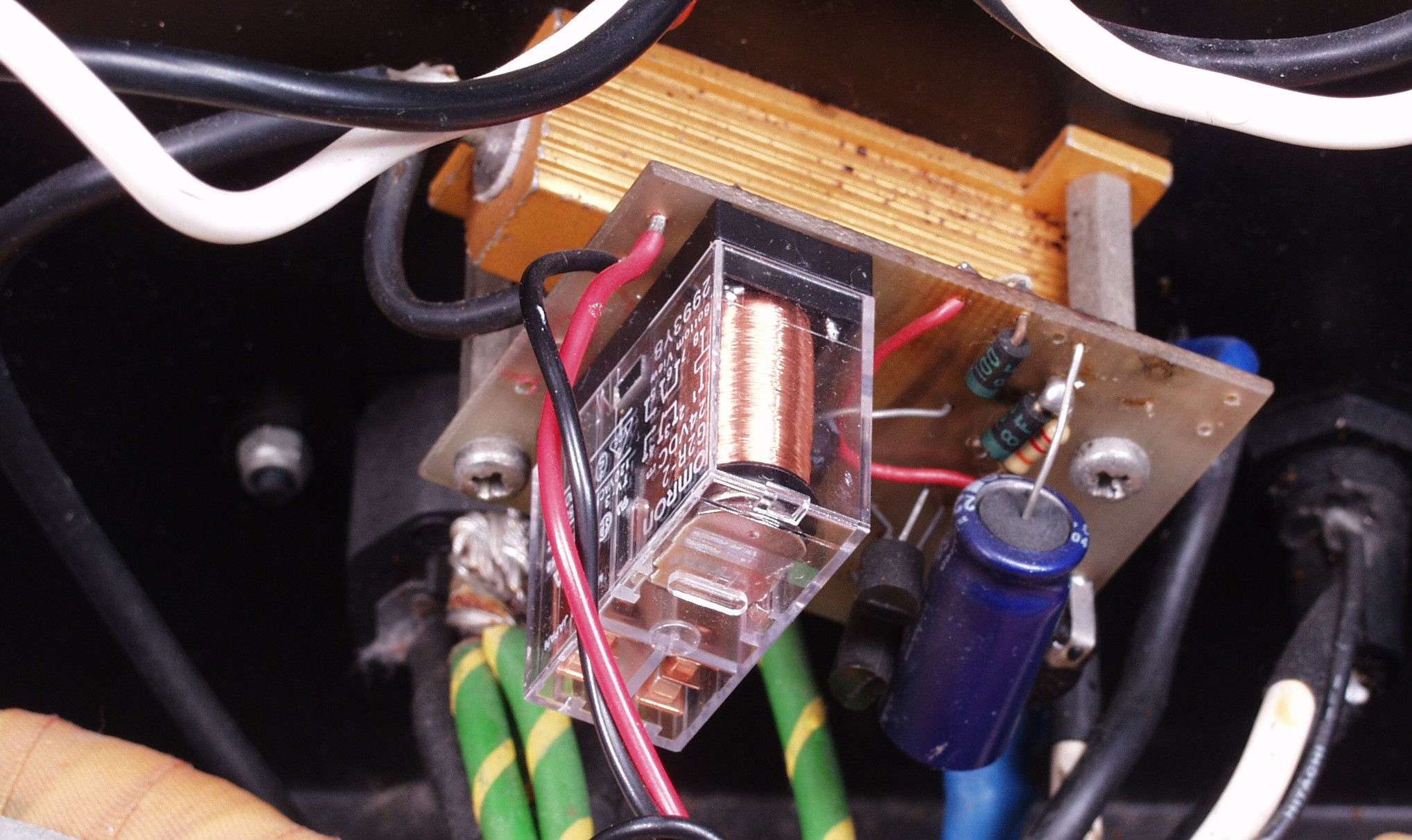 | A8.点検中 突入電流抑制回路、交換されているリレーの接点容量は5A×2(但し、パラ接点なので=10Aとはならない) このAMPの消費電力は650Wなのだから、もう少し余裕が欲しい、出来れば20A以上 |