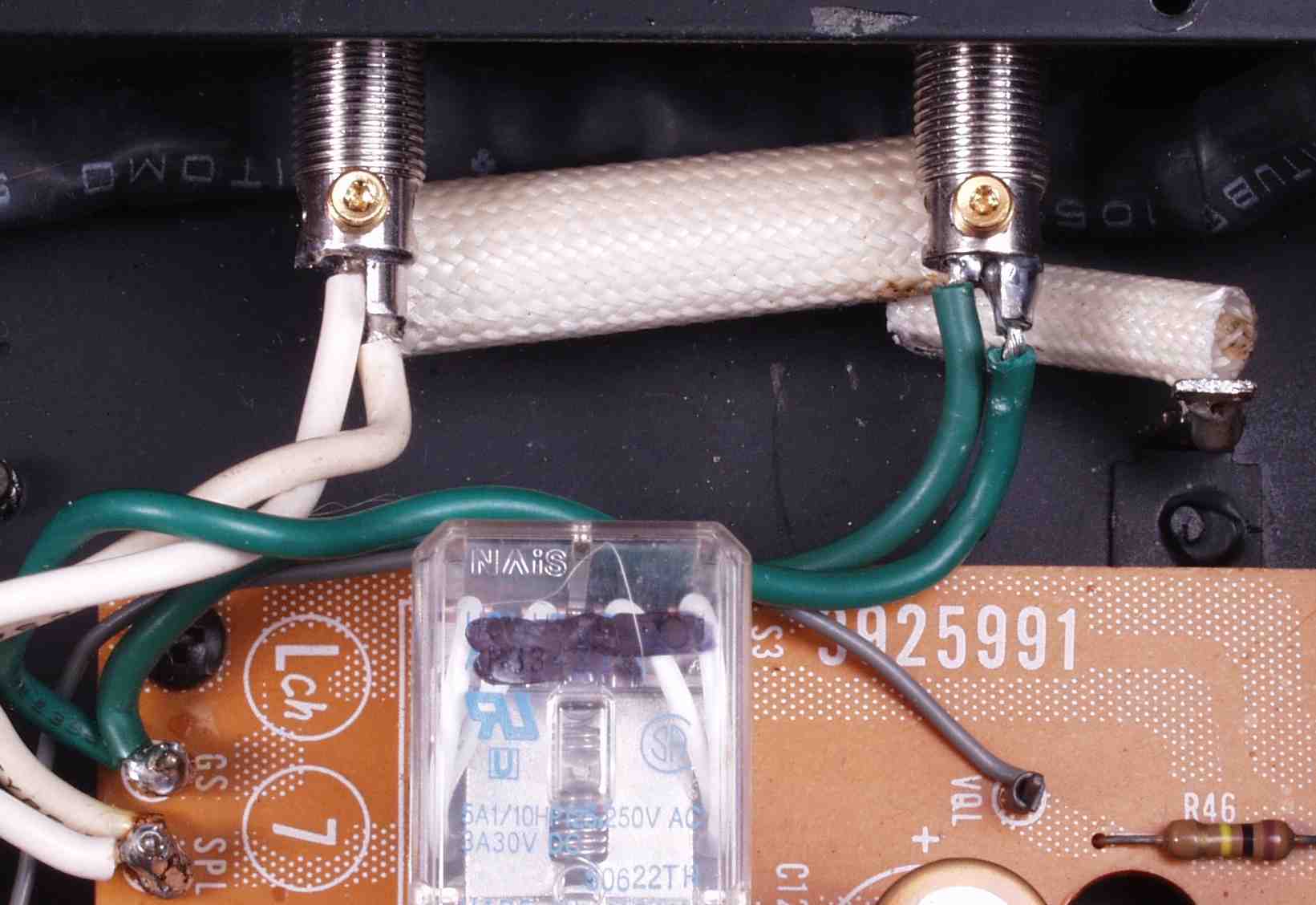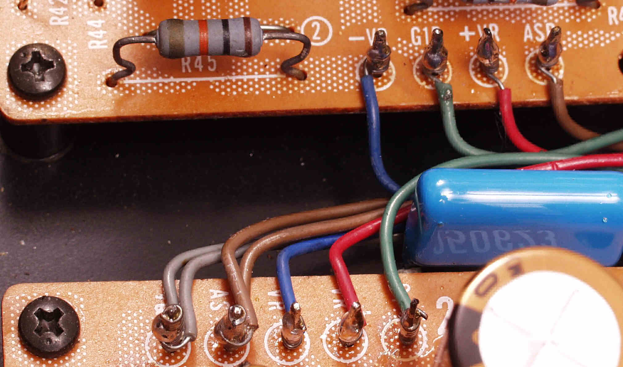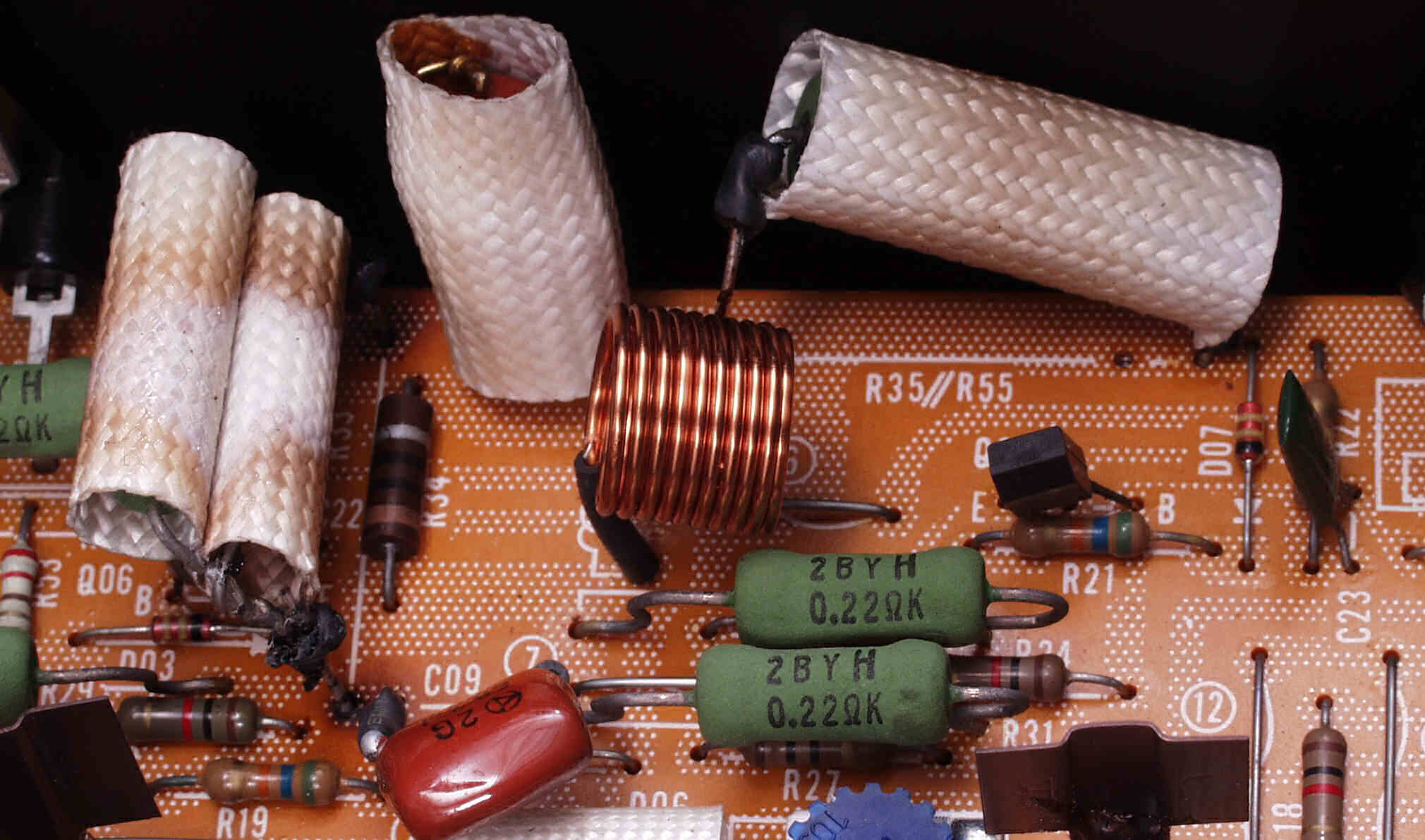 A6. 修理前見積り点検中  L側AMP基板、発振の為焼けた抵抗の保護チューブ
