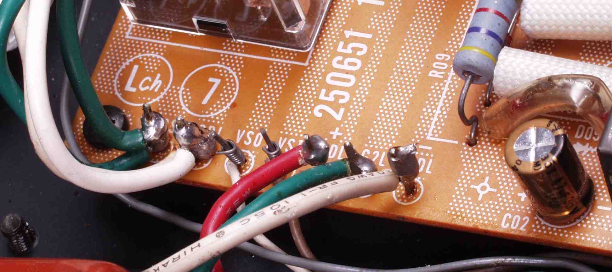 A5B. 修理前見積り点検中 L側AMP基板の電解コンデンサーが熱のため、頭のビニールが剥けた