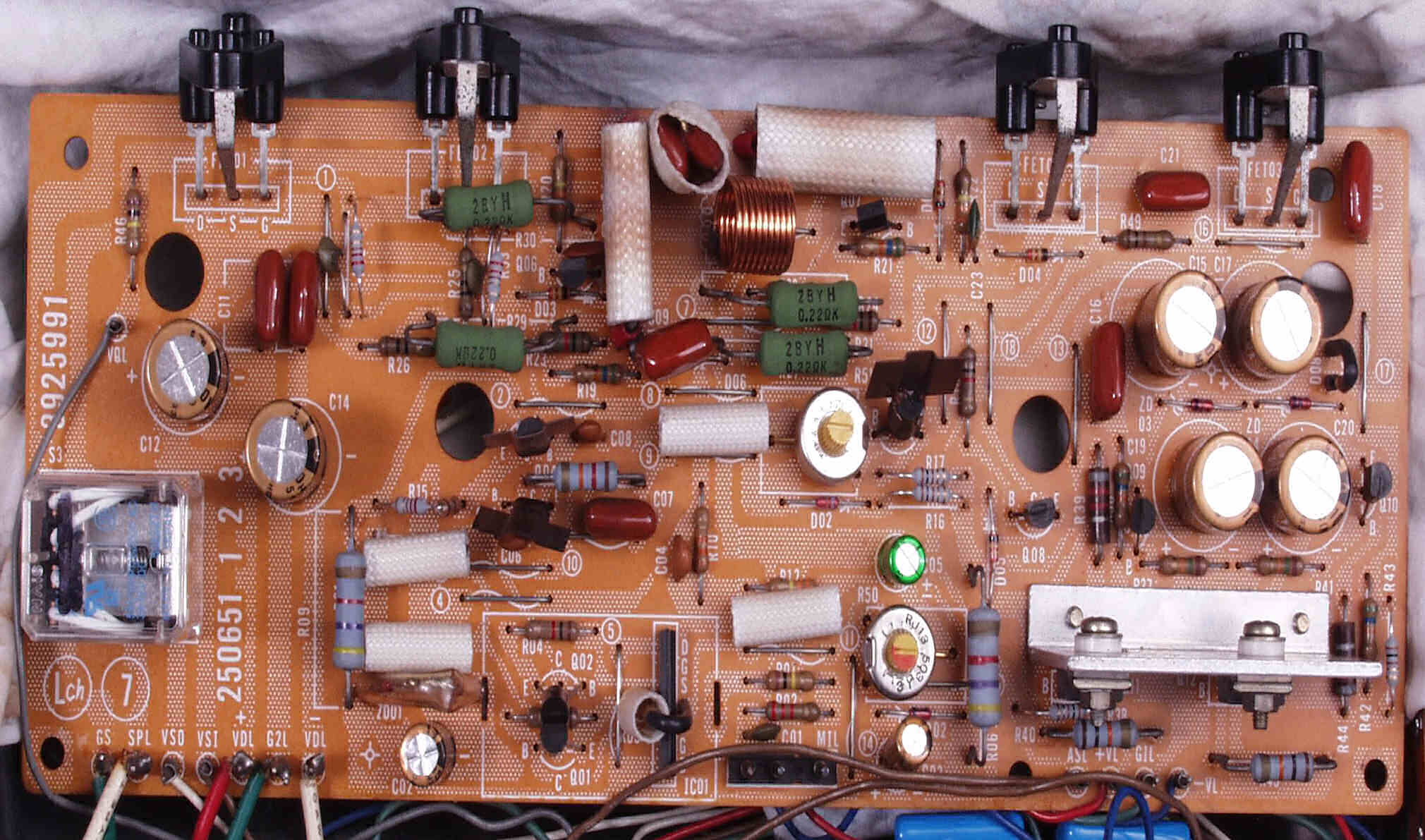 C2B. 修理後 Lドライブ基板 初段FET(電界効果トランジスター)、バランス/バイアス調整用半固定VR2個、SP接続リレー交換