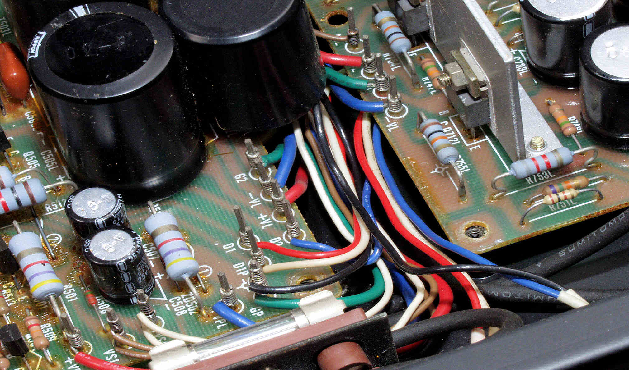 | C212. 修理前 R側ドライブ基板、拡大。 フューズ抵抗がカーボン抵抗に置き換えられている、バイアス調整VRは機械的センター。 |