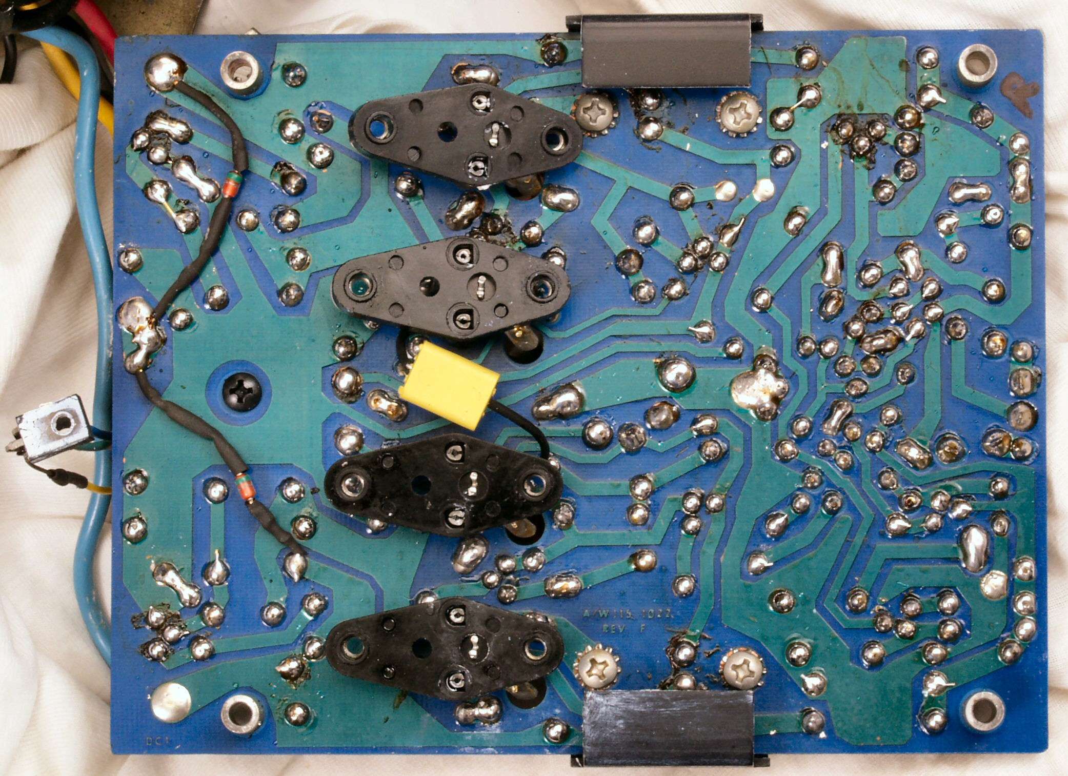 C−4C−1. 修理前  VU基板裏 接点復活剤の使用で腐食した銅箔、右下はは半田屑が付いている