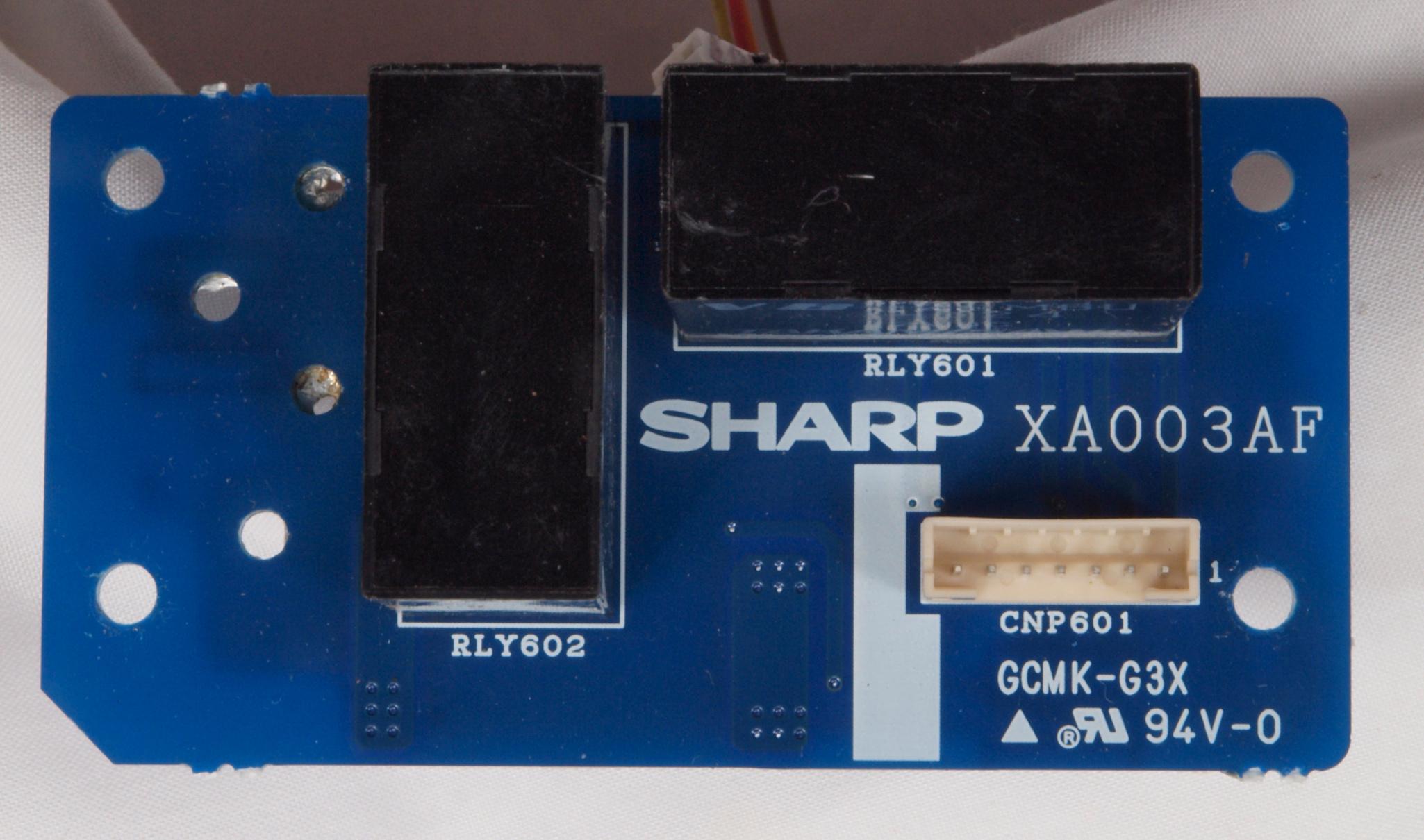 | C71. 修理中 SP接続リレー基板。 リレー定格電流5Aなので、5A×5A×4Ω=200W。4オーム出力の時はバイワイヤーが良い。 |