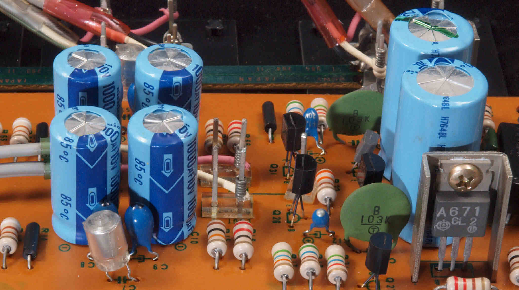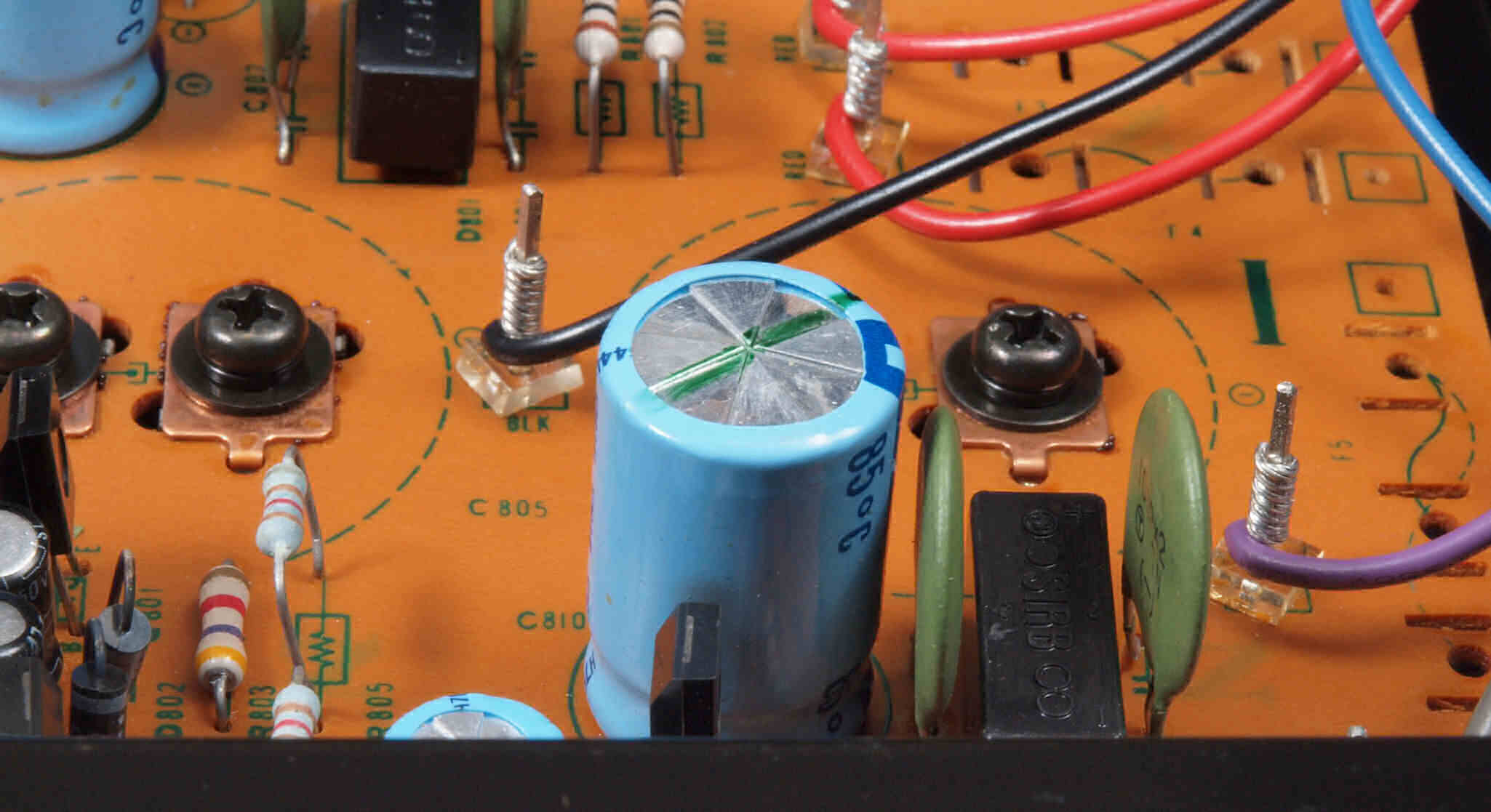 A28. 点検中 MC-AMP基板上の電解コンデンサーの頭が膨らみだしている。
