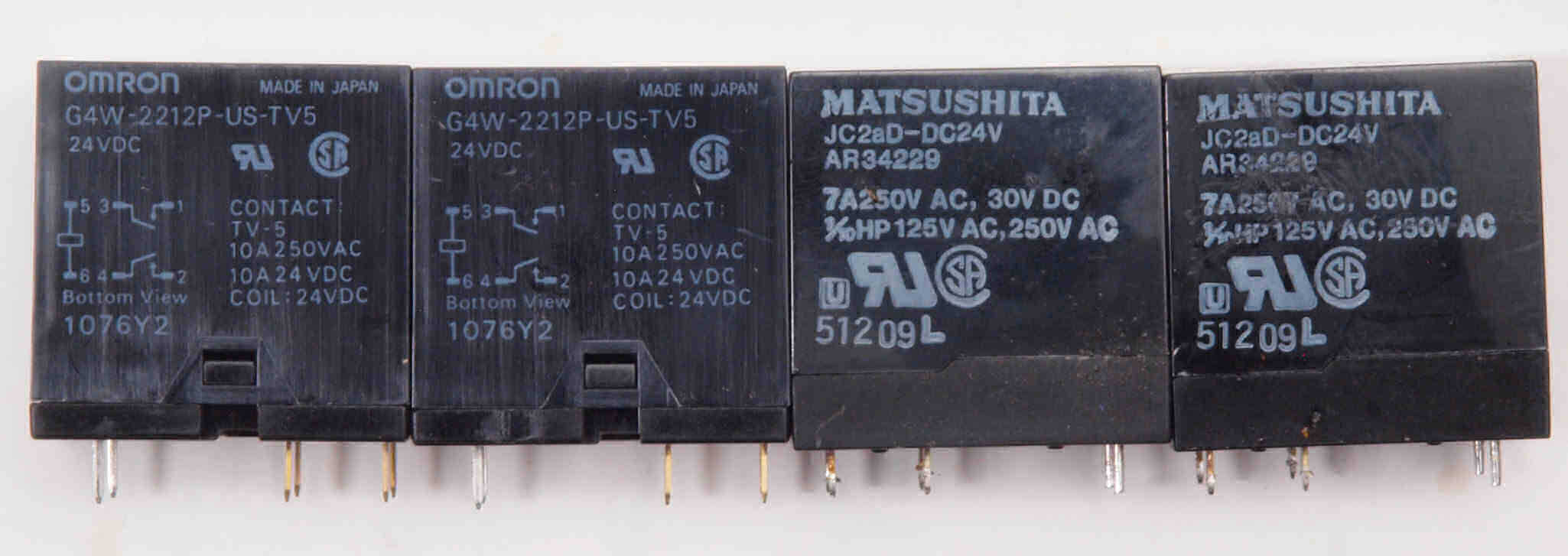 CL2. 交換部品、SP接続リレー。 右=付いていた接点容量7Aのリレー、8Ω出力だと392W定格。