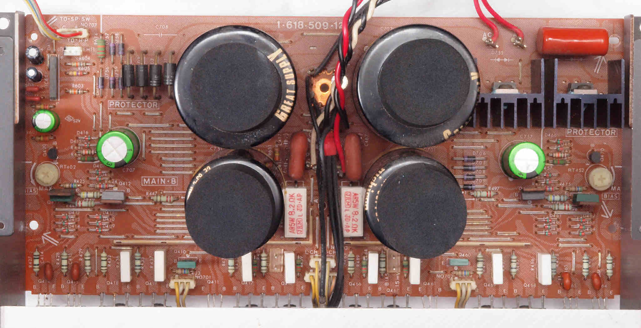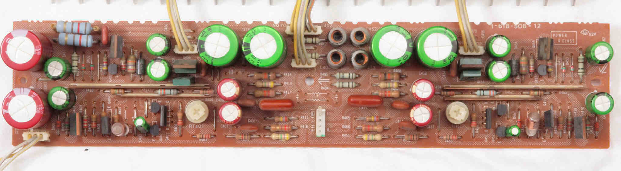 C22. 修理後 POWER AMP−A基板 複合TR(トランジスター)2個、電解コンデンサ−20個、半固定VR2個、ヒューズ抵抗8個交換。