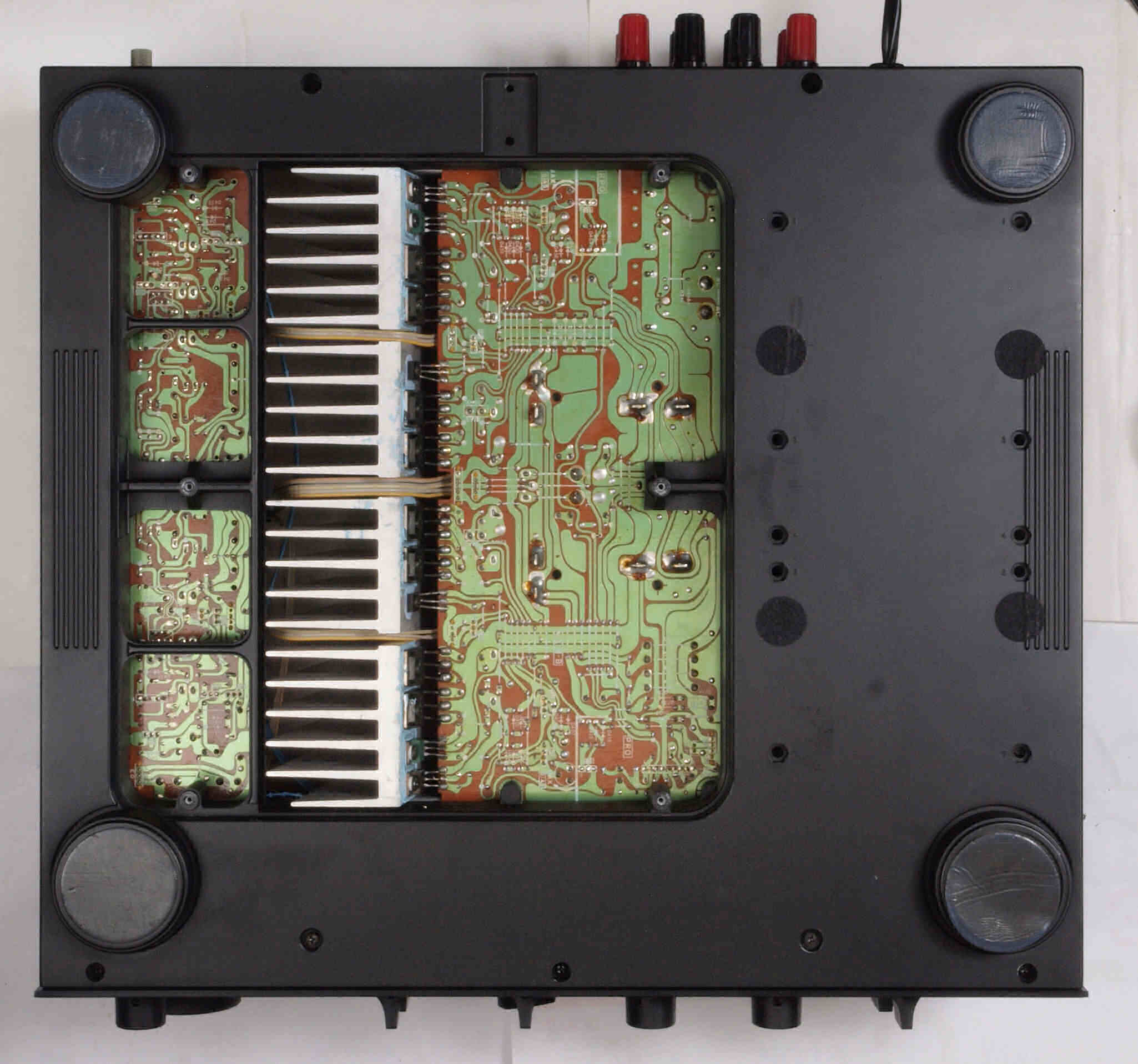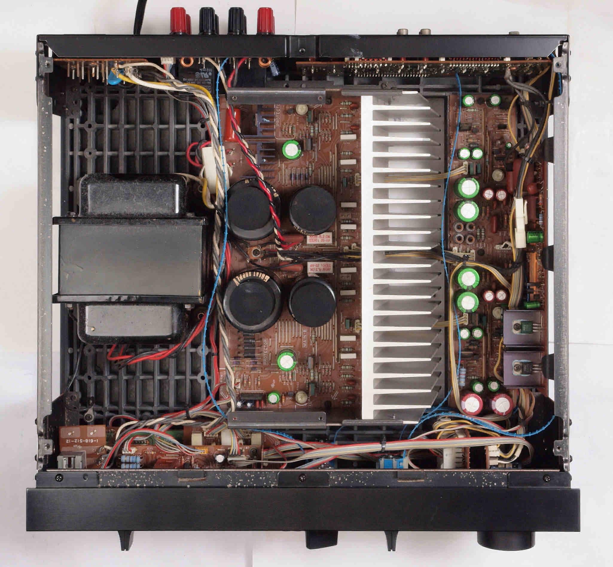 A18. 点検中 終段AMP基板。 左側ヒューズ入抵抗は全滅。