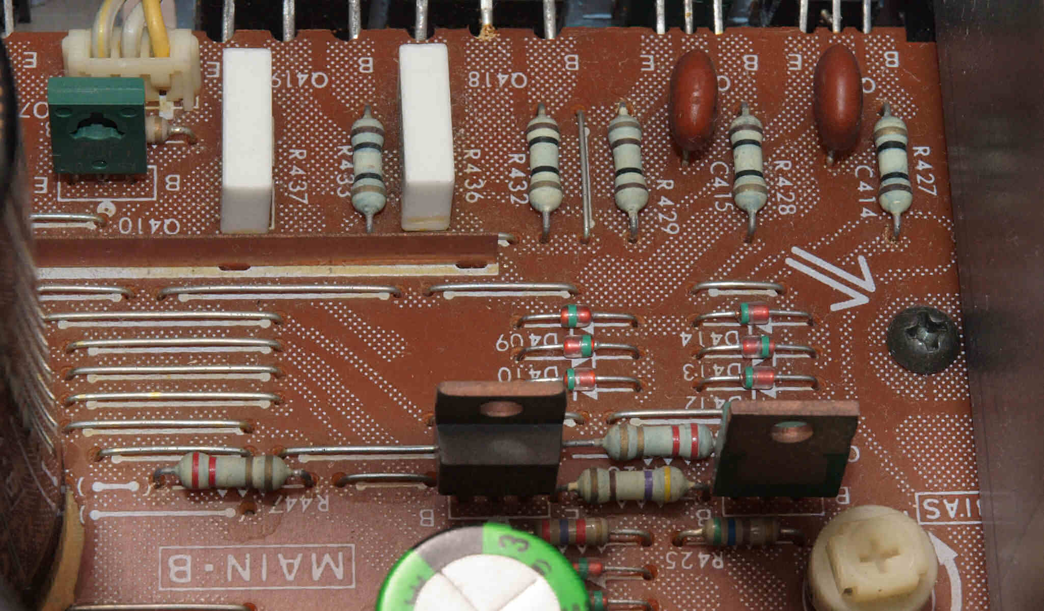 A19. 点検中 終段AMP基板。 右側ヒューズ入抵抗は全滅。