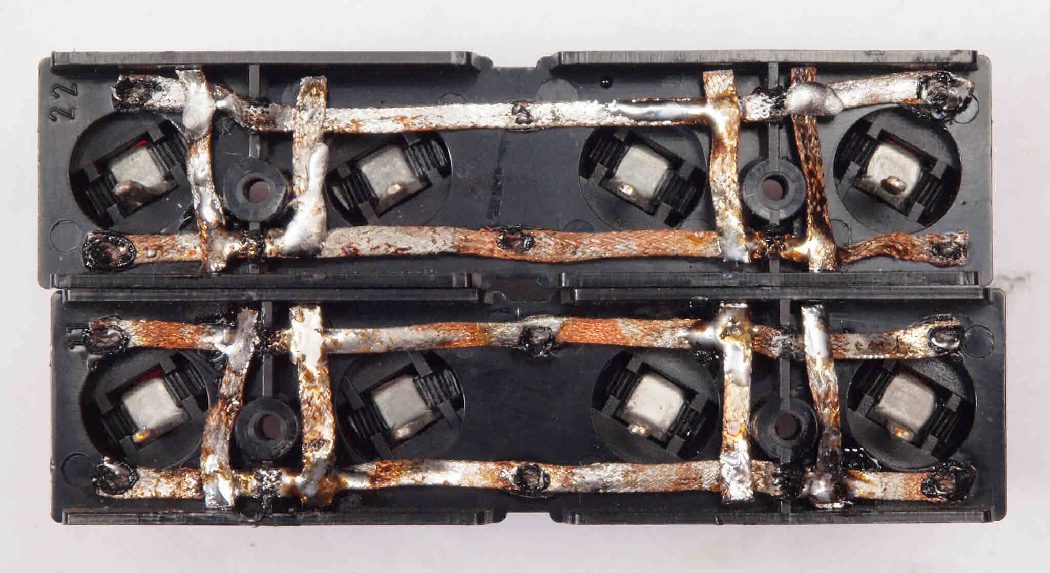 CJ2. 修理(半田補正)後 ヒューズ&コンセント基板裏、  全ての半田をやり修す。