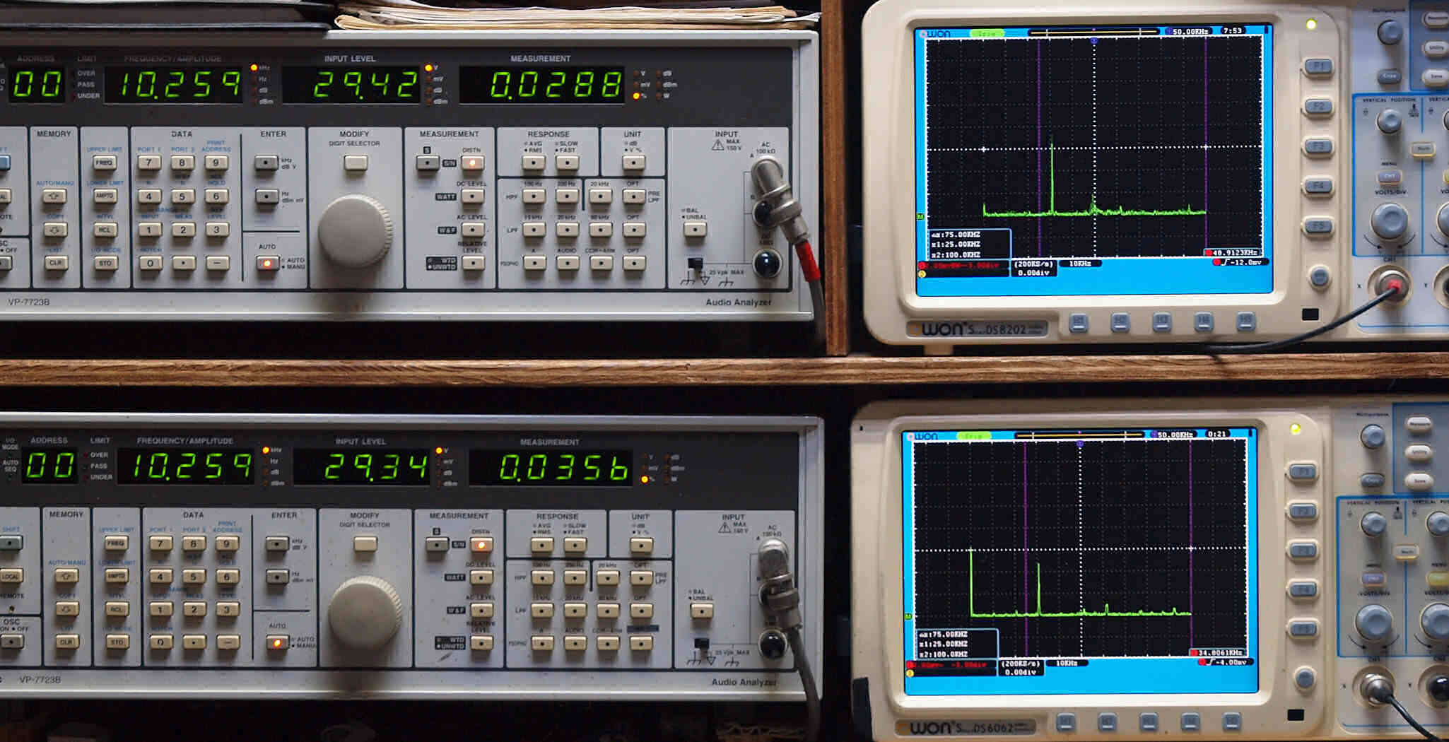 上段右端 VP−7723Bの基本波除去出力を「owon SDS8202(200MHZ)」で「FFT分析」表示。