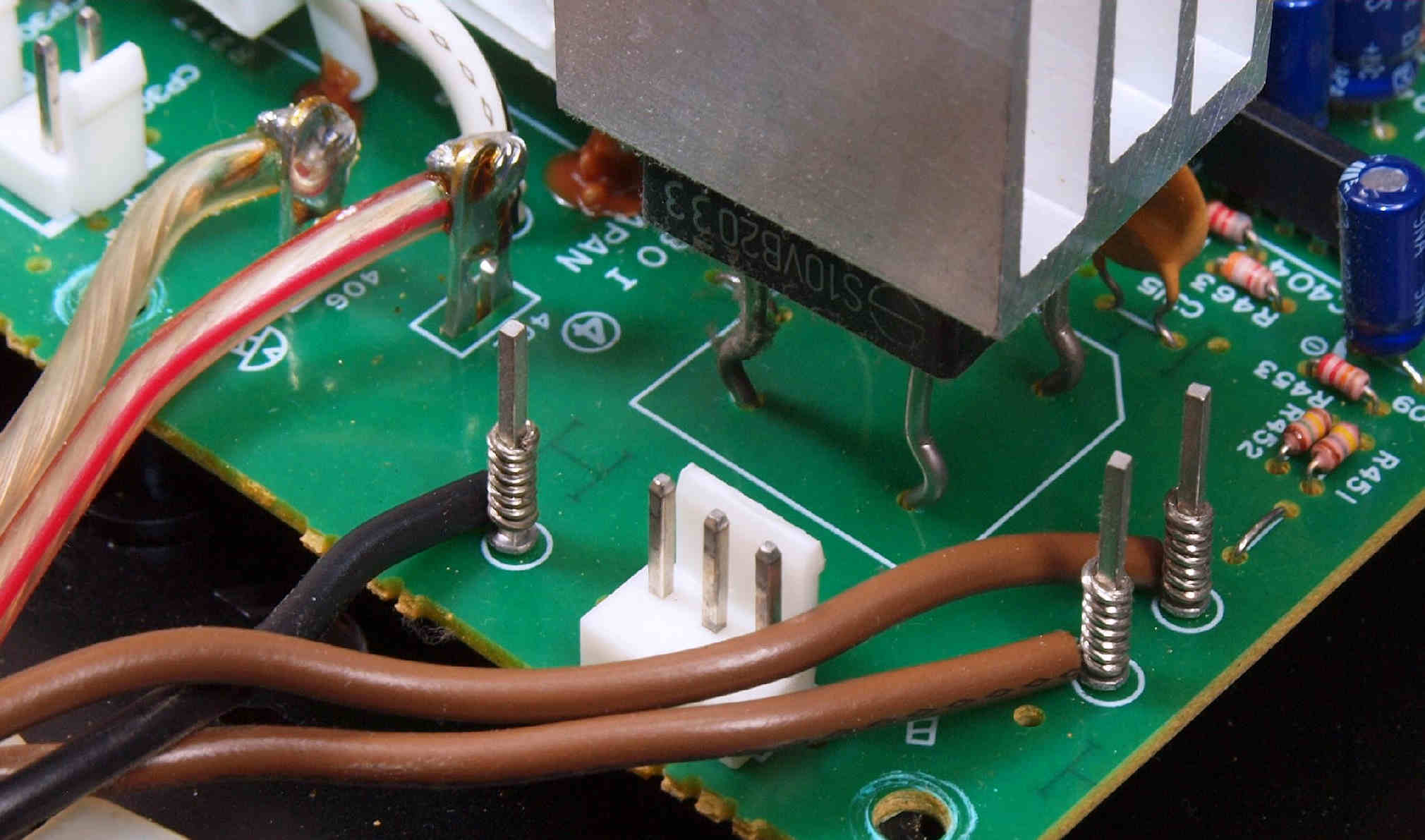 C14. 修理(半田補正)後 入力端子基板裏。 半田を全部やり直す、フイルムコンデンサー2個追加。