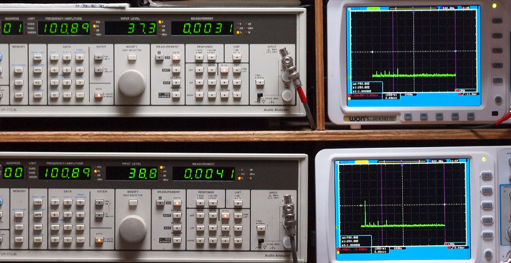 | E. 測定・調整。 画像をクリックすると、大きく(横幅2050ドット)表示されます。 E1. 出力・歪み率測定・調整 「見方」。 上段中 右側SP出力を「Audio Analyzer Panasonic VP−7723B」により測定。 表示LED、 左端=メモリーNo、 中左=周波数測定、 中右=出力電圧測定、 右端=歪み率測定。 上段右端 VP−7723Bの基本波除去出力を「owon SDS8202(200MHZ)」で「FFT分析」表示。 下段中 左側SP出力を「Audio Analyzer Panasonic VP−7723B」により測定。 表示LED、 左端=メモリーNo、 中左=周波数測定、 中右=出力電圧測定、 右端=歪み率測定。 下段右端 VP−7723Bの基本波除去出力を「owon SDS6062(200MHZ)」で「FFT分析」表示。 下段左端 オーディオ発振器 VP−7201A より50Hz〜100kHzの信号を出し(歪み率=約0.003%)、ATT+分配器を通し、AMPに入力。 よって、ダイアル設定出力レベルより低くなります。測定機器の仕様や整備の様子はこちら、「VP−7723B」「VP−7201A」。 FFT画面の見方はこちら。 |