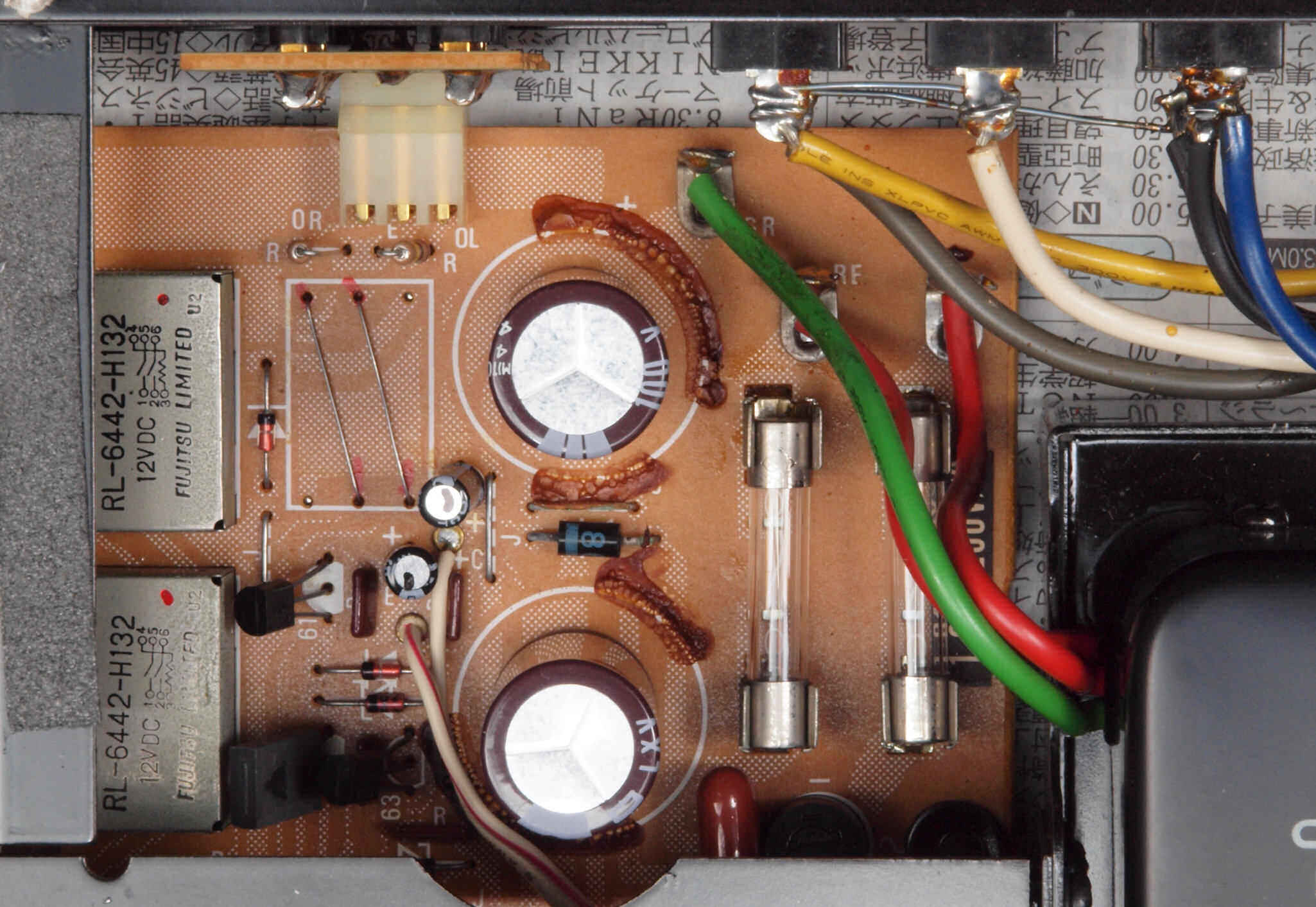| C48. 修理前 EQ−AMP基板電解コンデンサー固定するトルエン溶媒の接着剤2。ジャンパー線を腐食する。 | ||||||||||||||||||||||||||||||||||||||||||||||