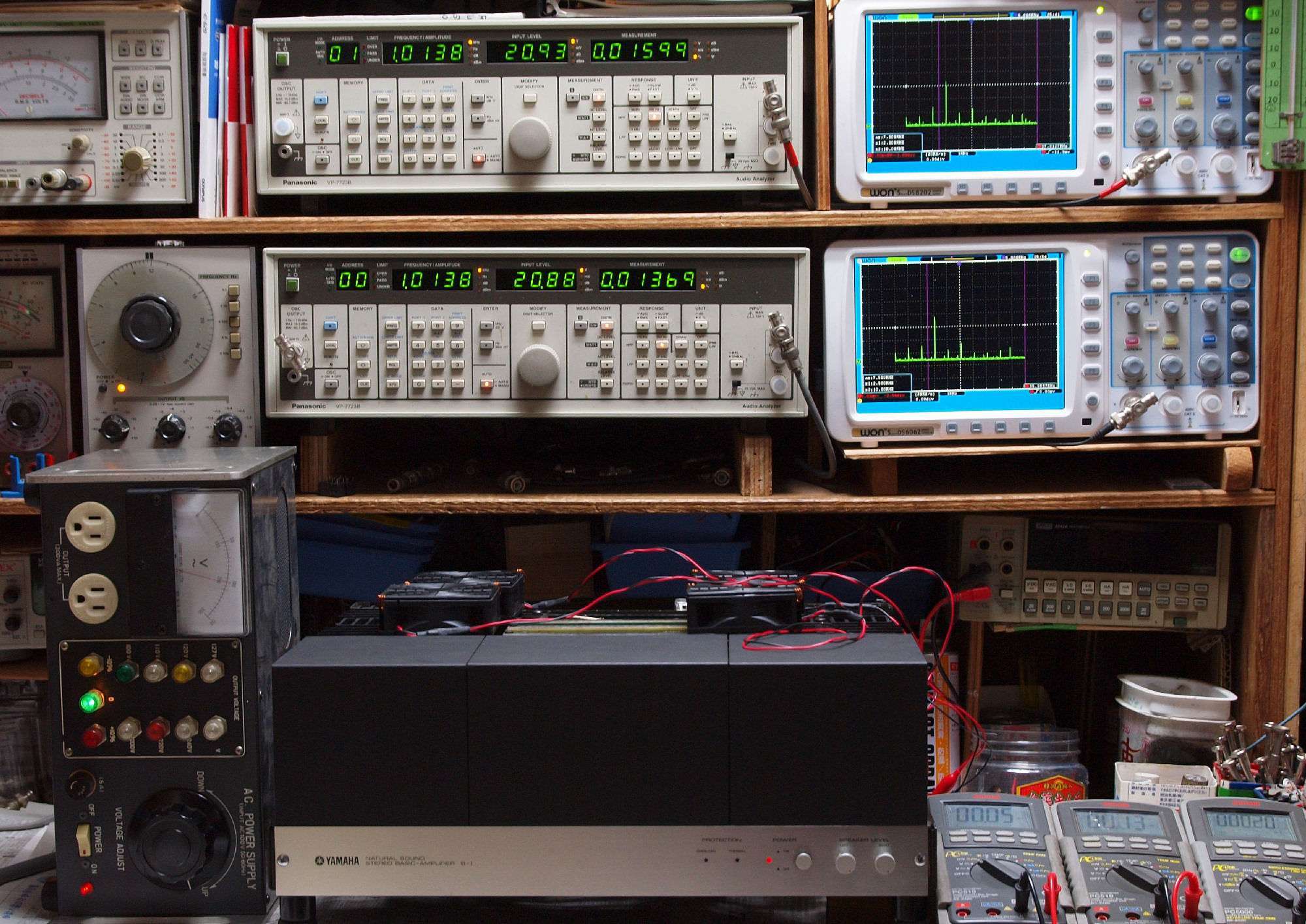 | E. 測定・調整 E1. 出力・歪み率測定・調整 「見方」。 上段中 右側SP出力を「Audio Analyzer Panasonic VP−7723B」により測定。 表示LED、 左端=メモリーNo、 中左=周波数測定、 中右=出力電圧測定、 右端=歪み率測定。 上段右端 VP−7723Bの基本波除去出力を「owon SDS8202(200MHZ)」で「FFT分析」表示。 下段中 左側SP出力を「Audio Analyzer Panasonic VP−7723B」により測定。 表示LED、 左端=メモリーNo、 中左=周波数測定、 中右=出力電圧測定、 右端=歪み率測定。 下段右端 VP−7723Bの基本波除去出力を「owon SDS6062(200MHZ)」で「FFT分析」表示。 下段左端 オーディオ発振器 VP−7201A より50Hz〜100kHzの信号を出し(歪み率=約0.003%)、ATT+分配器を通し、AMPに入力。 よって、ダイアル設定出力レベルより低くなります。測定機器の仕様や整備の様子はこちら、「VP−7723B」「VP−7201A」。 FFT画面の見方はこちら。 右は、AC100V入力電圧可変(スライダック)、アイドル電流設定に使用する。 |