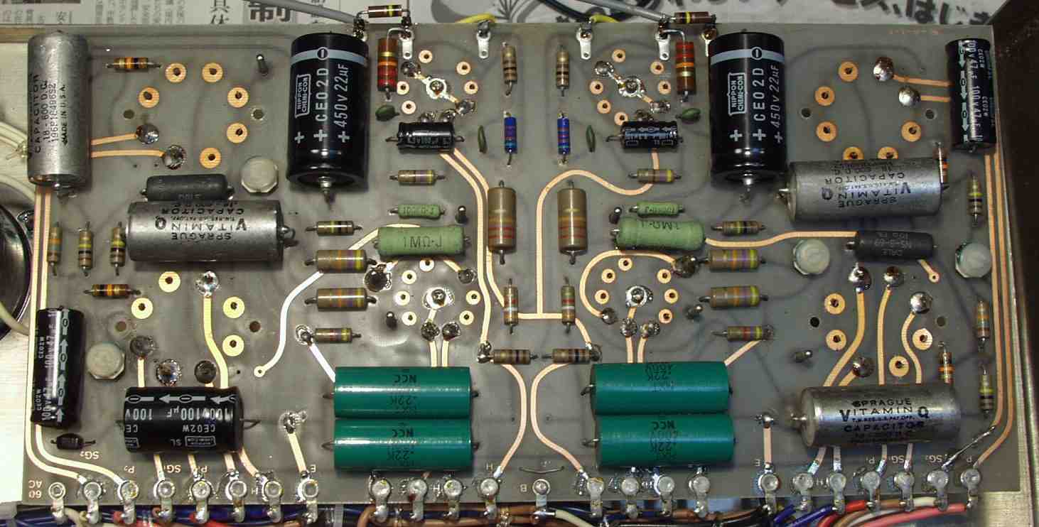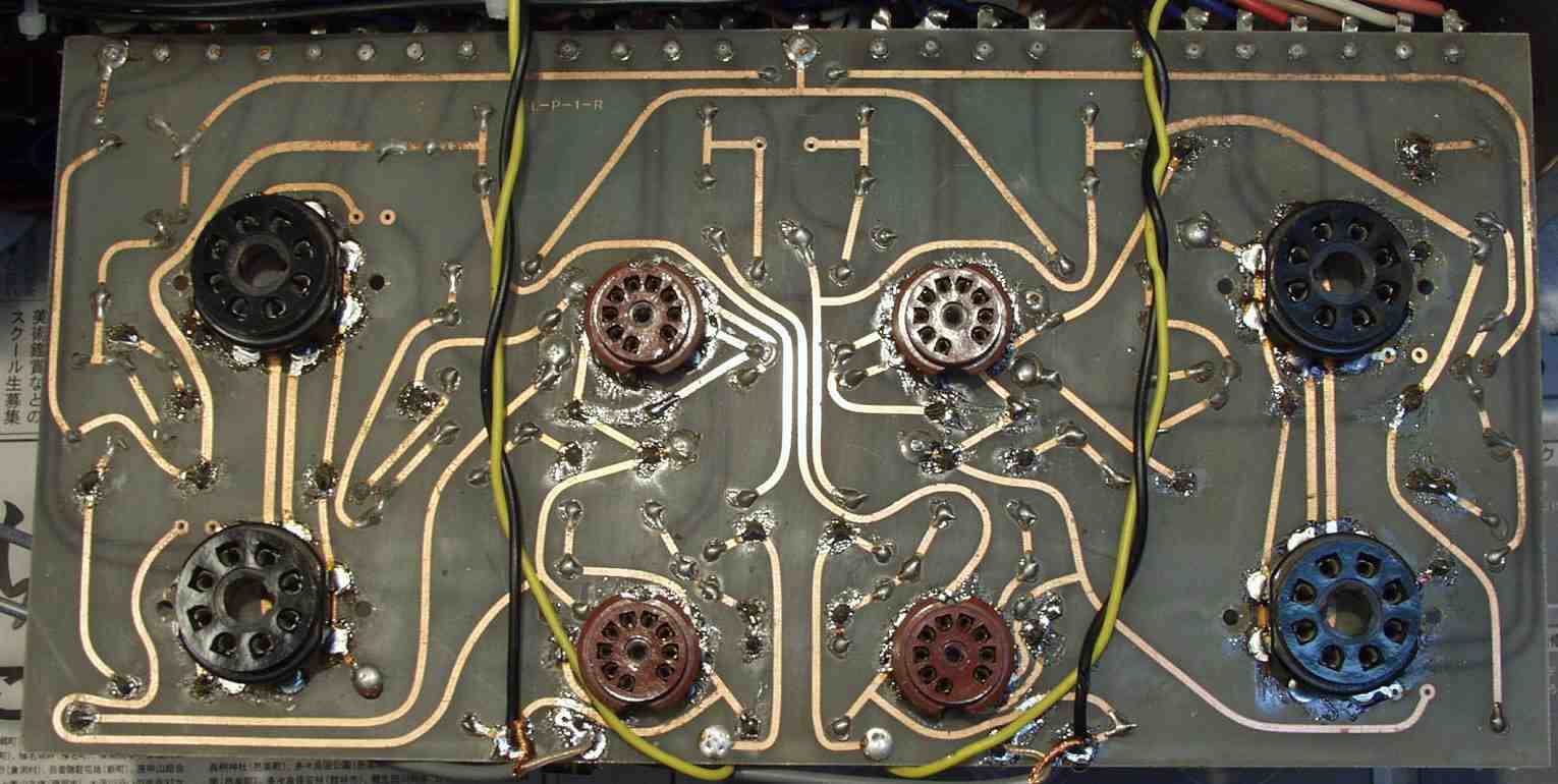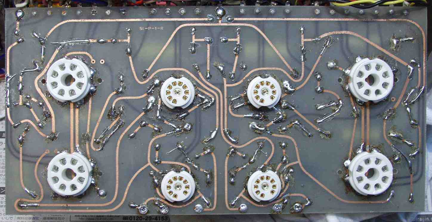 | C1C. 修理後 AMP基板 KT88のソケットは、放熱の為に、十分に半田を盛る |