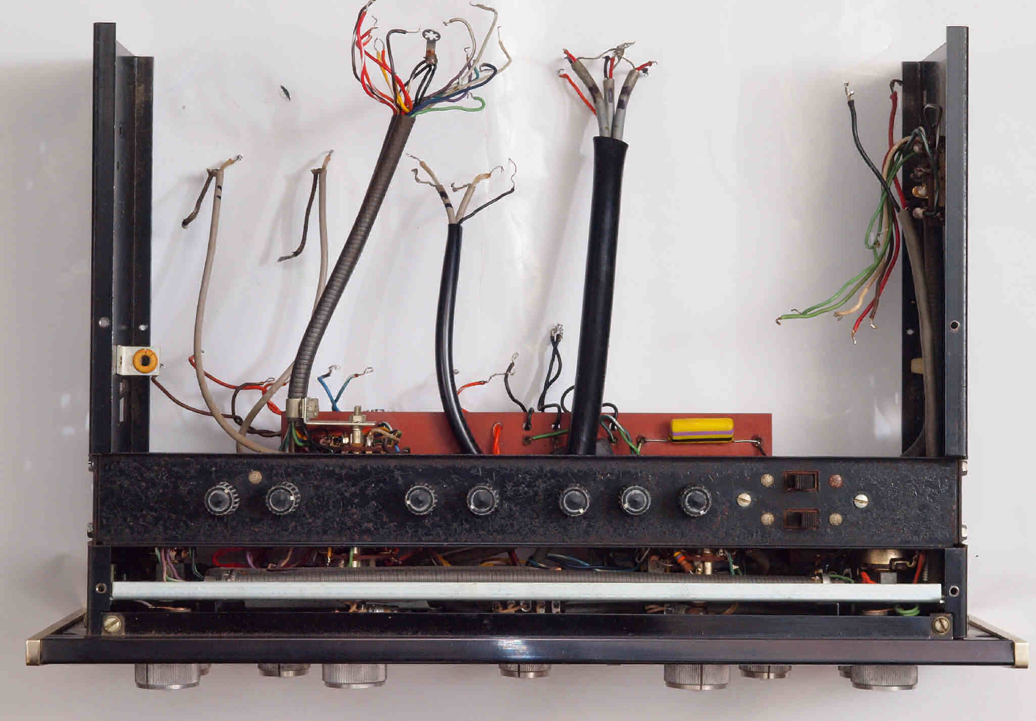 C12. 修理中 真空管基板、電源シャシ、前パネルを外して修理する。 下から見る。