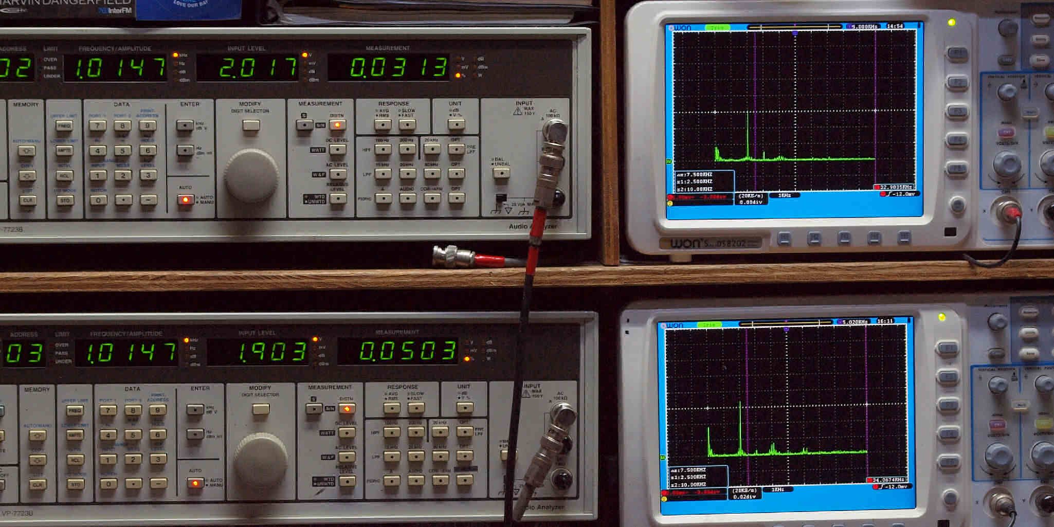 上段右端 VP−7723Bの基本波除去出力を「owon SDS8202(200MHZ)」で「FFT分析」表示。