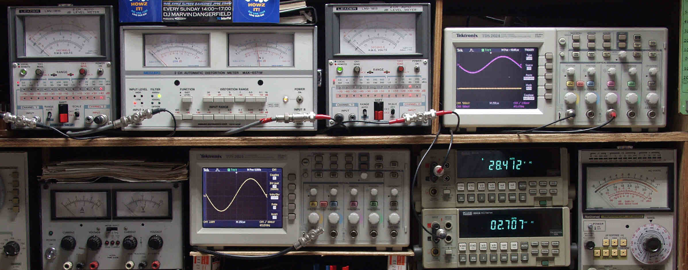 | T. 修理前の測定 T1. 出力・歪み率測定 <見方> 下段左端 オーディオ発振器より400HZ・1KHZの信号を出し(歪み率=約0.003%)これをAMPに入力し、出力を測定 下段中左 オシロ=入力波形(オーディオ発振器のTTLレベル) 下段中右上=周波数計 上段左端 電圧計=L側出力電圧測定、黒針のみ使用 上段中左 歪み率計=出力の歪み率測定 左メータ=L出力、右メータ=R出力 上段中右 電圧計=R側出力電圧測定、赤針のみ使用 上段右端 オシロ=出力波形 上=R出力、下=L出力(実際にはRL電圧計の出力「Max1V」を観測) 下段中右上 デジタル電圧計=R出力電圧測定 下段中右下 デジタル電圧計=L出力電圧測定 |