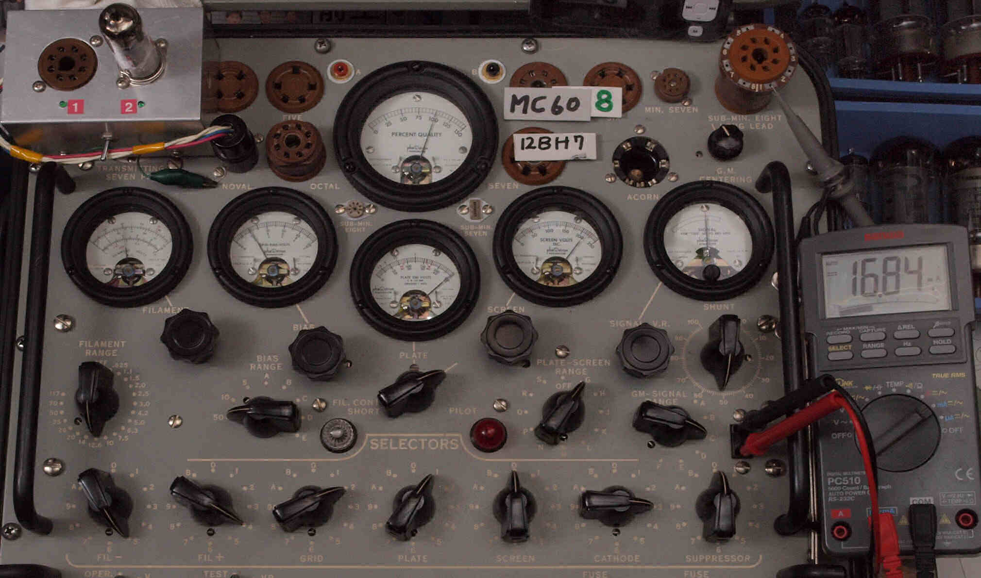 | U21. 付属真空管「12BH7」ユニット1。 Gm測定=4000μmho、Ip=16.84mA。 測定条件、「Ep=250V、Eg1=−10.5V」、Cレンジ=6000μmhoレンジでの測定。 |