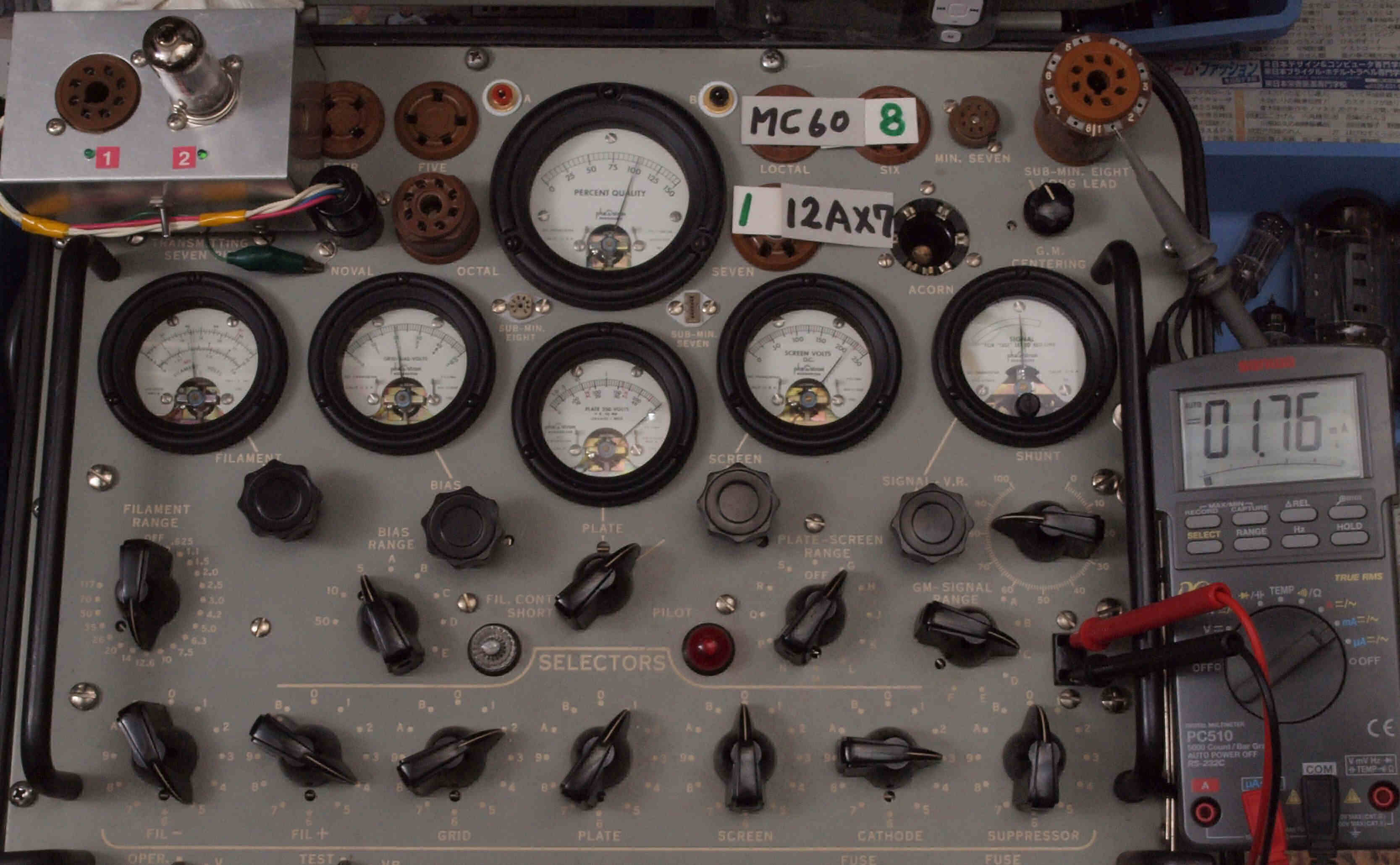 | U. TubeTester HickokTV−2B/Uによる付属真空管測定。 画像をクリックすると、大きく(横幅2050ドット)表示されます。 U1. 付属真空管、左から 12AX7、12BH7、ECC82、12AX7。 真空管ハンドブック(規格表)の、 12AX7 相互コンダクタンス=1600μmho「Ep=250V、Eg1=−2V、Ip=1.2mA」 12BH7 相互コンダクタンス=3100μmho「Ep=250V、Eg1=−10.5V、IP=11.5mA」 ECC82 相互コンダクタンス=2200μmho「Ep=250V、Eg1=−8.5V、IP=10.5mA」1960/1962/1964/1966ナショナル真空管ハンドブック、1995オーディオ用真空管マニアル、60/62/69東芝電子管ハンドブック、1962日立電子管ハンドブック、1965/1971全日本真空管マニュアル、RC15/19/26/27/28/29/30 Receiving Tube Manual、1966実用真空管ハンドブック、1995世界の真空管カタログより。 |