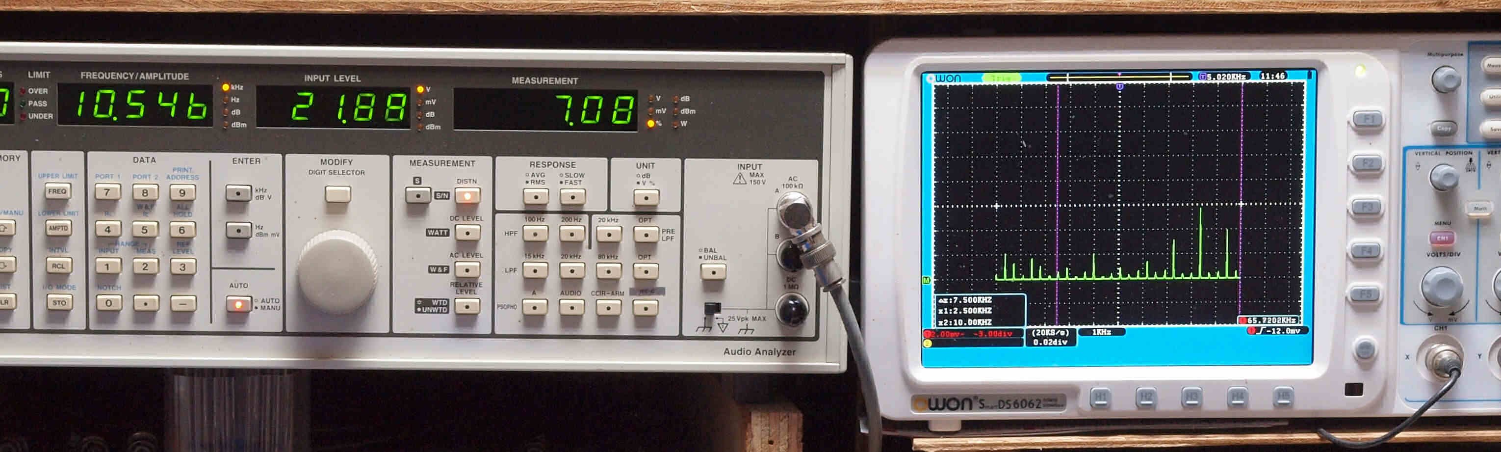 | T. 修理前の測定。 画像をクリックすると、大きく(横幅2050ドット)表示されます。 T1. 出力・歪み率測定・調整、 電源電圧=115V。 「見方」。 中=SP出力を「Audio Analyzer Panasonic VP−7723B」により測定。 表示LED、 左端=メモリーNo、 中左=周波数測定、 中右=出力電圧測定、 右端=歪み率測定。 右端=VP−7723Bの基本波除去出力を「owon SDS6062(200MHZ)」で「FFT分析」表示。 左端=オーディオ発振器 VP−7201A より50Hz〜100kHzの信号を出し(歪み率=約0.003%)、ATT+分配器を通し、AMPに入力。 よって、ダイアル設定出力レベルより低くなります。測定機器の仕様や整備の様子はこちら、「VP−7723B」「VP−7201A」。 FFT画面の見方はこちら。 |