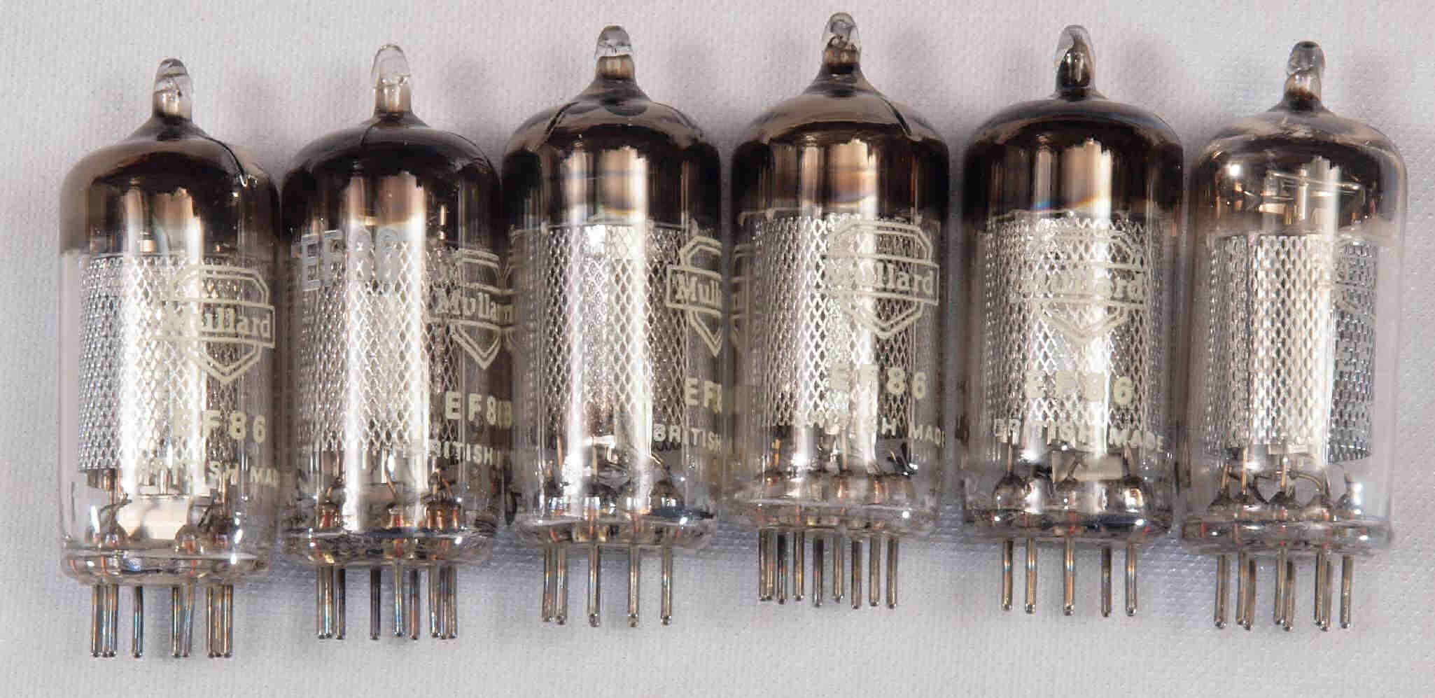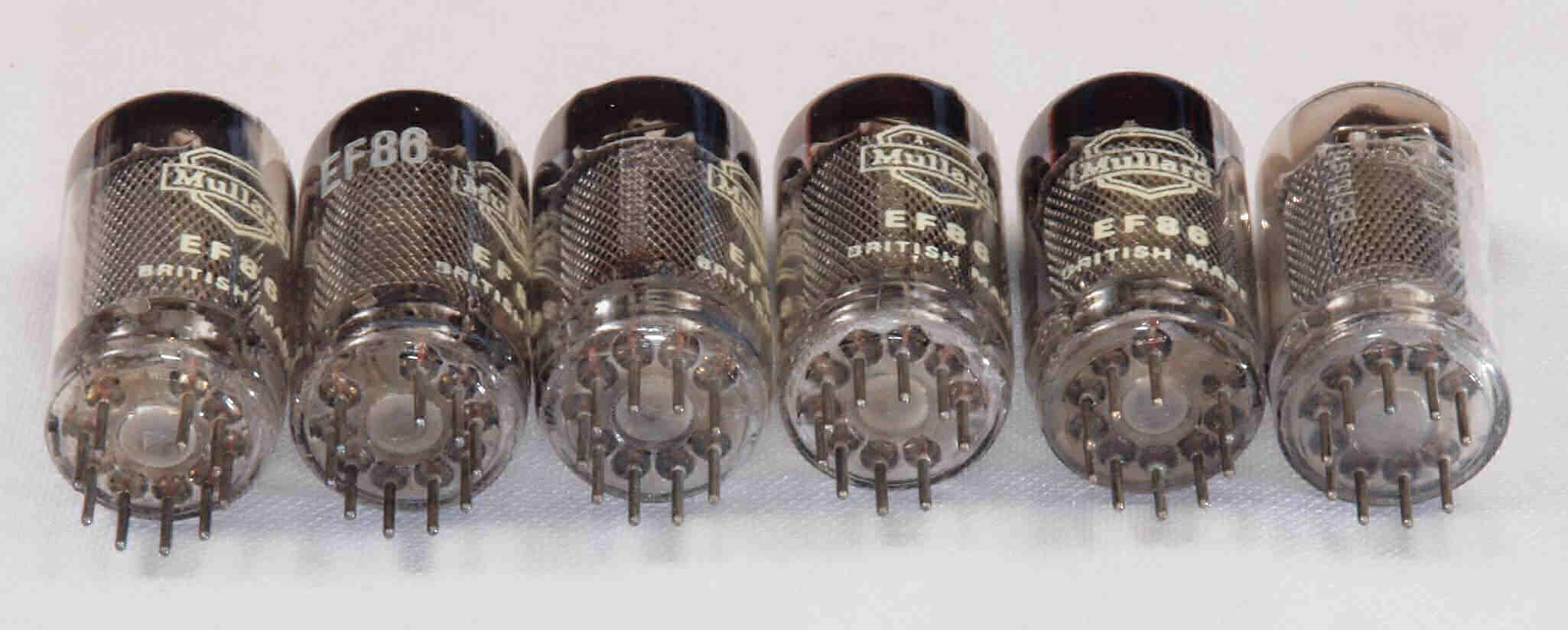 | *予備真空管「EF86(6267)」。 左から、1本目、2本目、、、、6本目。 |
