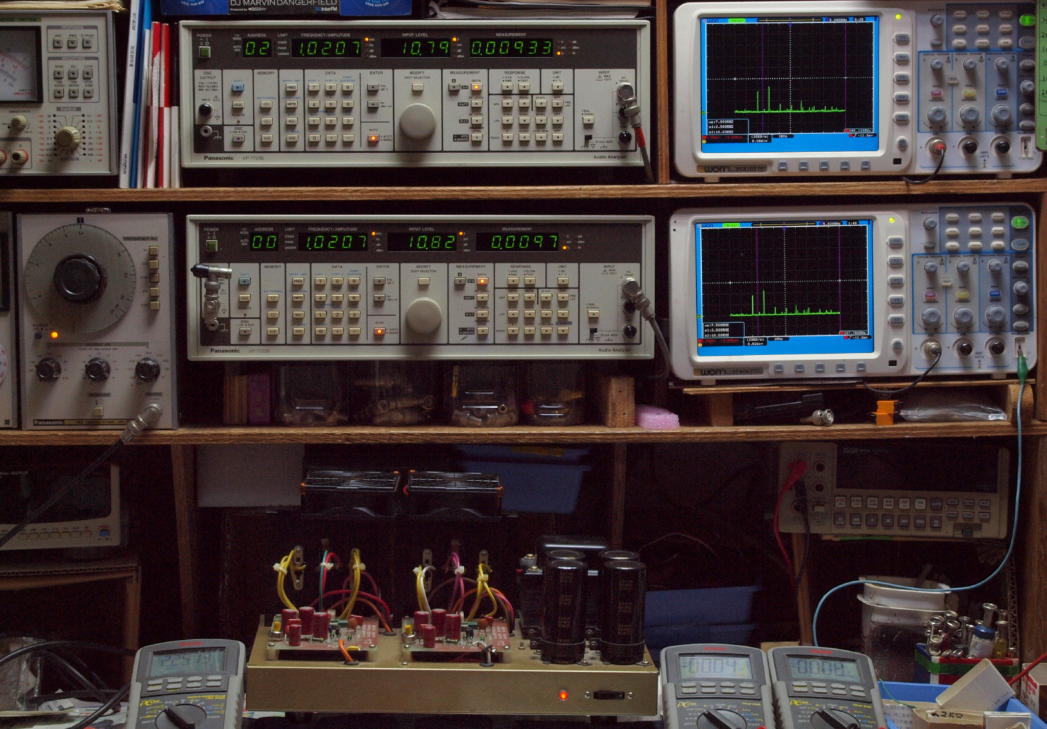 下段左端 オーディオ発振器 VP−7201A より50Hz〜100kHzの信号を出し(歪み率=約0.003%)、ATT+分配器を通し、AMPに入力。