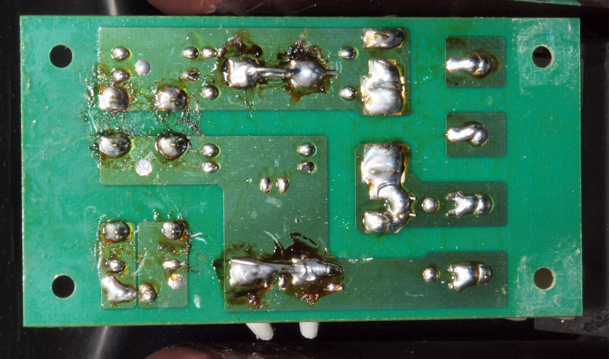 | CF5. 修理前 突入電源抑制回路基板裏。 抵抗とリレーが交換してあるが汚い半田付け! | ||||||||||||||||||||||||||||||||||||||||||||||