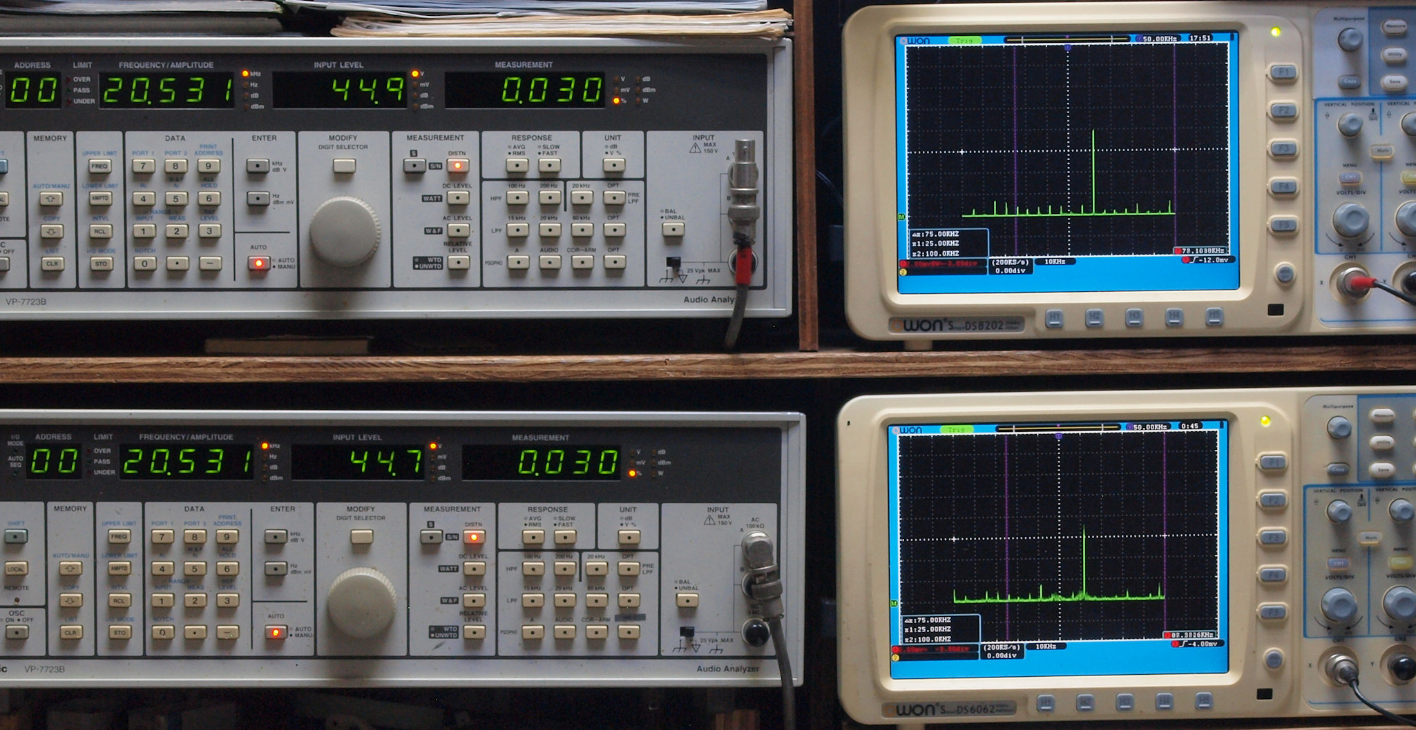 | E. 測定・調整。 画像をクリックすると、大きく(横幅2050ドット)表示されます。 E0. 出力・歪み率測定・調整 「見方」。 上段中 右側SP出力を「Audio Analyzer Panasonic VP−7723B」により測定。 表示LED、 左端=メモリーNo、 中左=周波数測定、 中右=出力電圧測定、 右端=歪み率測定。 上段右端 VP−7723Bの基本波除去出力を「owon SDS8202(200MHZ)」で「FFT分析」表示。 下段中 左側SP出力を「Audio Analyzer Panasonic VP−7723B」により測定。 表示LED、 左端=メモリーNo、 中左=周波数測定、 中右=出力電圧測定、 右端=歪み率測定。 下段右端 VP−7723Bの基本波除去出力を「owon SDS6062(200MHZ)」で「FFT分析」表示。 下段左端 オーディオ発振器 VP−7201A より50Hz〜100kHzの信号を出し(歪み率=約0.003%)、ATT+分配器を通し、AMPに入力。 よって、ダイアル設定出力レベルより低くなります。測定機器の仕様や整備の様子はこちら、「VP−7723B」「VP−7201A」。 FFT画面の見方はこちら。 |