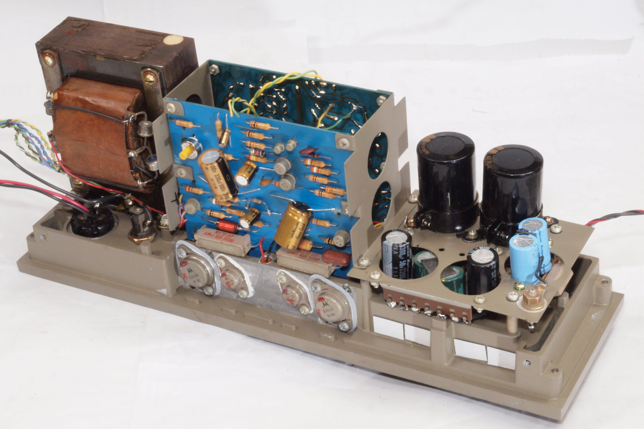 | C. 修理状況。 画像をクリックすると、大きく(横幅2050ドット)表示されます。 C1. 修理中 取り出したメインアンプ部+電源部 |