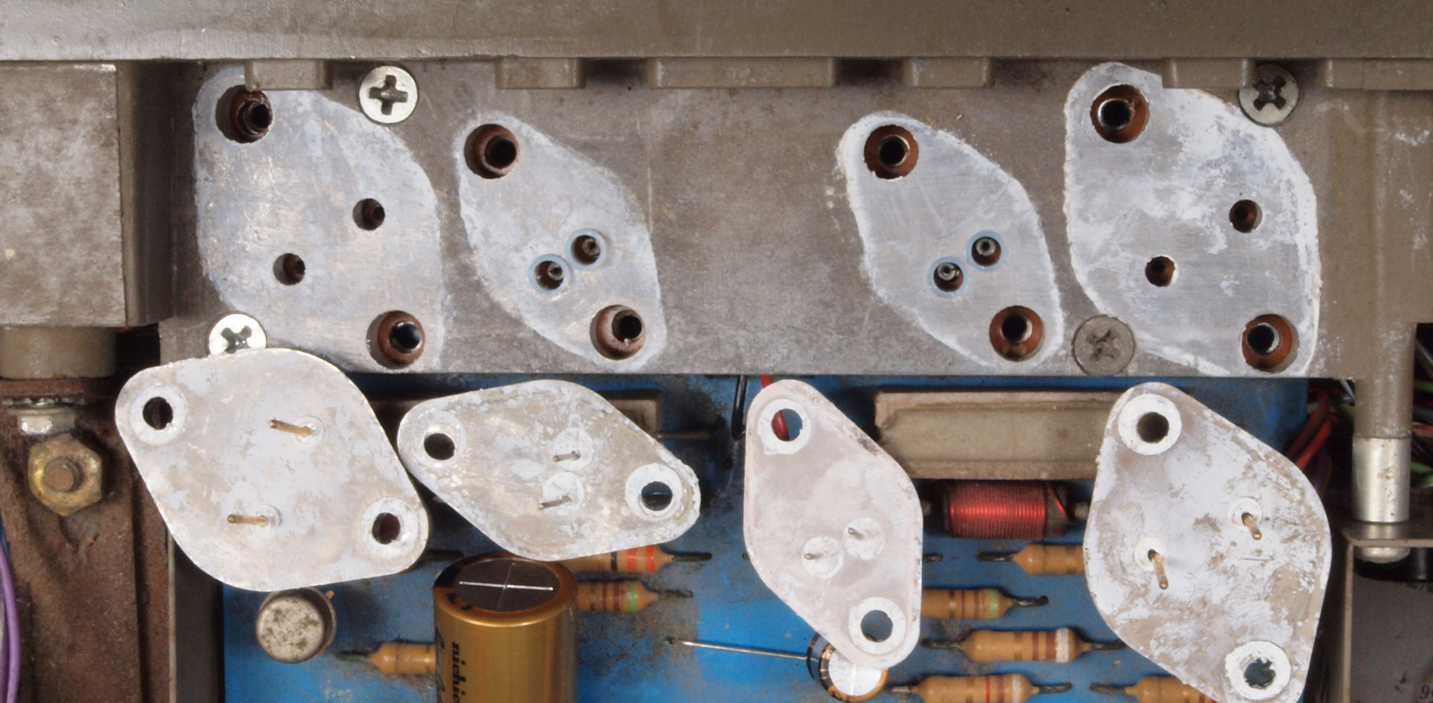 C13. 修理前 CH_A側終段TR(トランジスター)、 上側なので放熱シリコンがカラカラ!