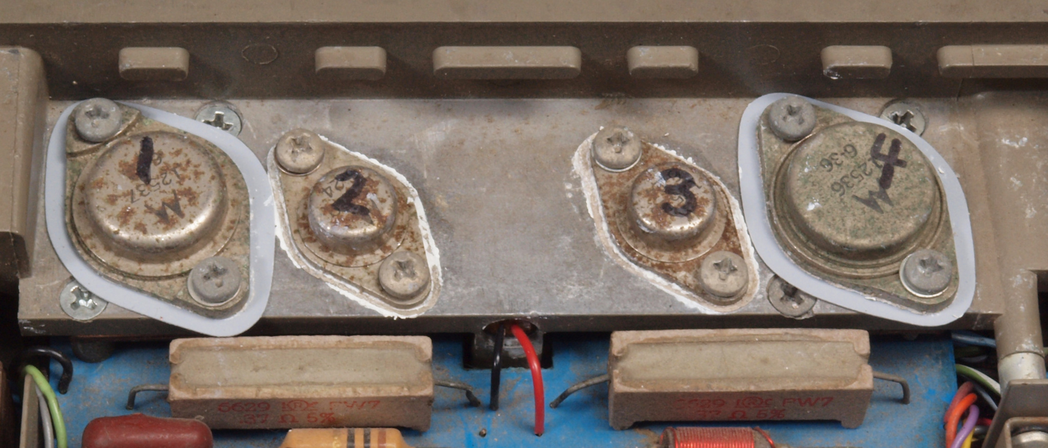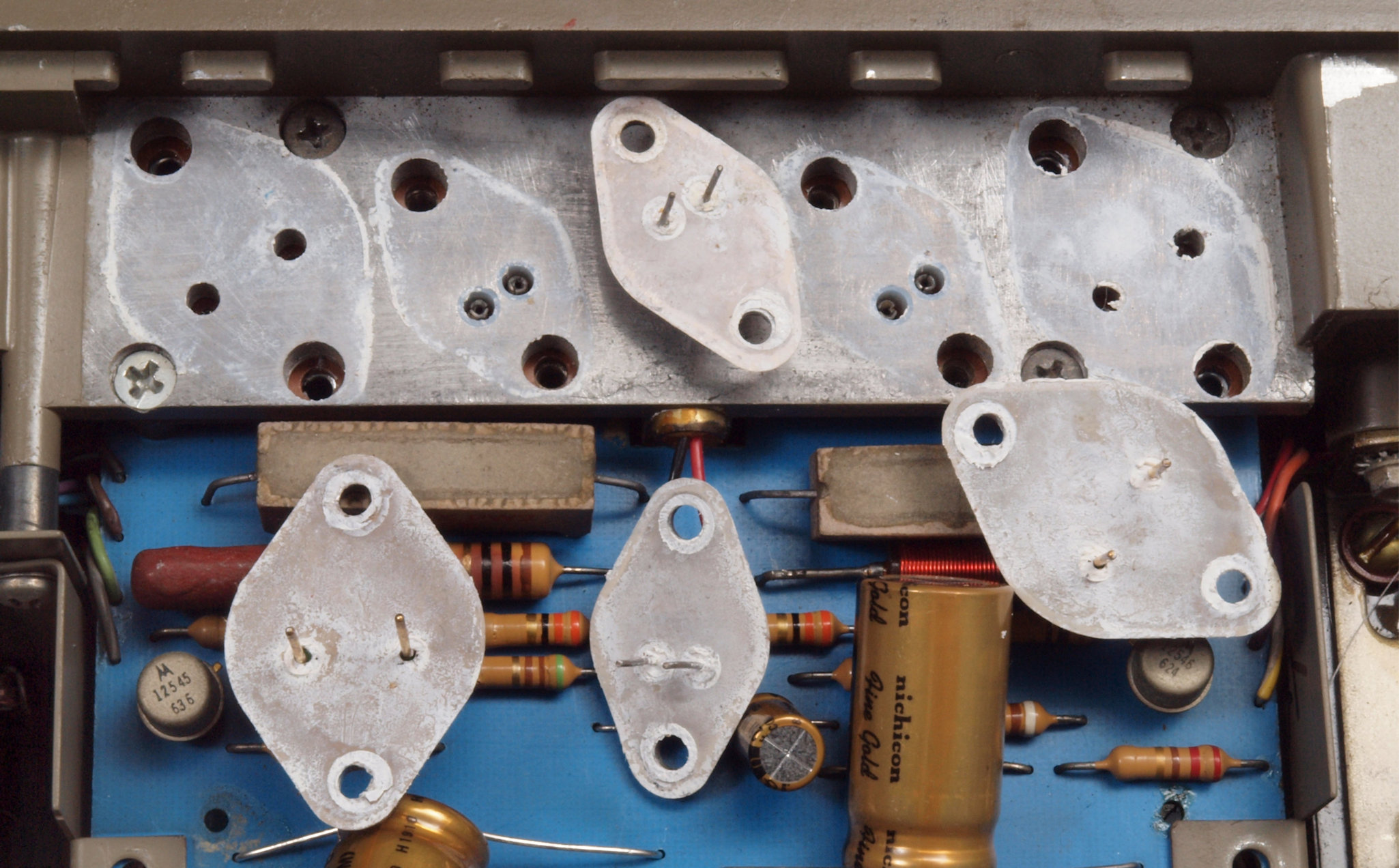 | C13. 修理前 CH_A側終段TR(トランジスター)、 上側なので放熱シリコンがカラカラ! | ||||||||||||||||||||||||||