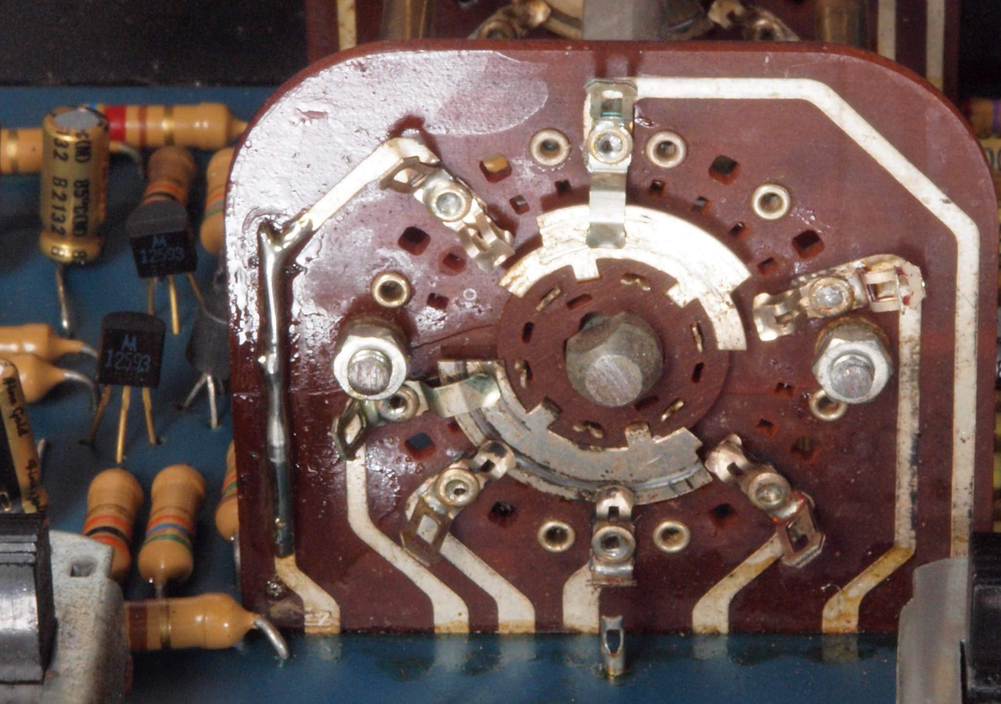 A31. 点検中 上蓋を取り、上から見る。埃が一杯、湿度の高い所にあったのか、トランスの鉄心が腐蝕。終段TR(トランジスター)、前段TR(トランジスター)腐蝕。