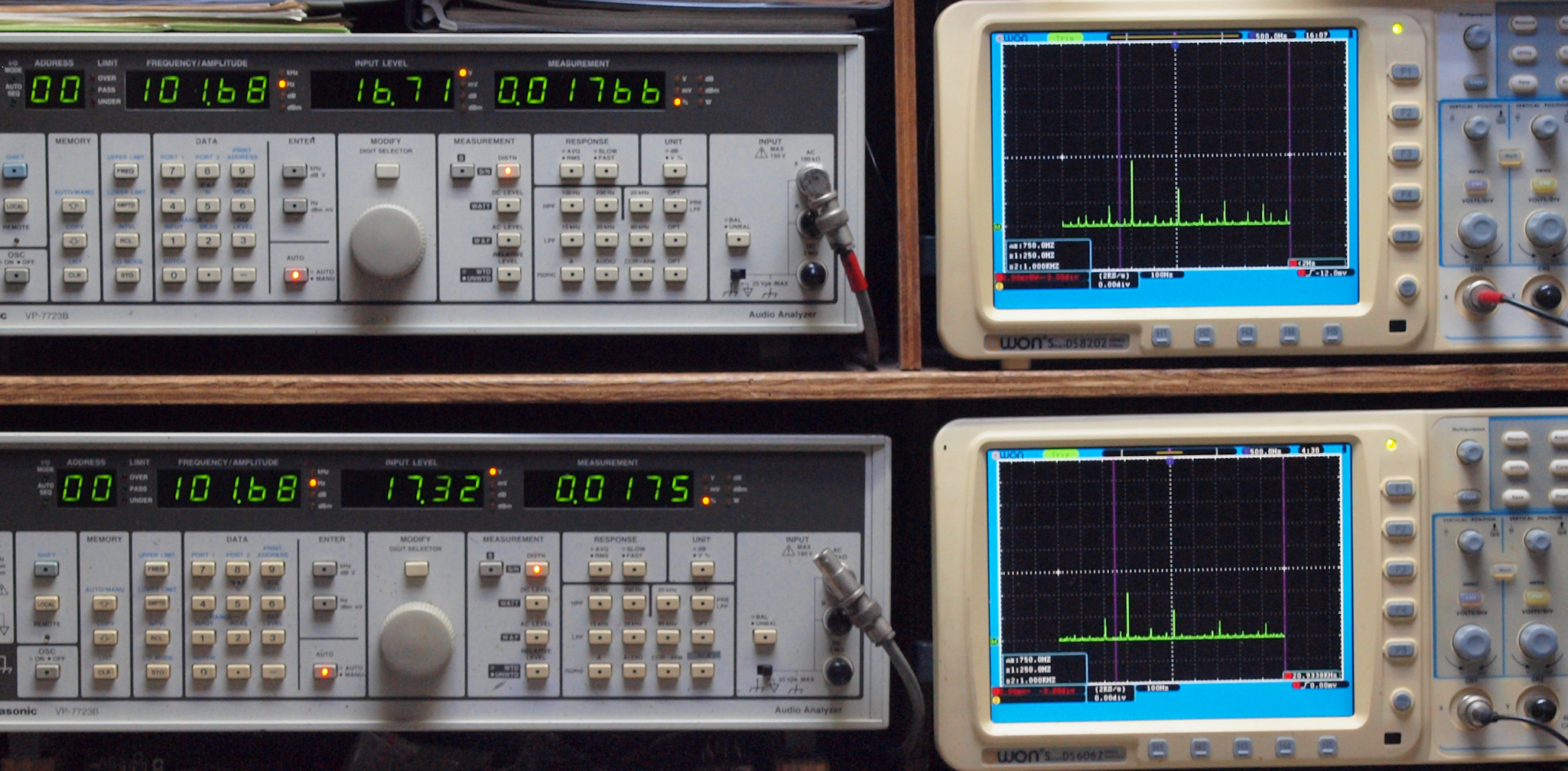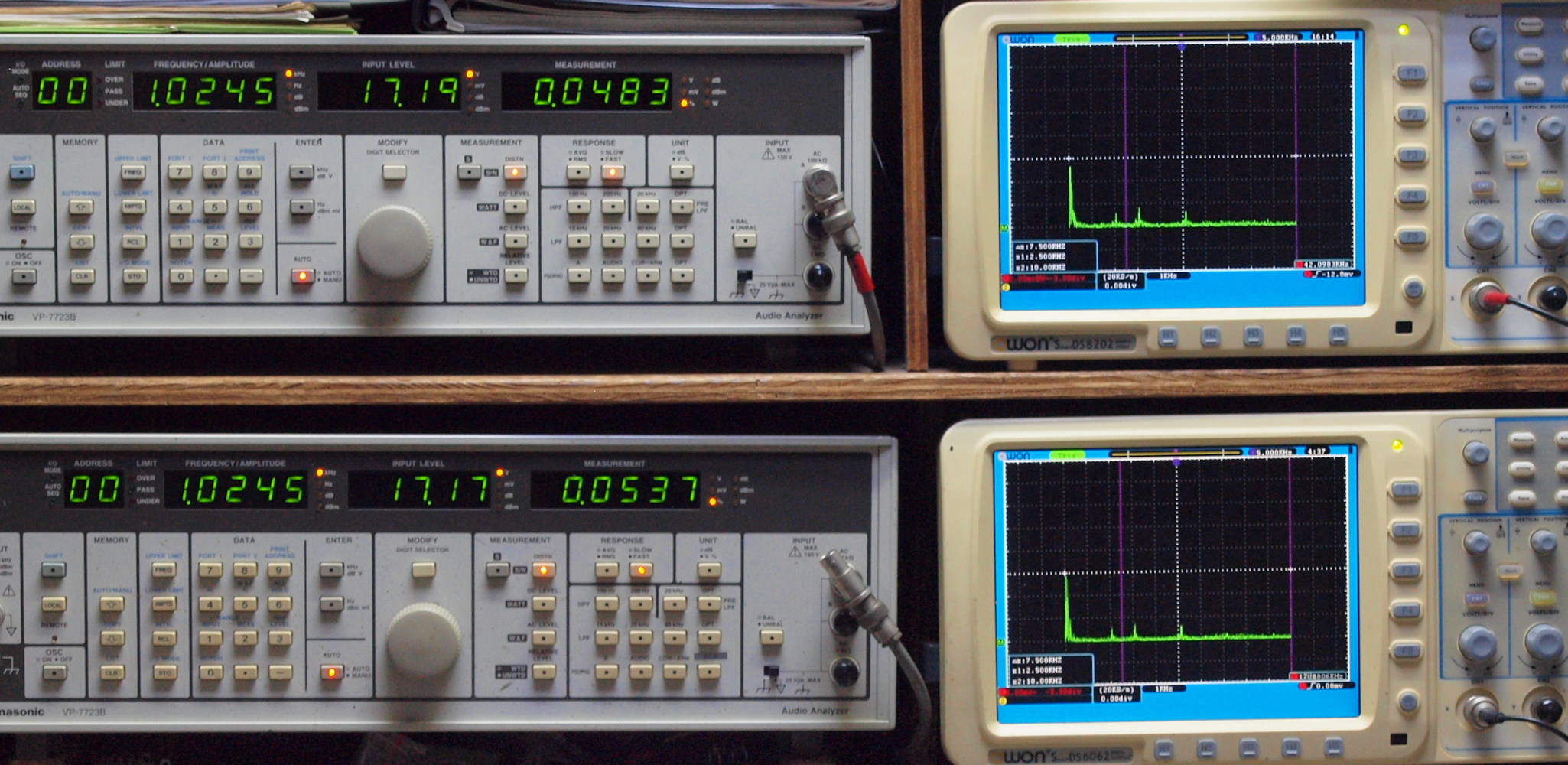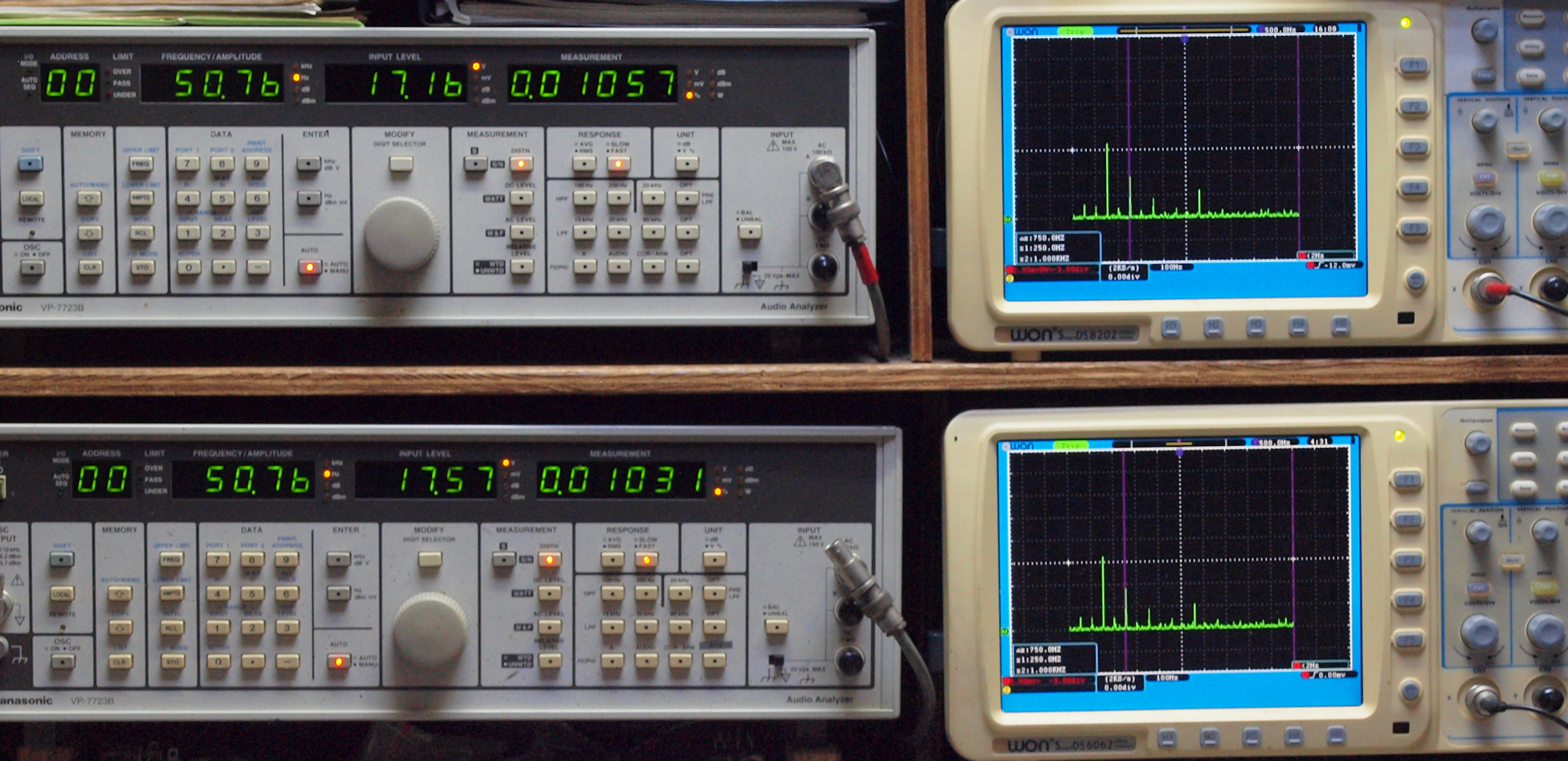 | E. 測定・調整。 画像をクリックすると、大きく(横幅2050ドット)表示されます。 E0. 出力・歪み率測定・調整。 供給電圧はAC100V/50HZ。 「見方」。 上段中 右側SP出力を「Audio Analyzer Panasonic VP−7723B」により測定。 表示LED、 左端=メモリーNo、 中左=周波数測定、 中右=出力電圧測定、 右端=歪み率測定。 上段右端 VP−7723Bの基本波除去出力を「owon SDS8202(200MHZ)」で「FFT分析」表示。 下段中 左側SP出力を「Audio Analyzer Panasonic VP−7723B」により測定。 表示LED、 左端=メモリーNo、 中左=周波数測定、 中右=出力電圧測定、 右端=歪み率測定。 下段右端 VP−7723Bの基本波除去出力を「owon SDS6062(200MHZ)」で「FFT分析」表示。 下段左端 オーディオ発振器 VP−7201A より50Hz〜100kHzの信号を出し(歪み率=約0.003%)、ATT+分配器を通し、AMPに入力。 よって、ダイアル設定出力レベルより低くなります。測定機器の仕様や整備の様子はこちら、「VP−7723B」「VP−7201A」。 FFT画面の見方はこちら。 |