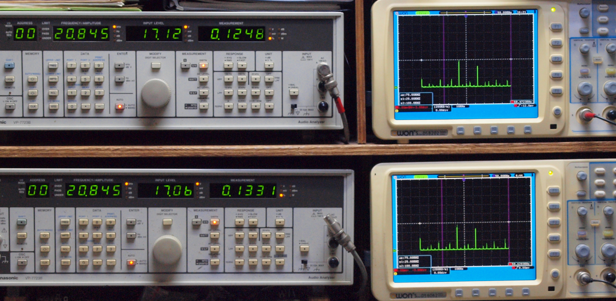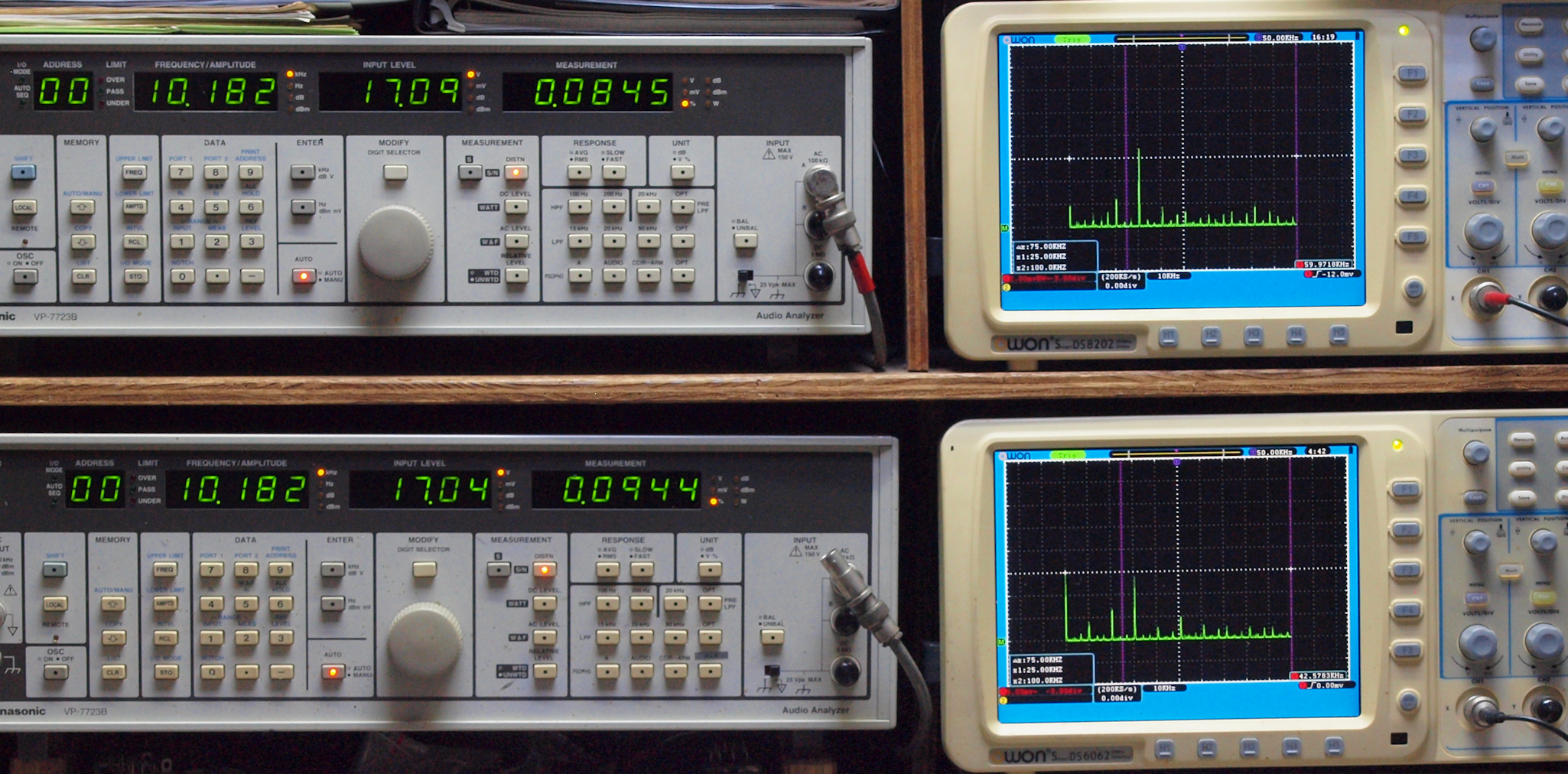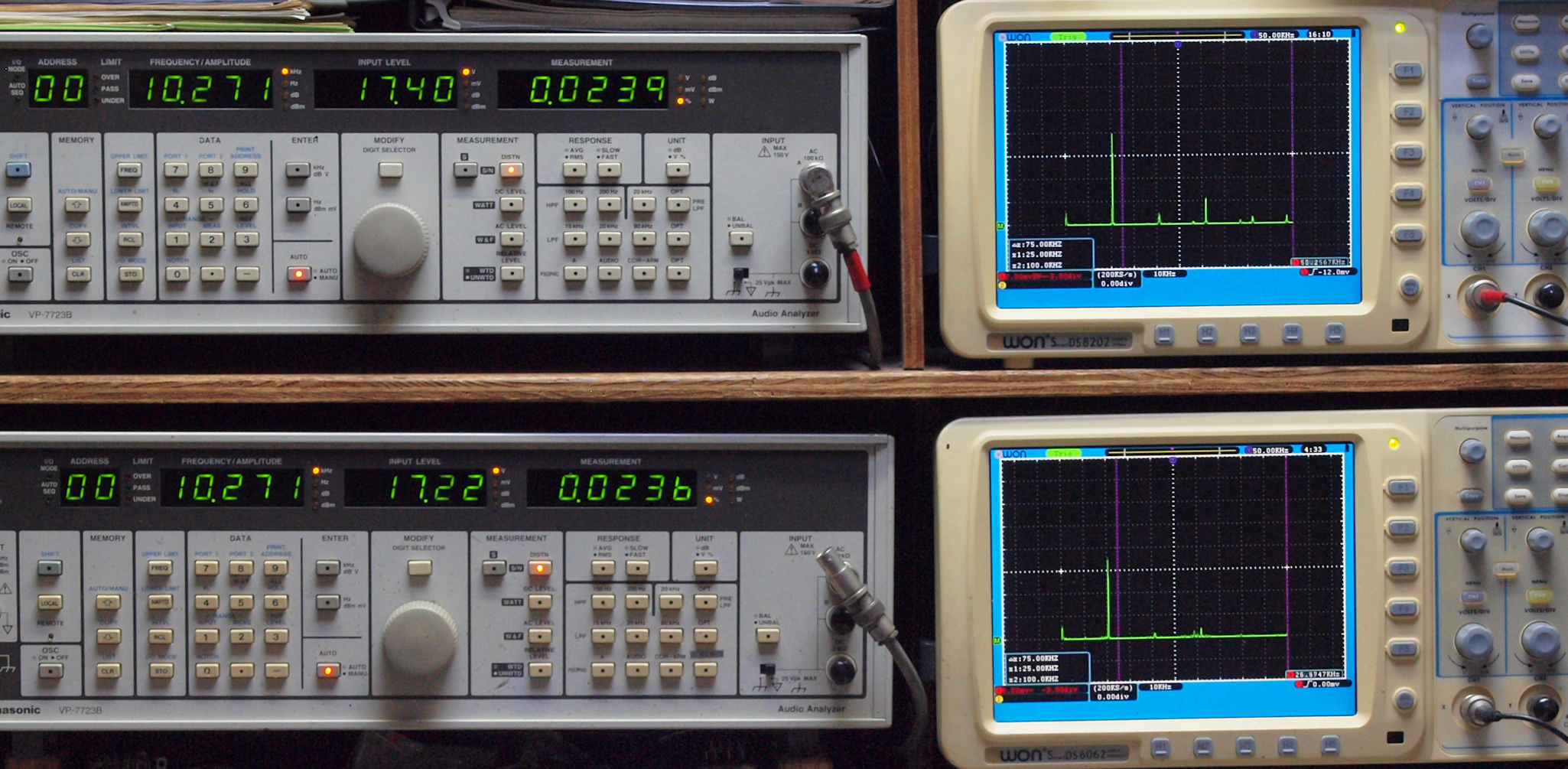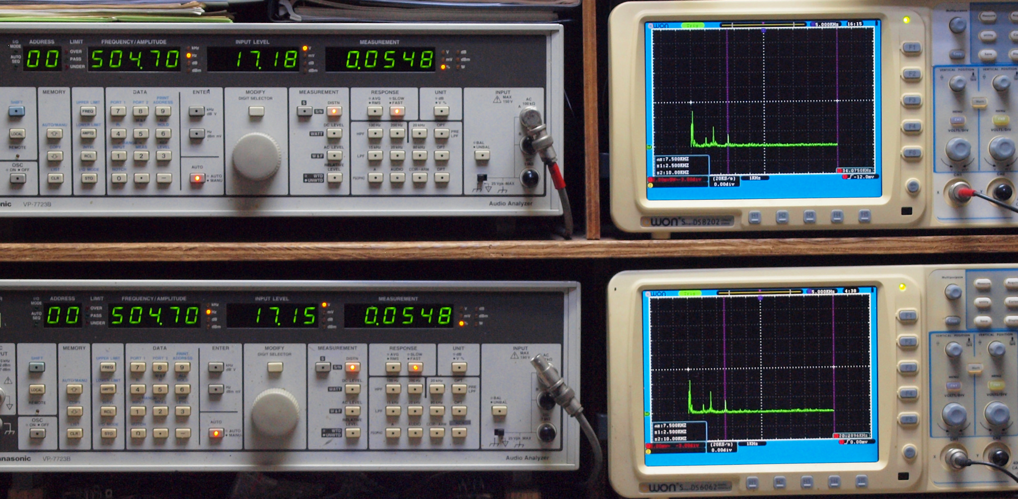 よって、ダイアル設定出力レベルより低くなります。測定機器の仕様や整備の様子はこちら、「VP−7723B」「VP−7201A」。 FFT画面の見方はこちら。